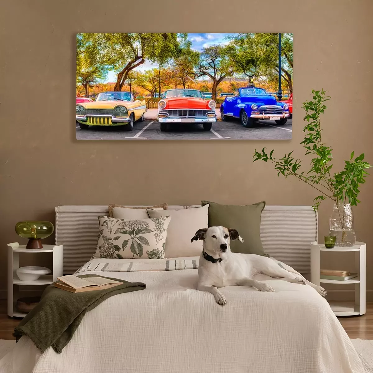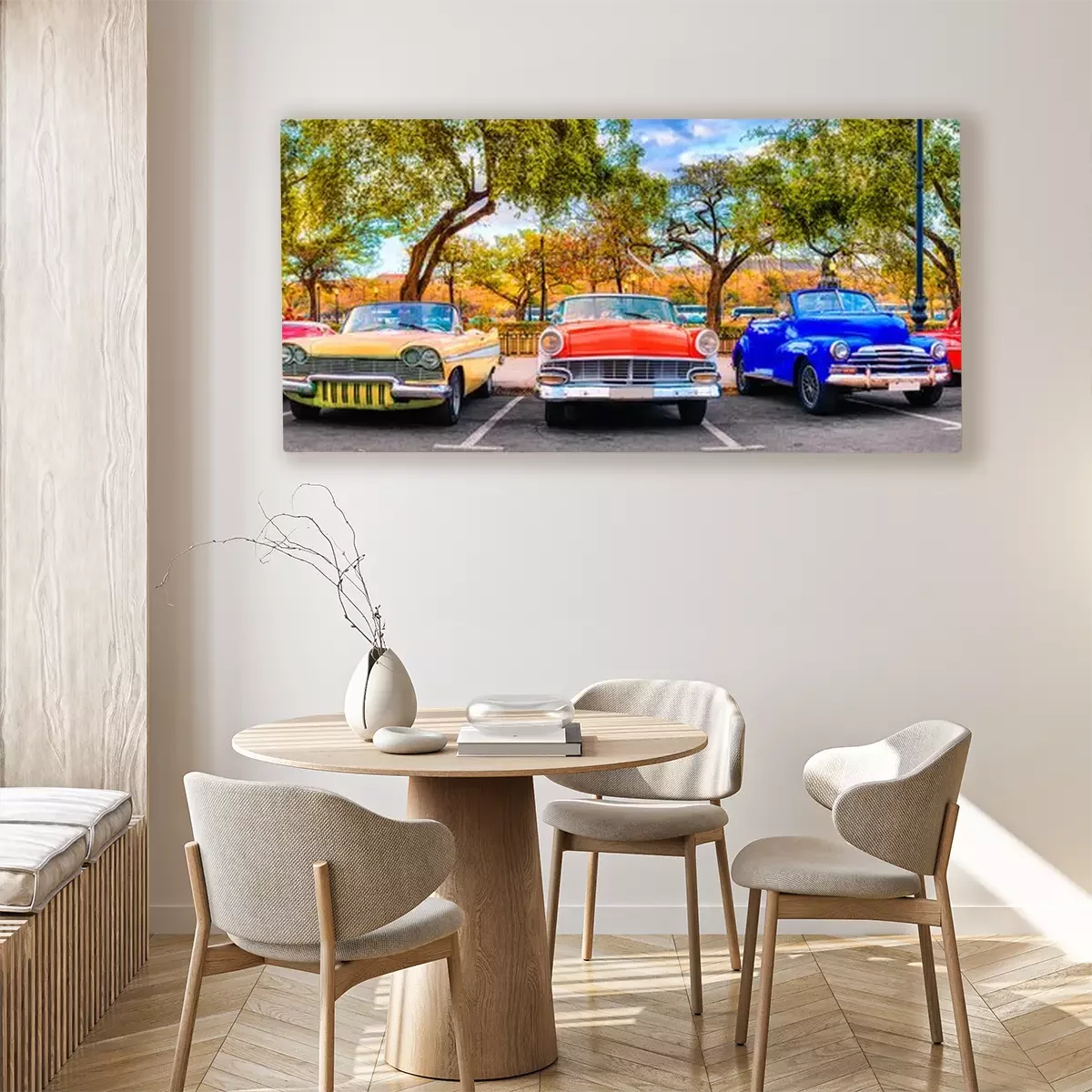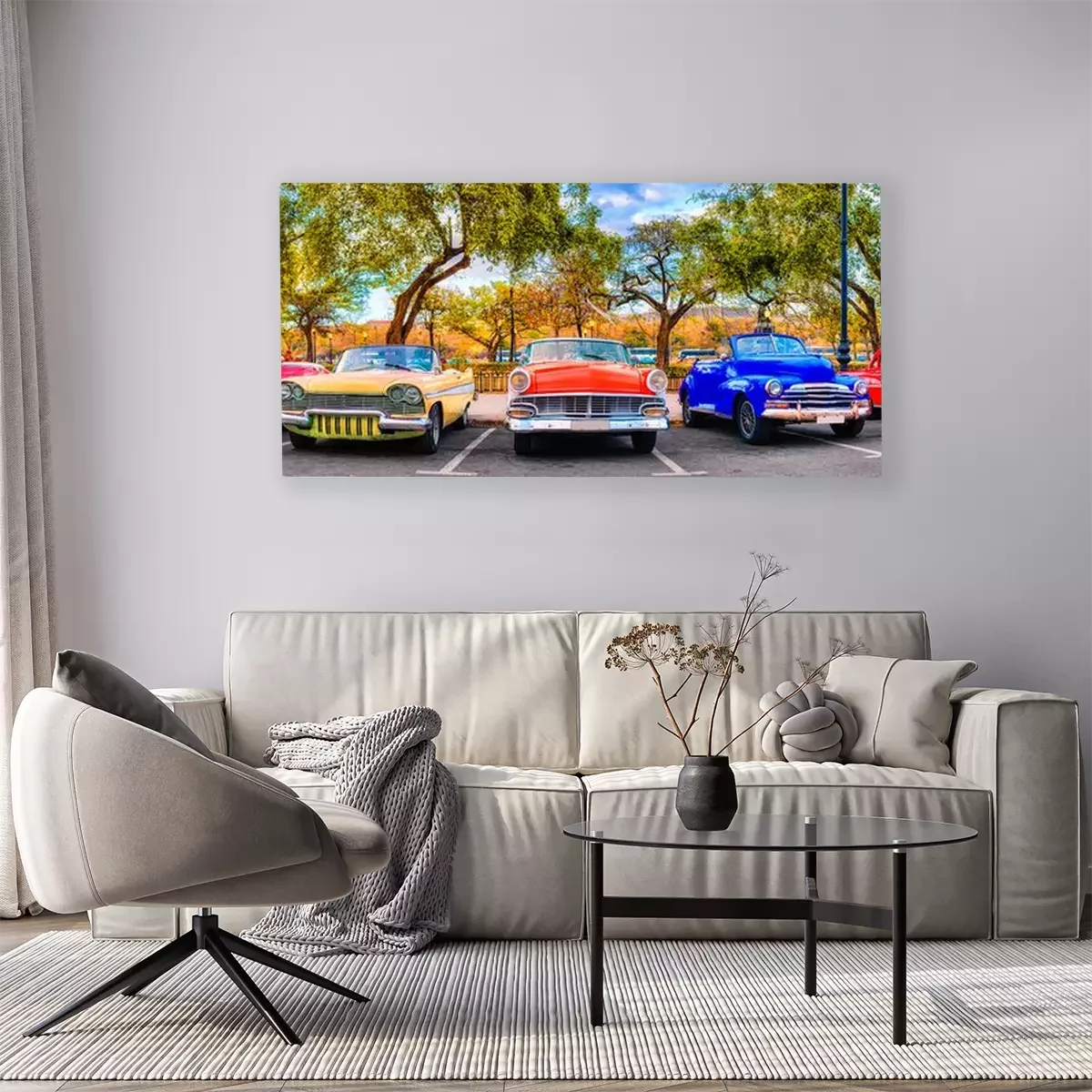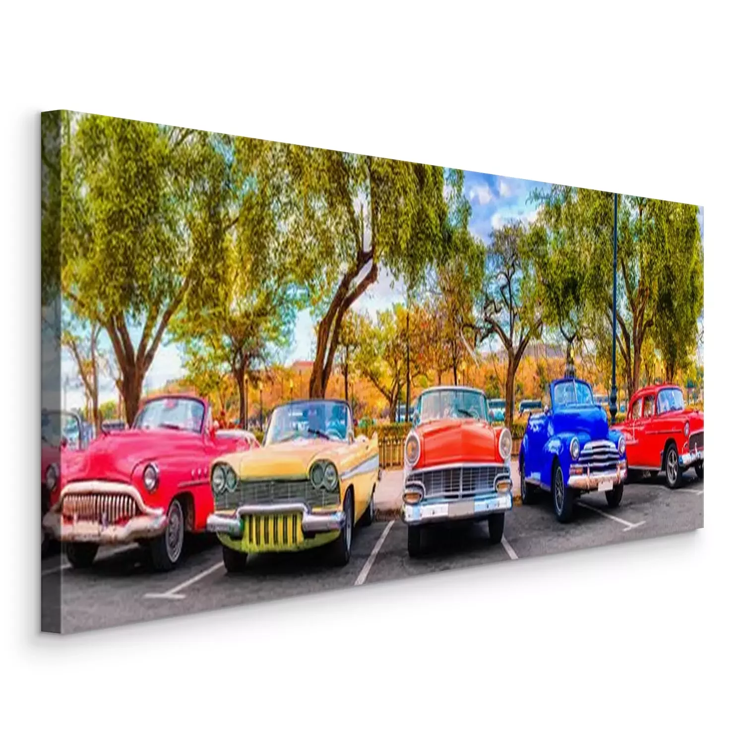 Tableau  Groupe coloré de voitures anciennes dans la Vieille Havane, un spectacle emblématique à Cuba