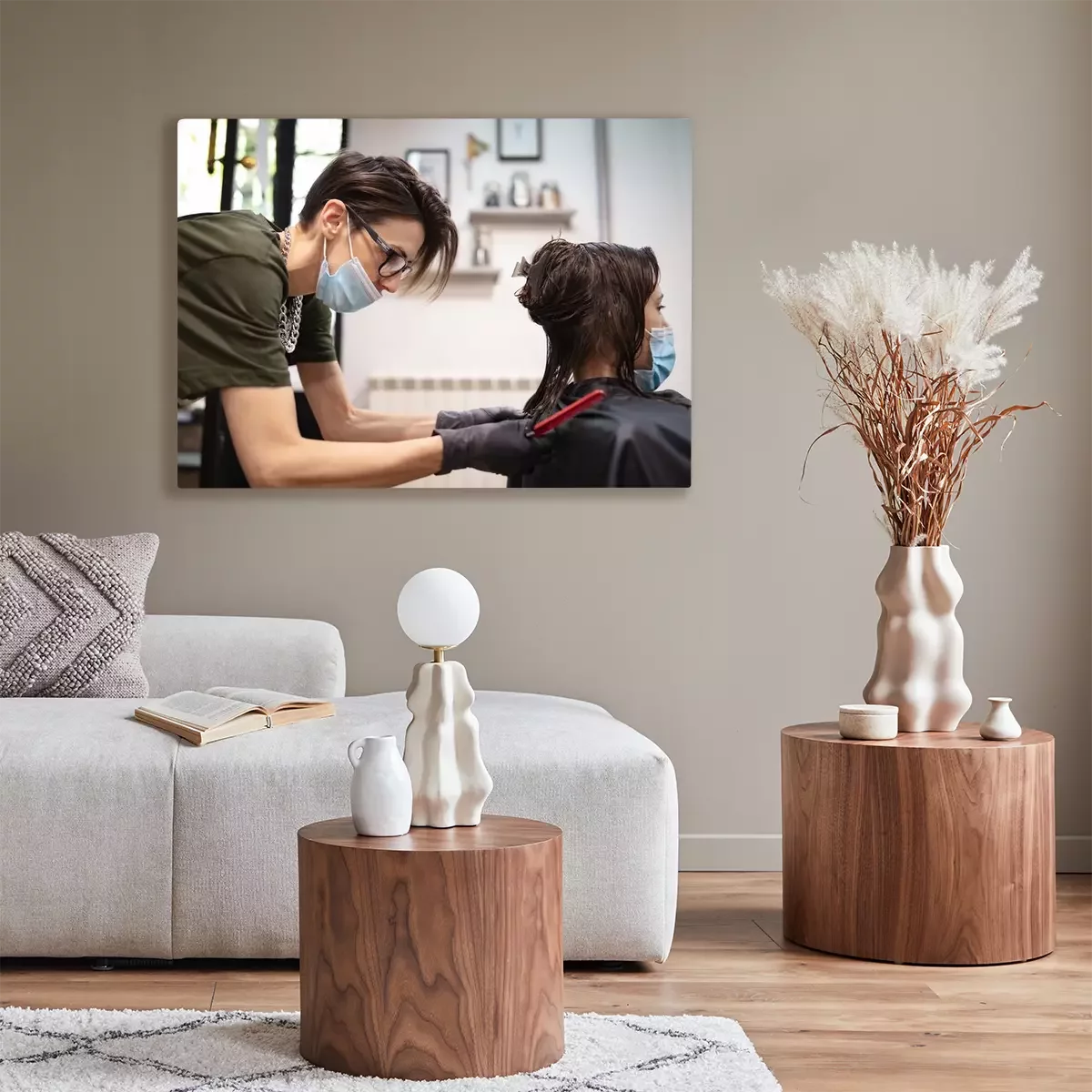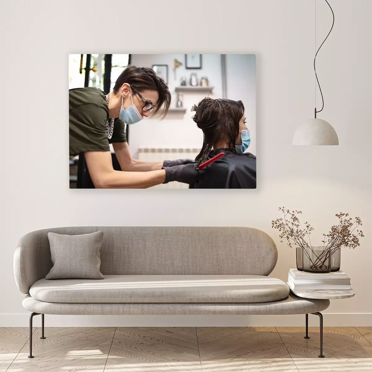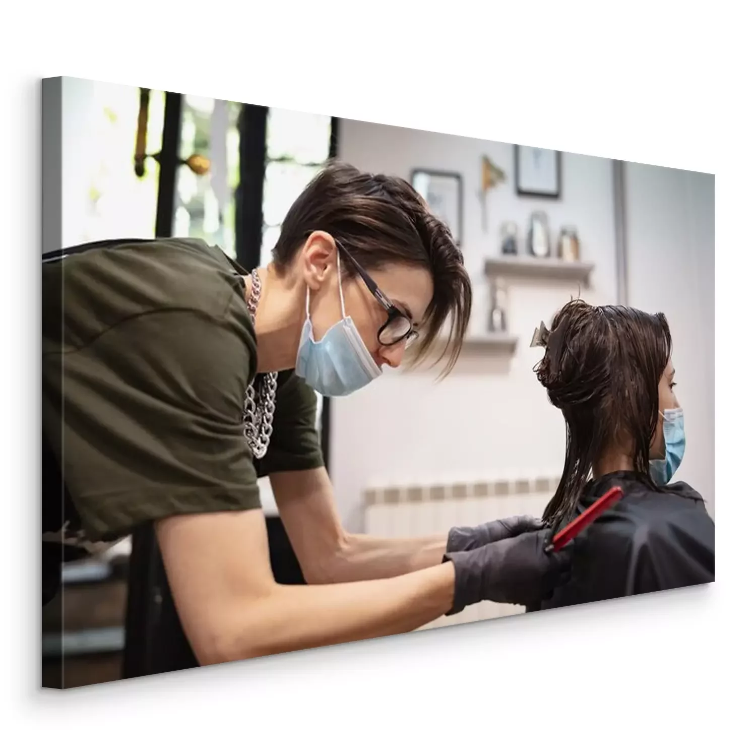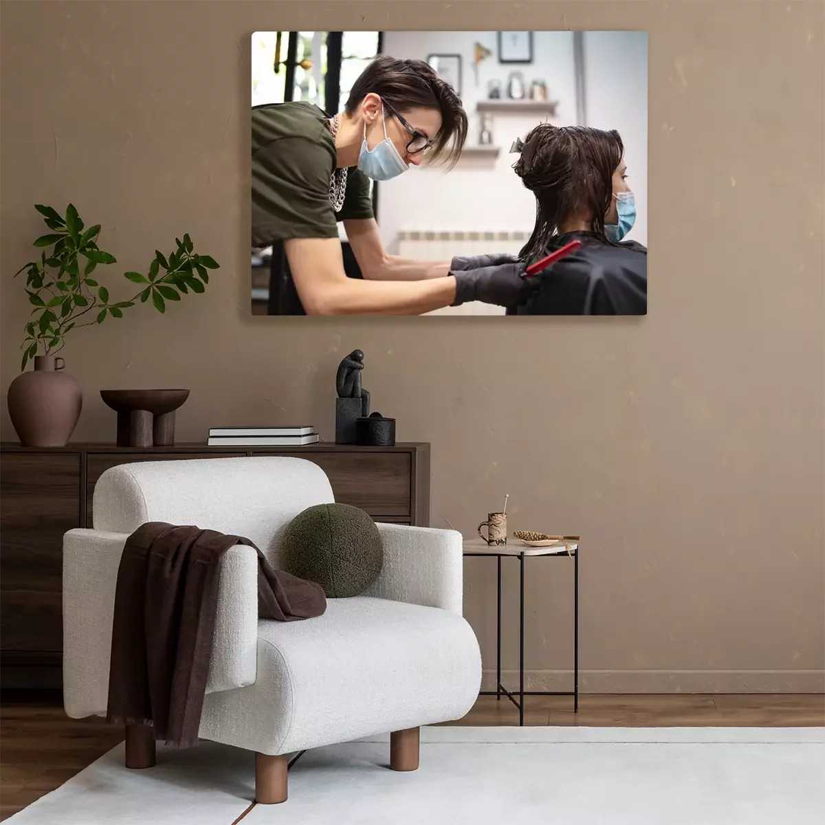 Tableau  Hairdresser and girl child customer in a salon with medical masks during virus pandemic. Working with safety mask.