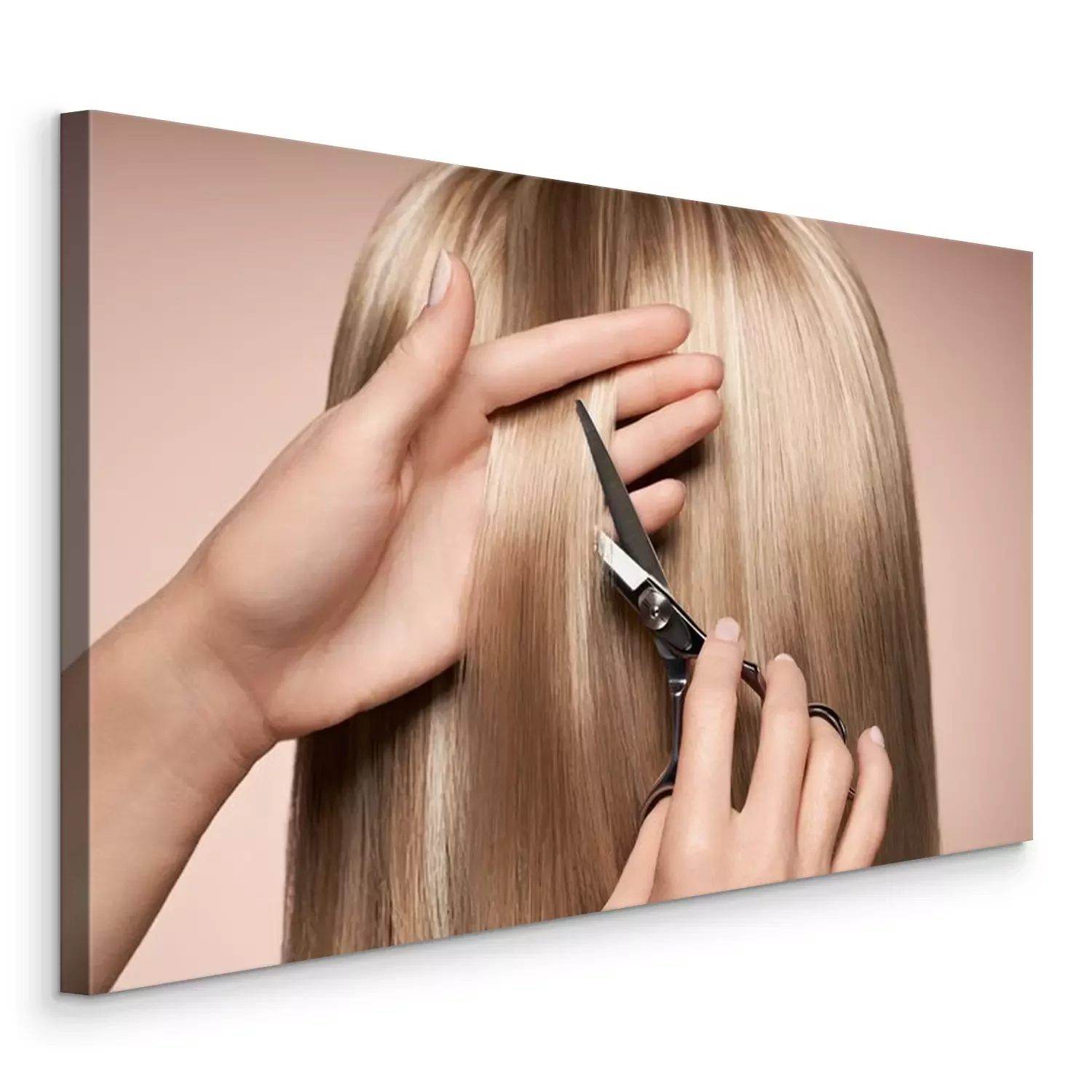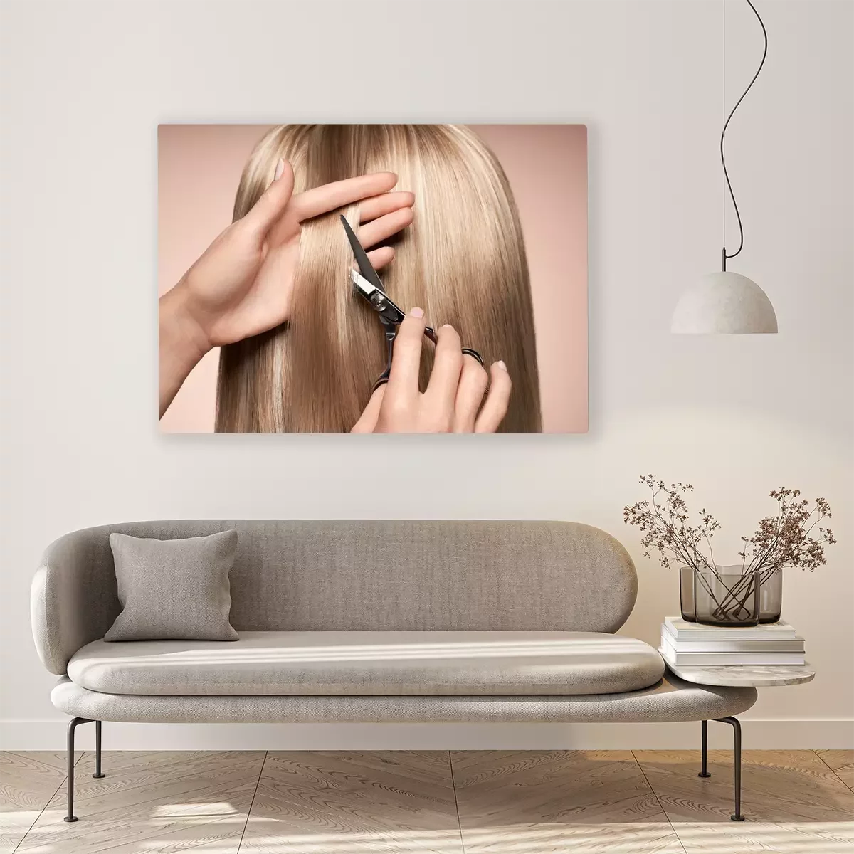 Tableau : Hairdresser cuts long blonde hair with scissors. Hair salon, hairstylist. Care and beauty hair products. Dyed hair