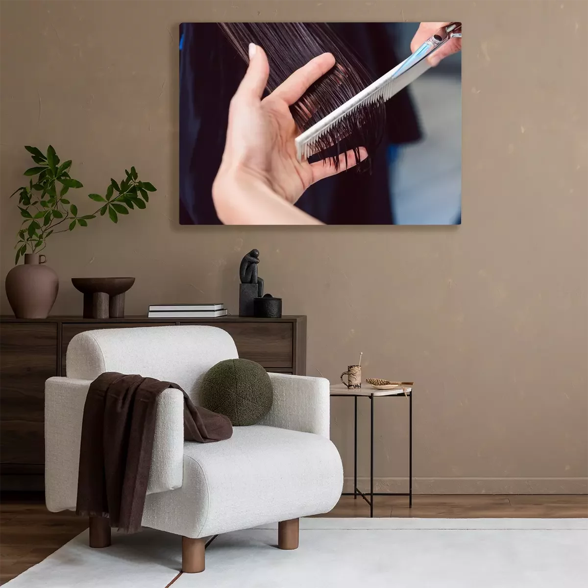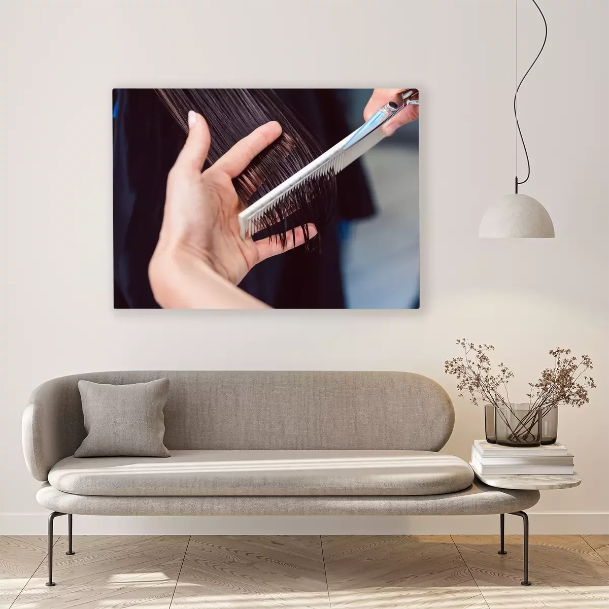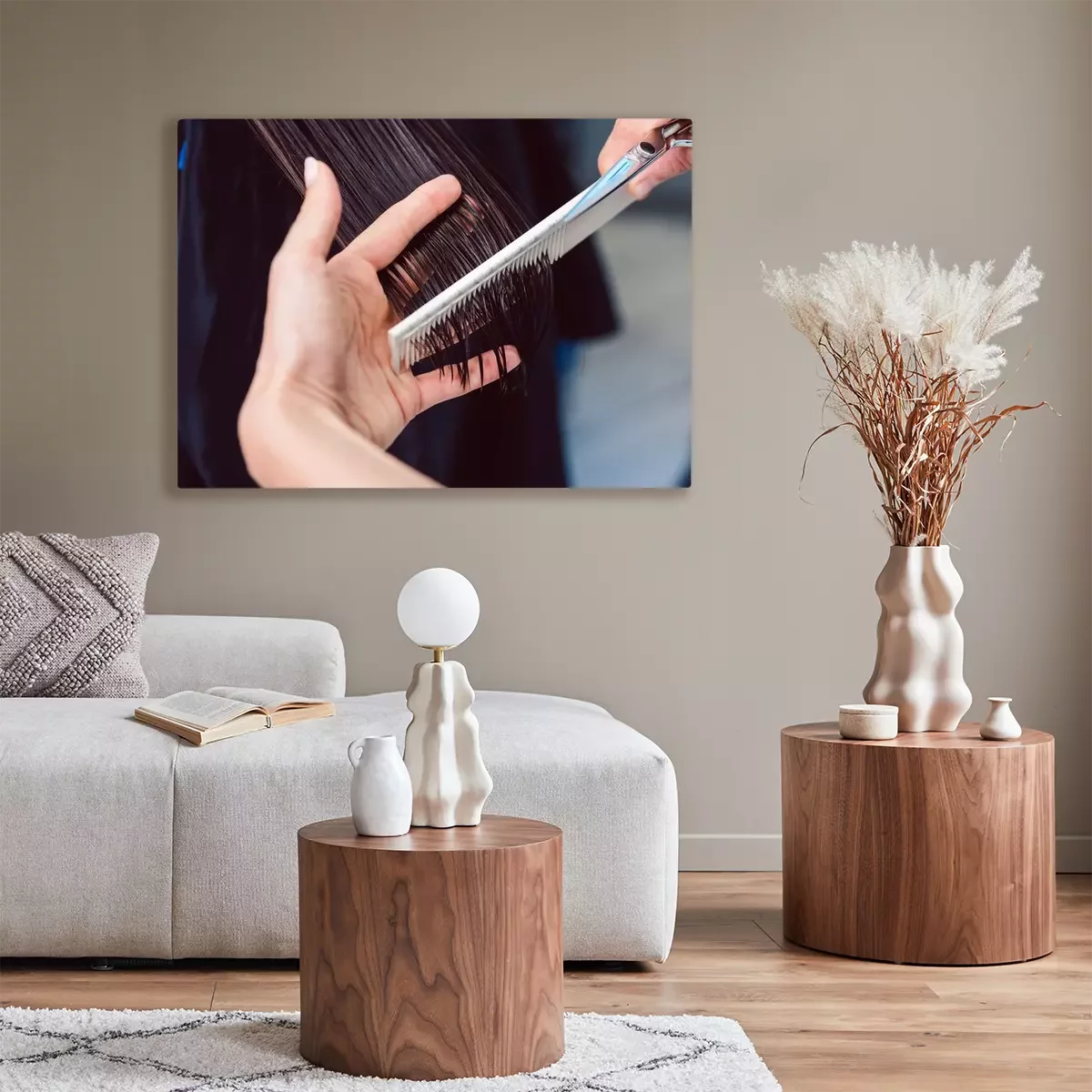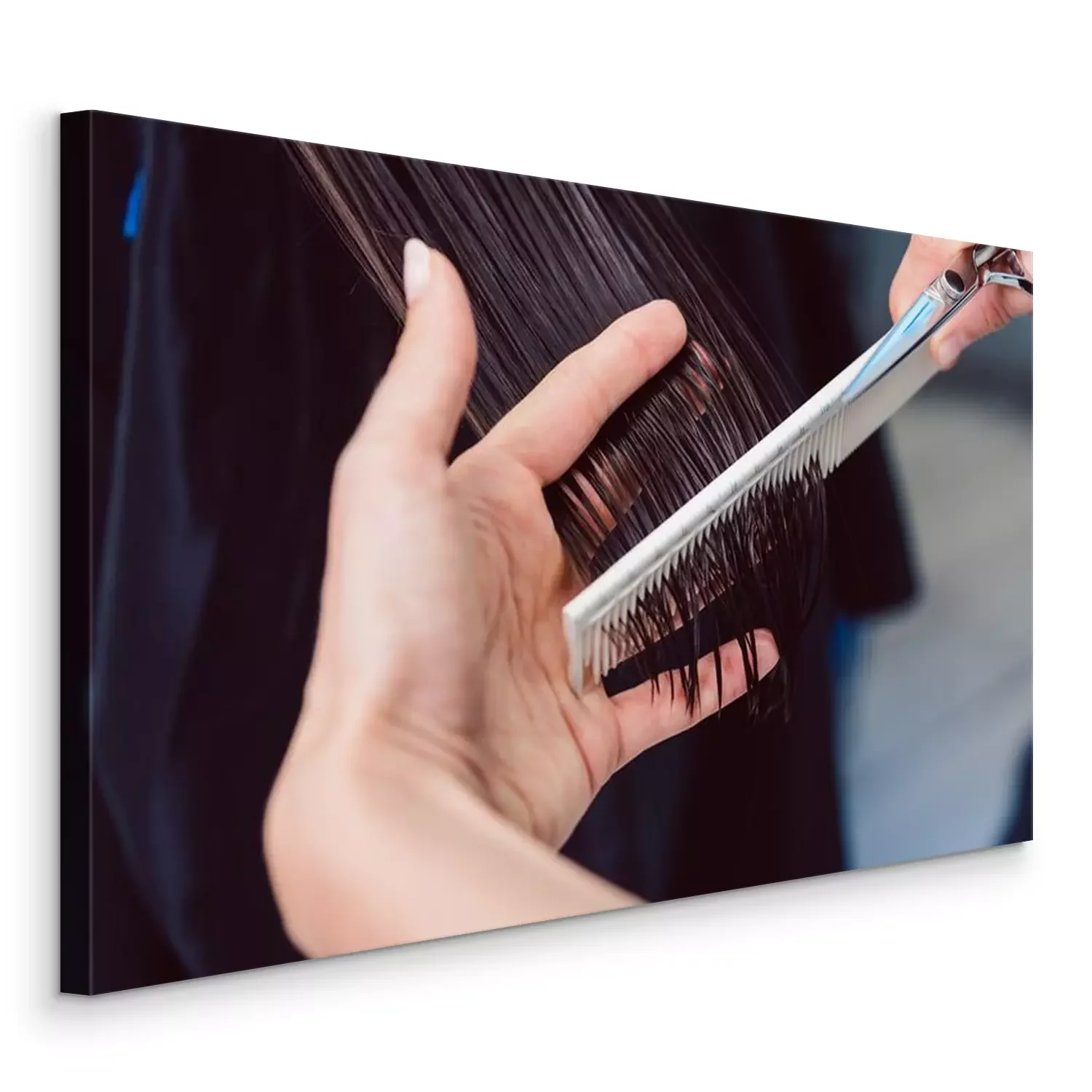 Tableau  Hairdresser cutting and styling hair of woman in her shop