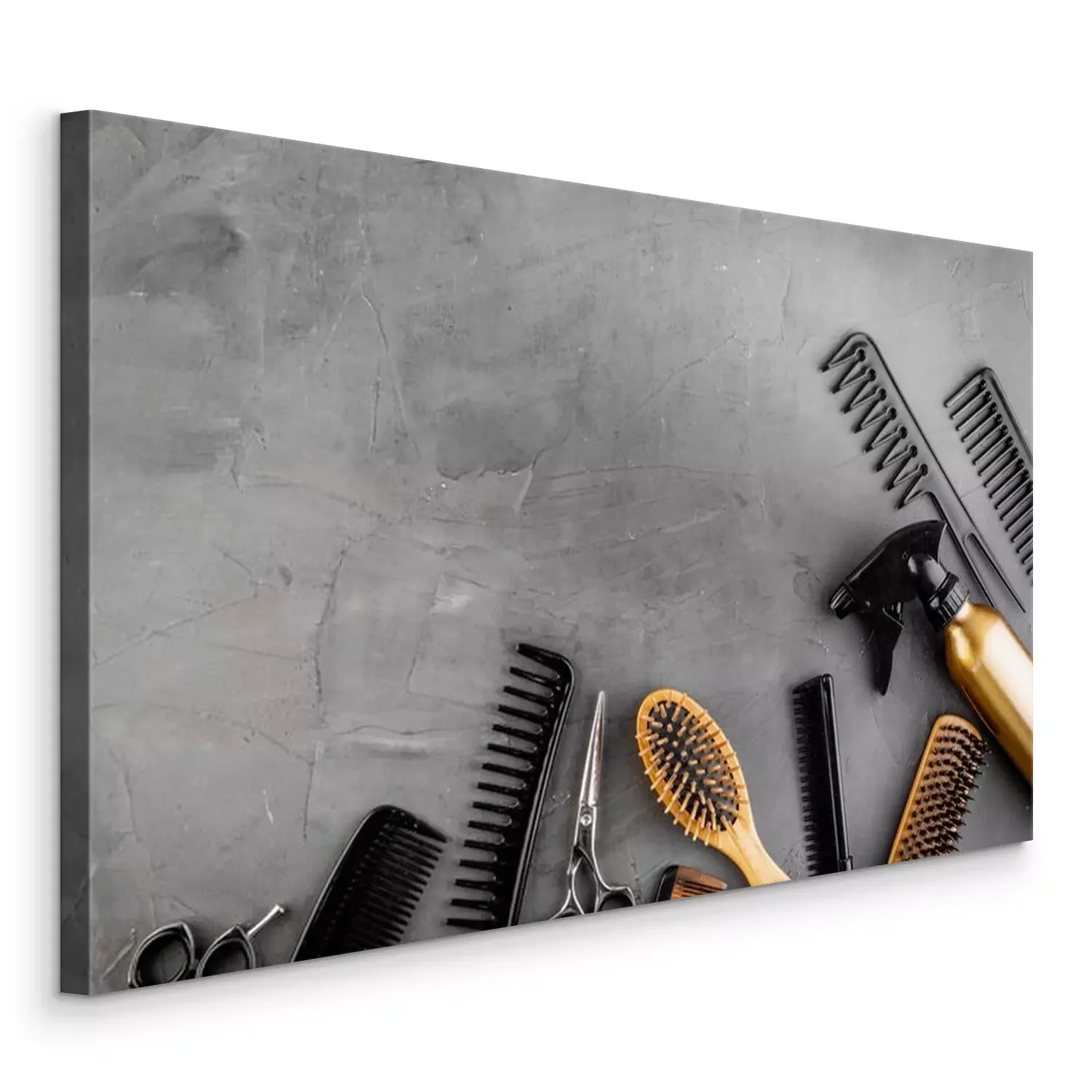 Tableau  Hairdressing instruments. Combs, scissors on grey table top view frame copy space