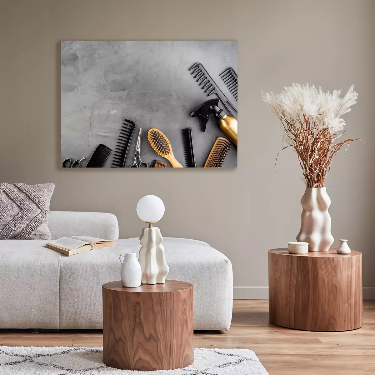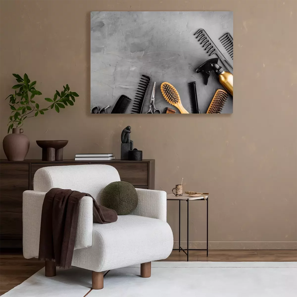 Hairdressing mockup - with brush, spray and sciccors - on beige background top-down frame copy space