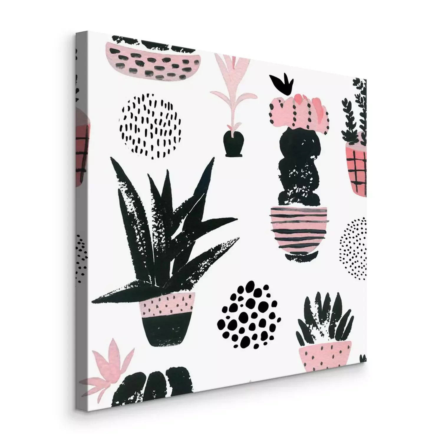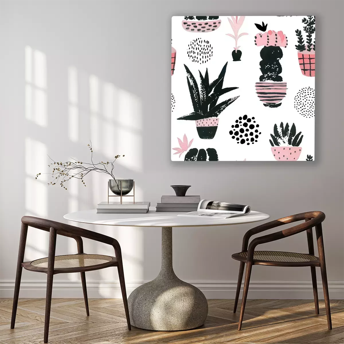 Tableau  Hand painted botanical illustration with watercolor, grunge textures, doodles, pink flowers cactus for home art design in minimal nordic style