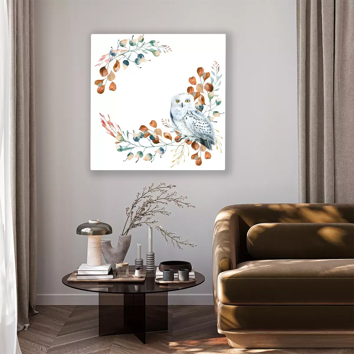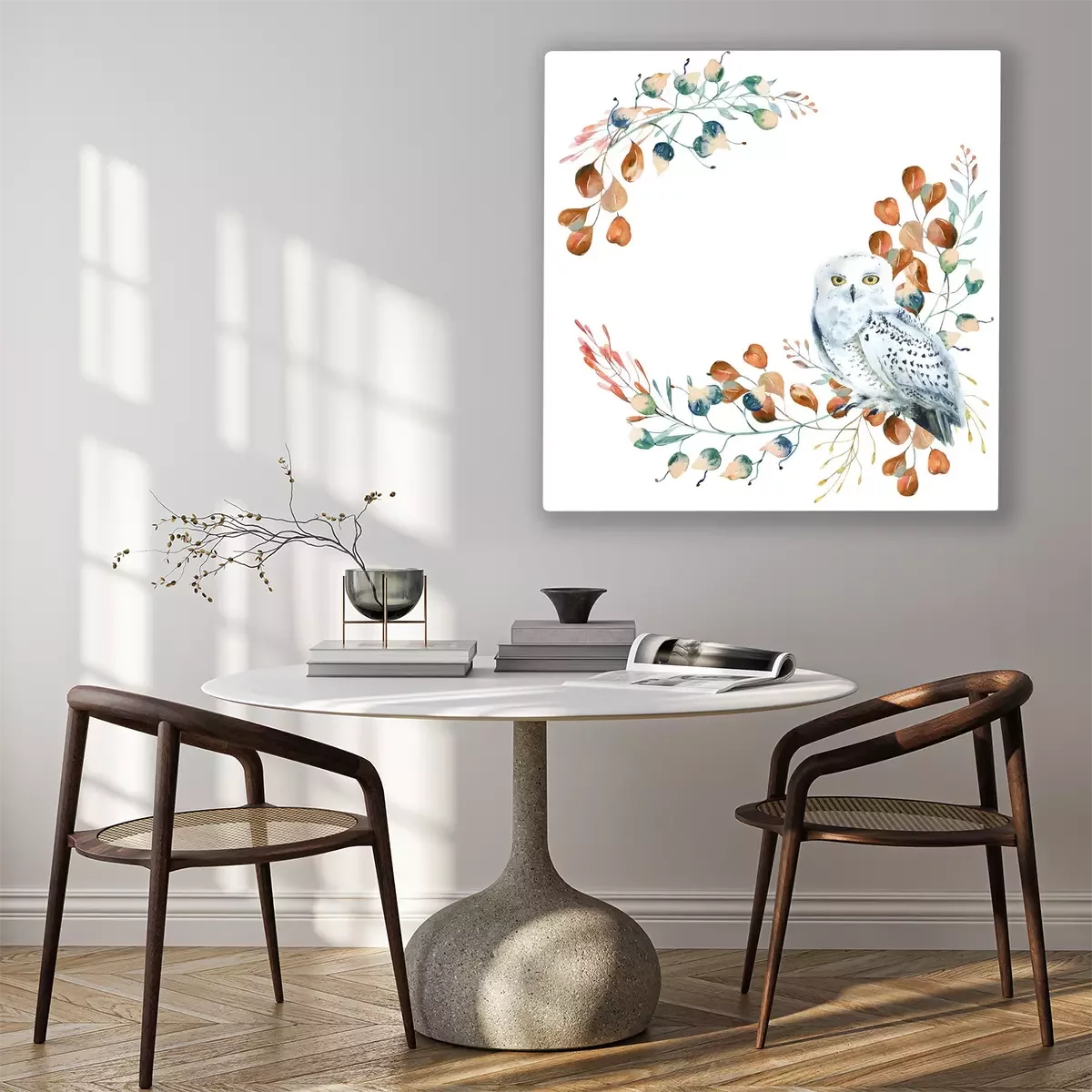 Tableau : Harfang des neiges sur une branche version aquarelle