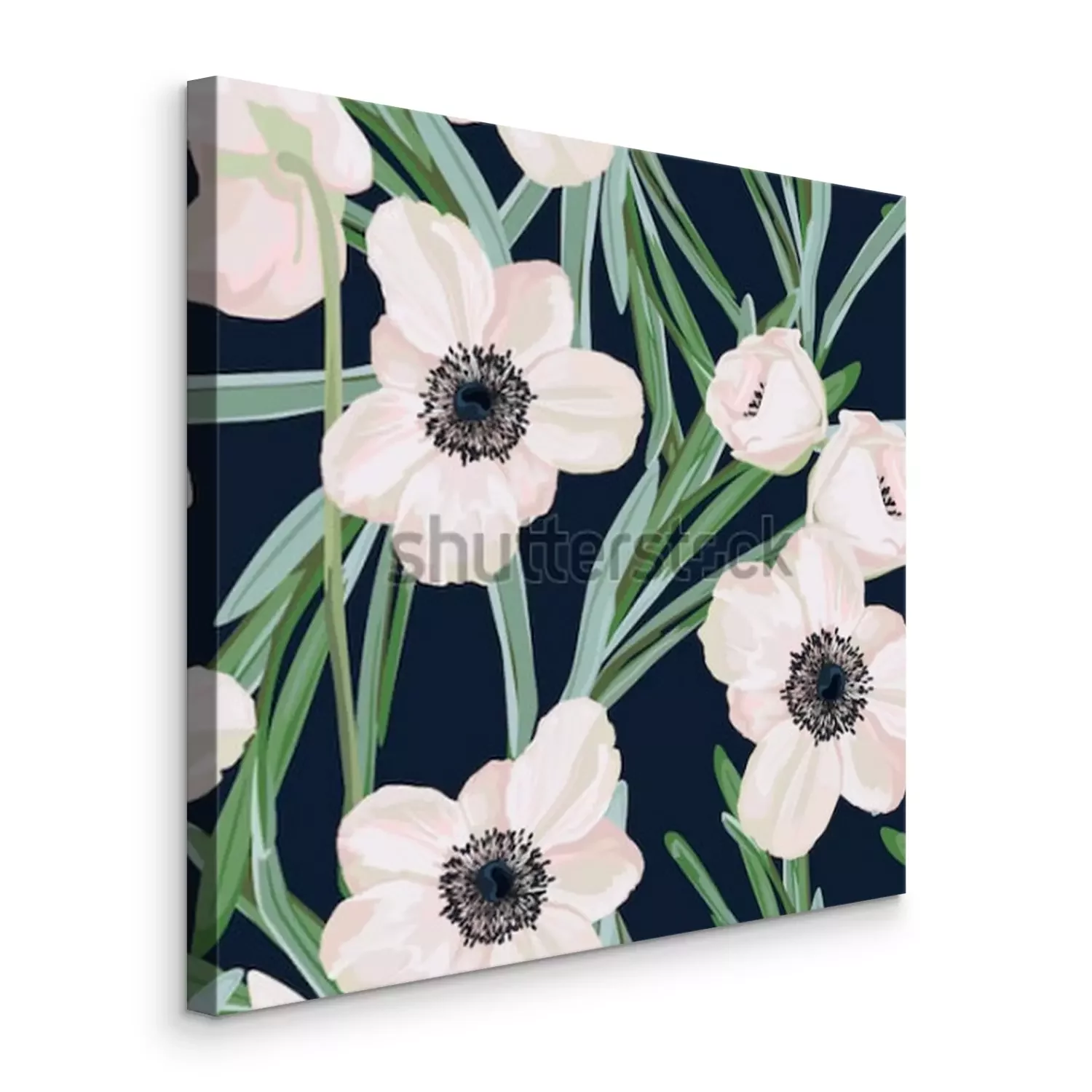 Tableau  Hellebore anemone Christmas winter Rose texture transparente motif floral. Fleurs noires roses avec feuillage vert feuilles sur fond bleu marine foncé. Illustration vectorielle botanique. Fond sombre.