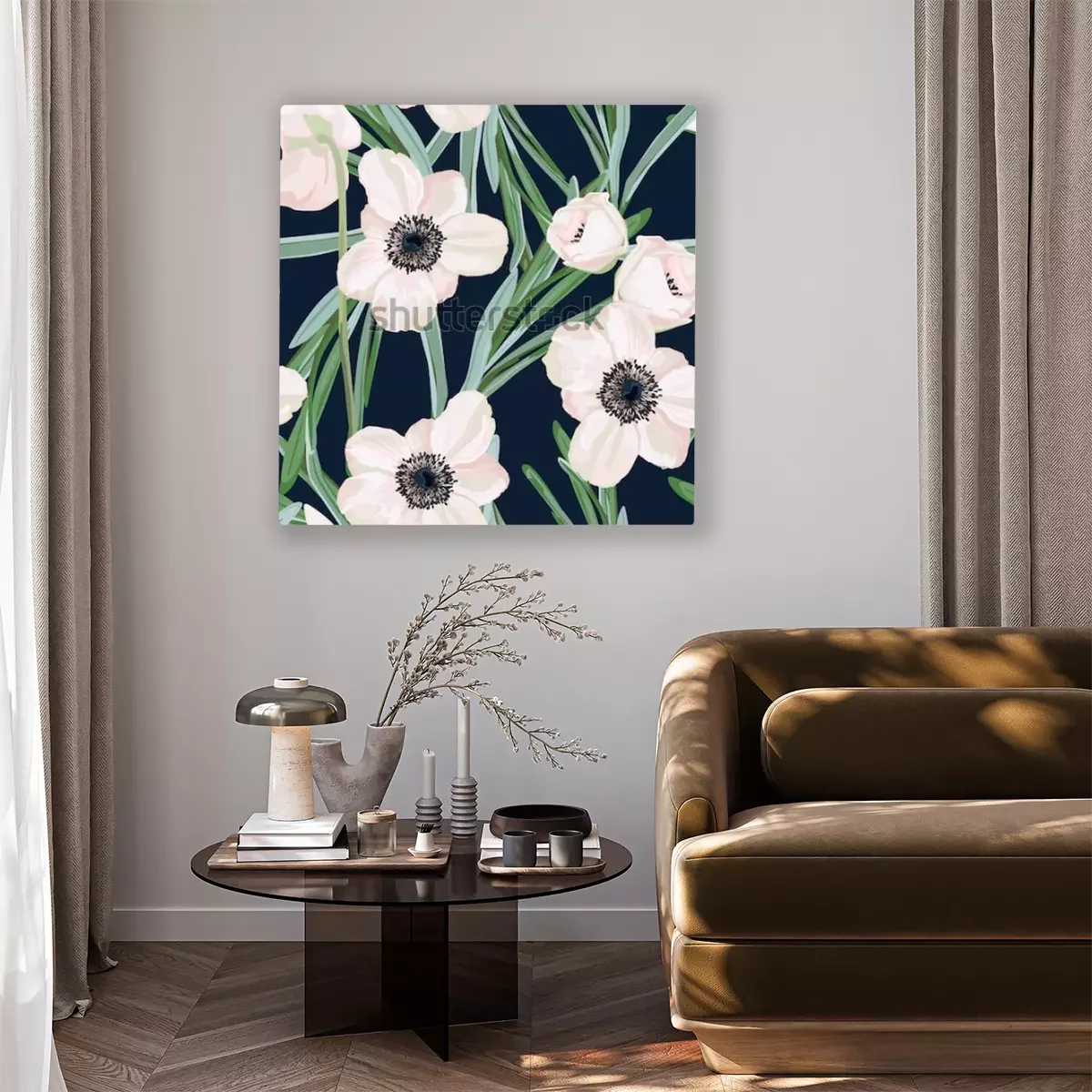 Tableau : Hellebore anemone Christmas winter Rose texture transparente motif floral. Fleurs noires roses avec feuillage vert feuilles sur fond bleu marine foncé. Illustration vectorielle botanique. Fond sombre.