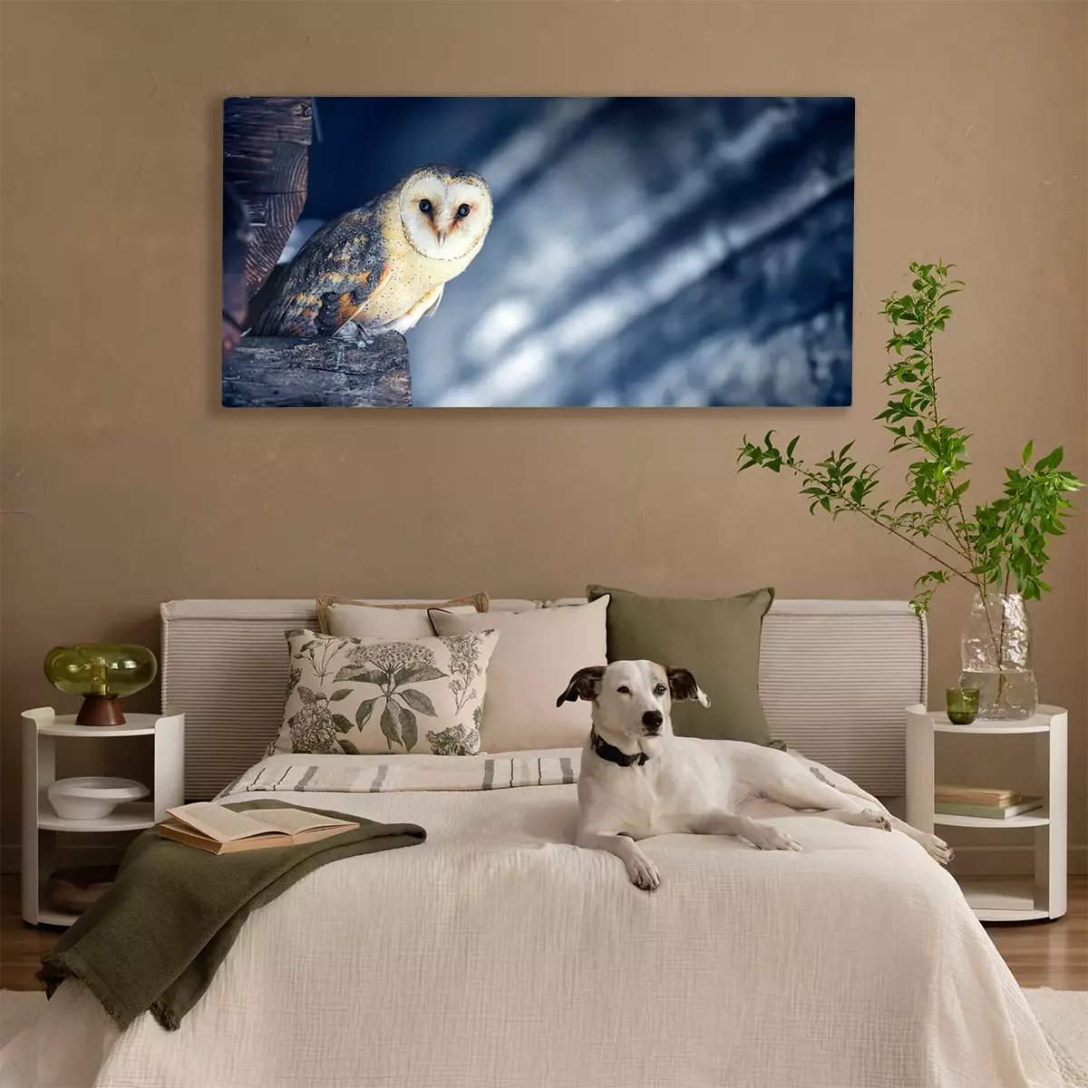 Beautiful flying barn owl bird in dark forest wide banner or panorama photo