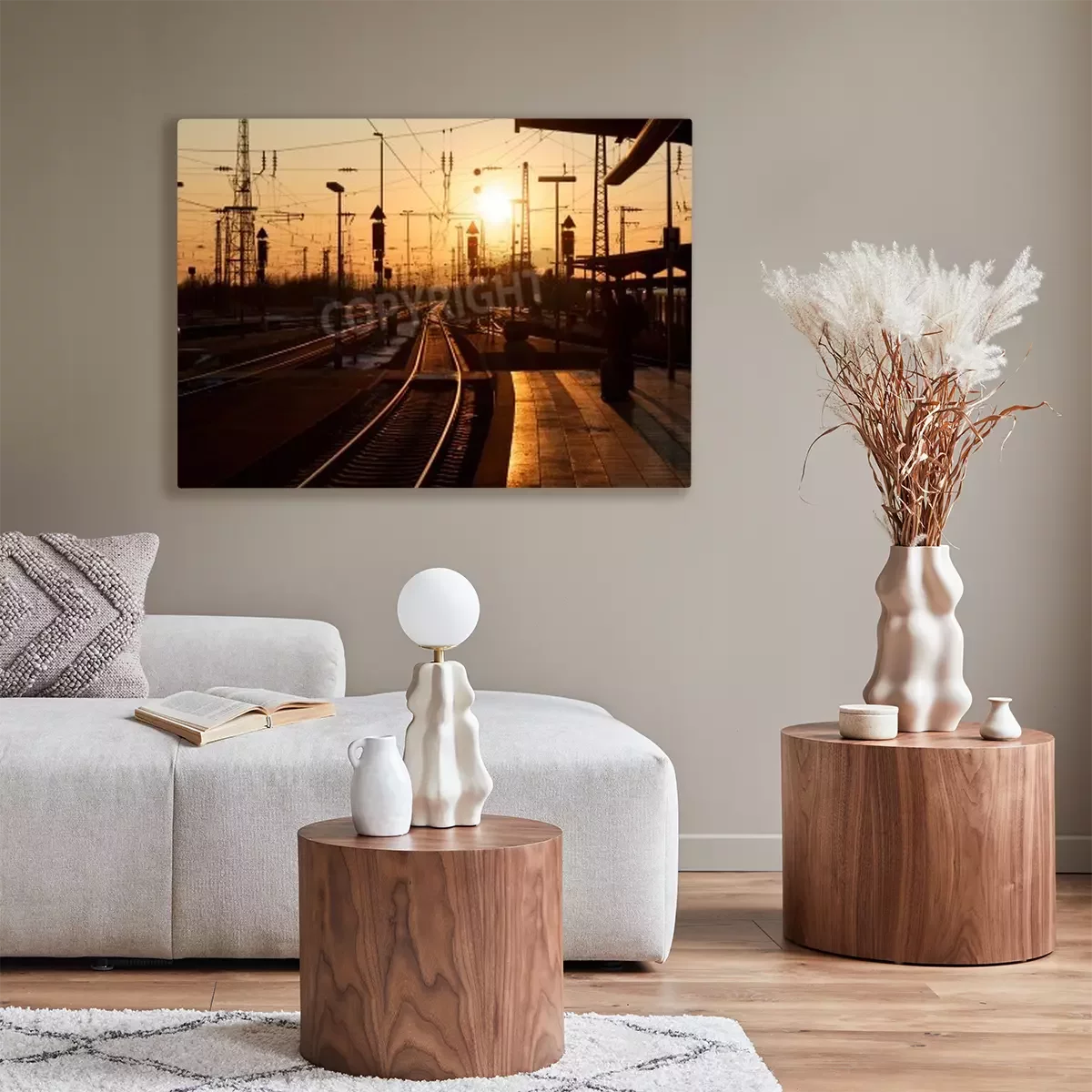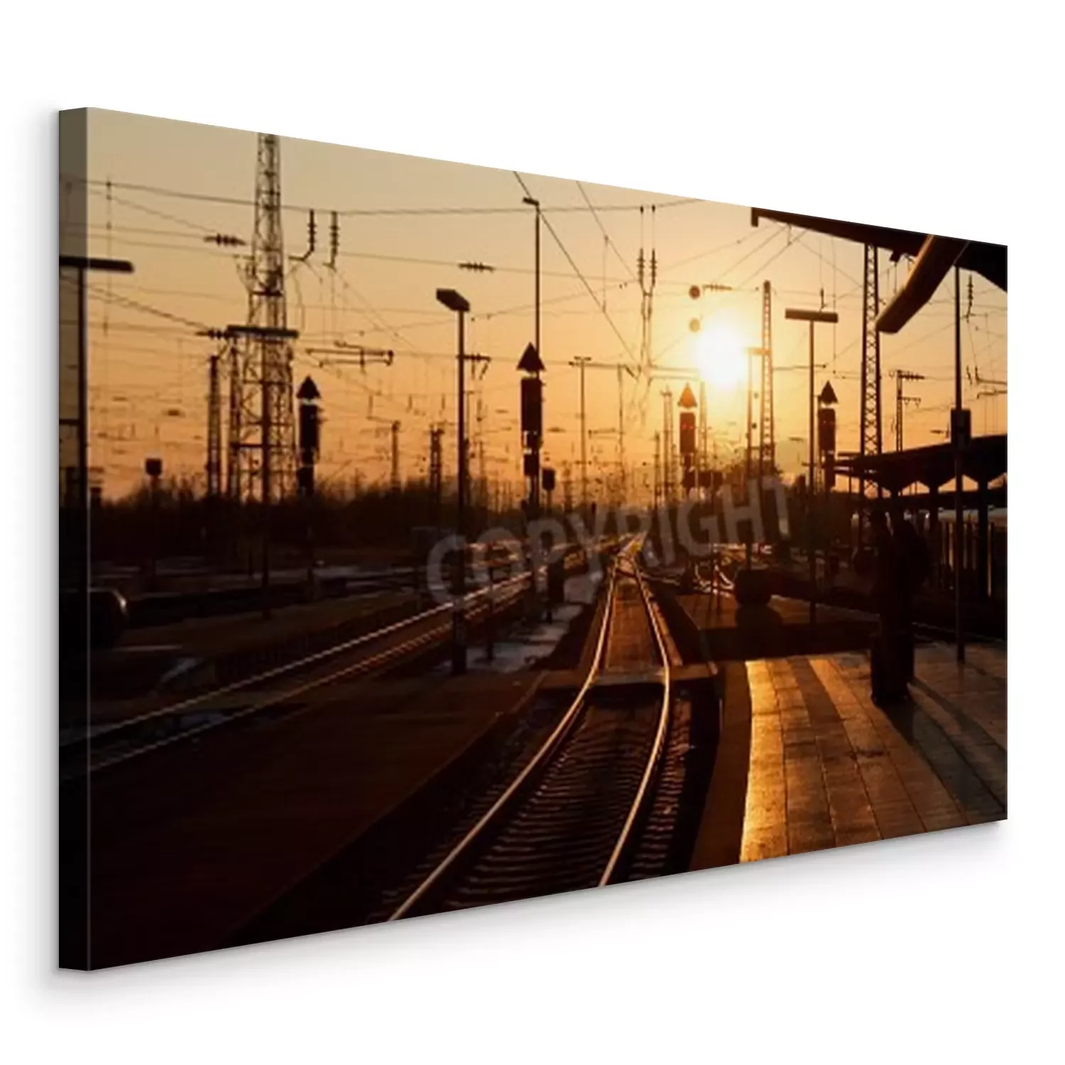 Tableau  Hiver coucher de soleil sur la gare de Karlsruhe avec des personnes en attente d'un train