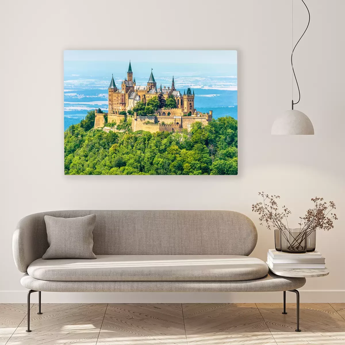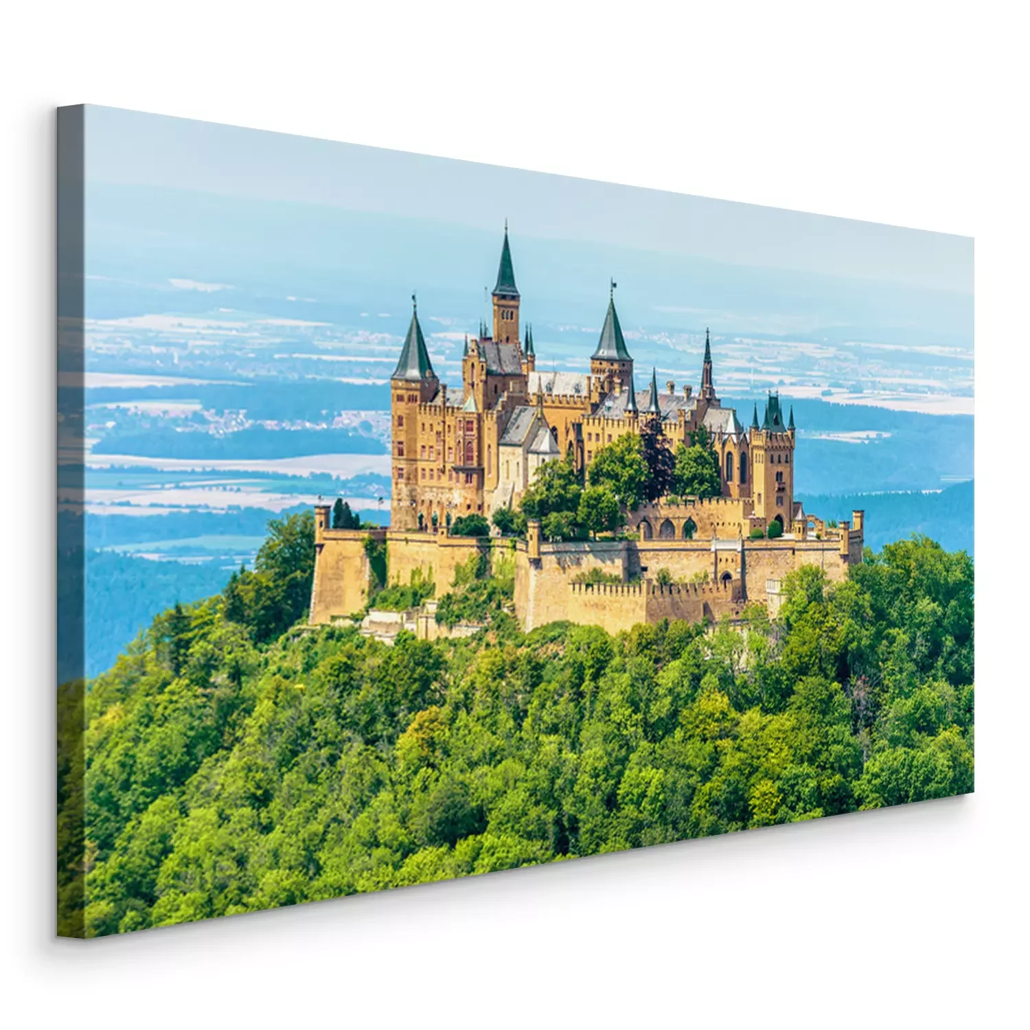 Tableau  Hohenzollern Castle on mountain top, Germany. This castle is a famous landmark in vicinity of Stuttgart. Scenic view of Burg Hohenzollern in summer. Landscape of Swabian Alps with Gothic castle.