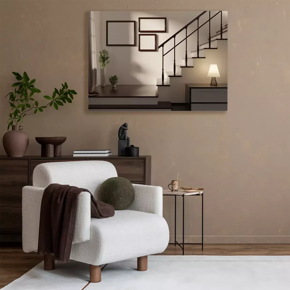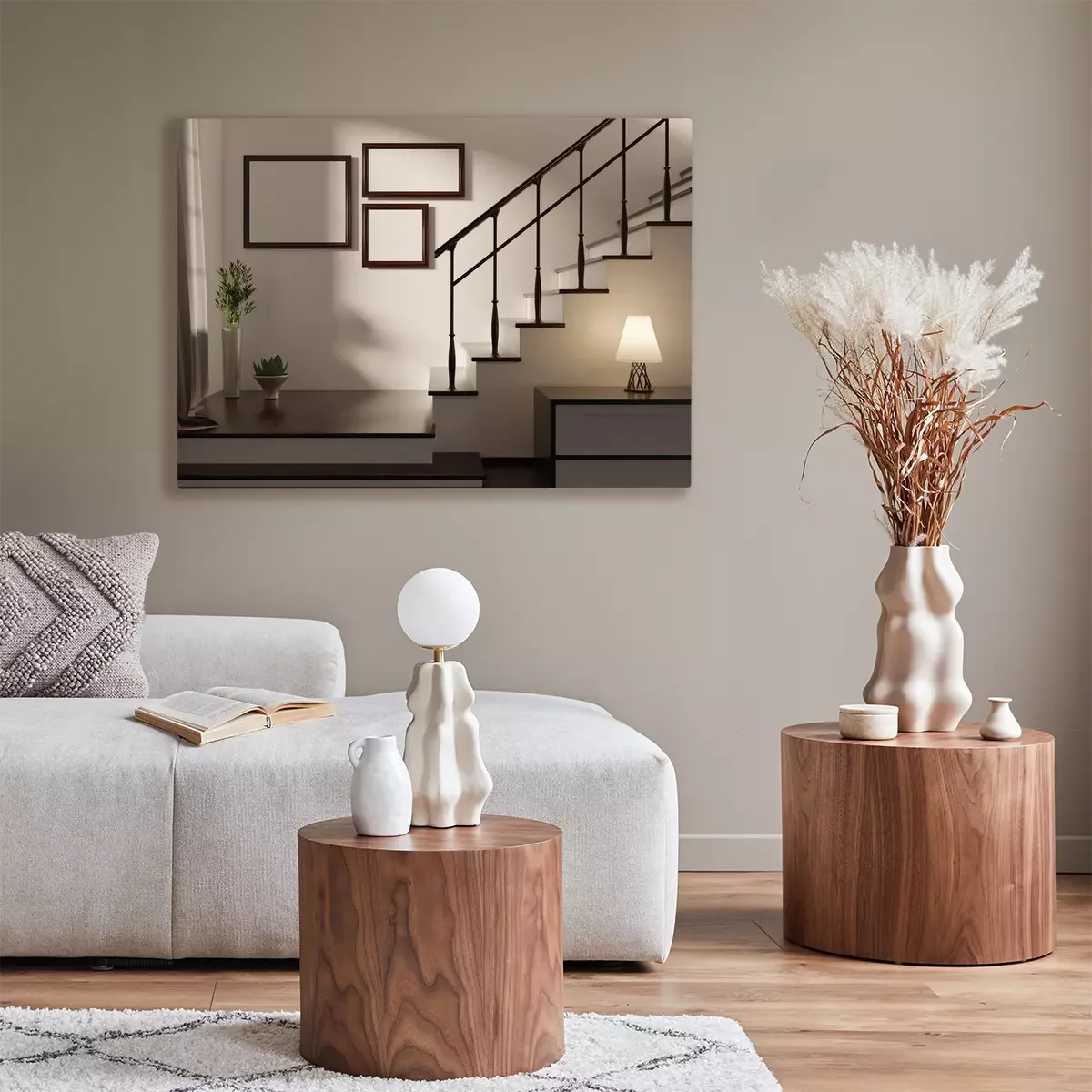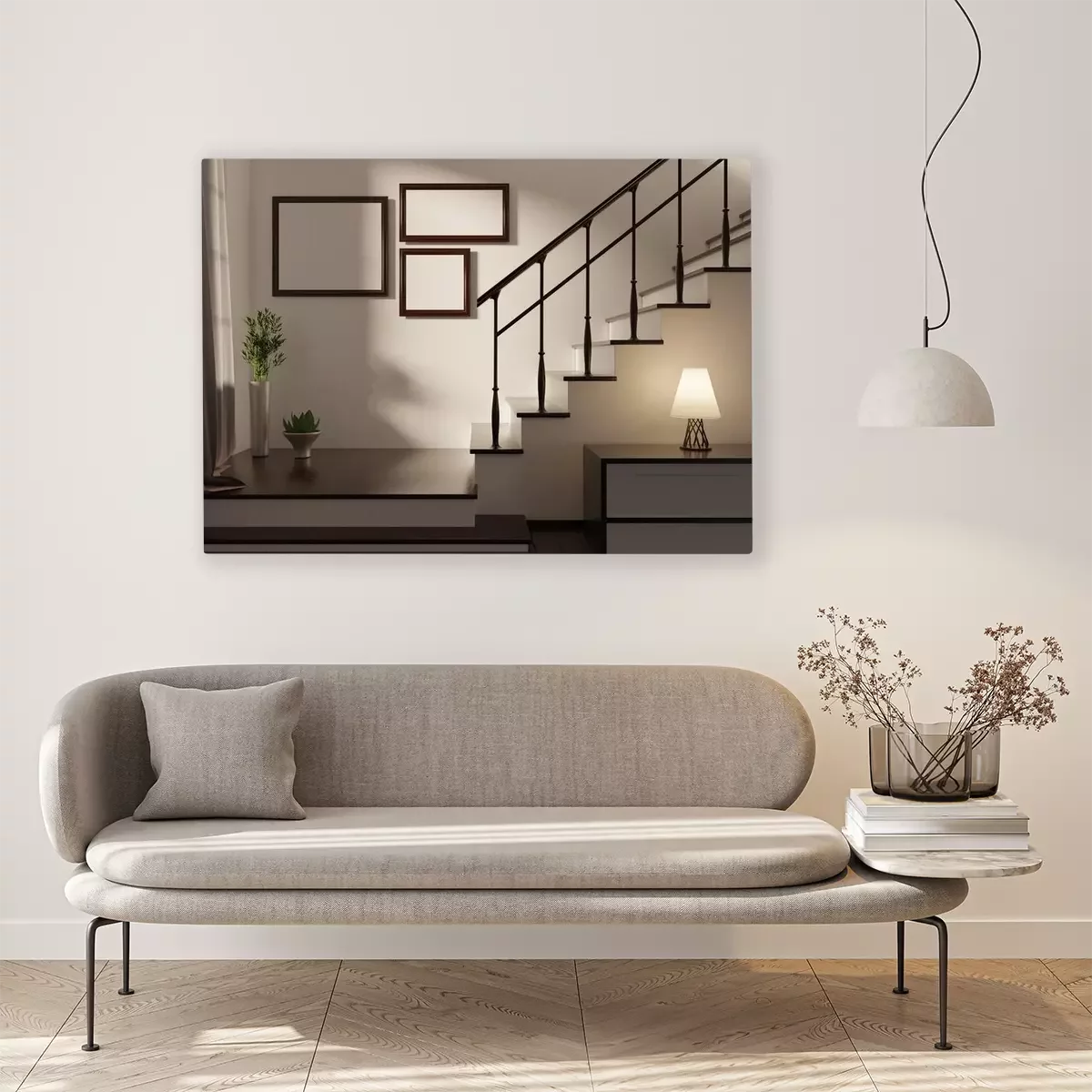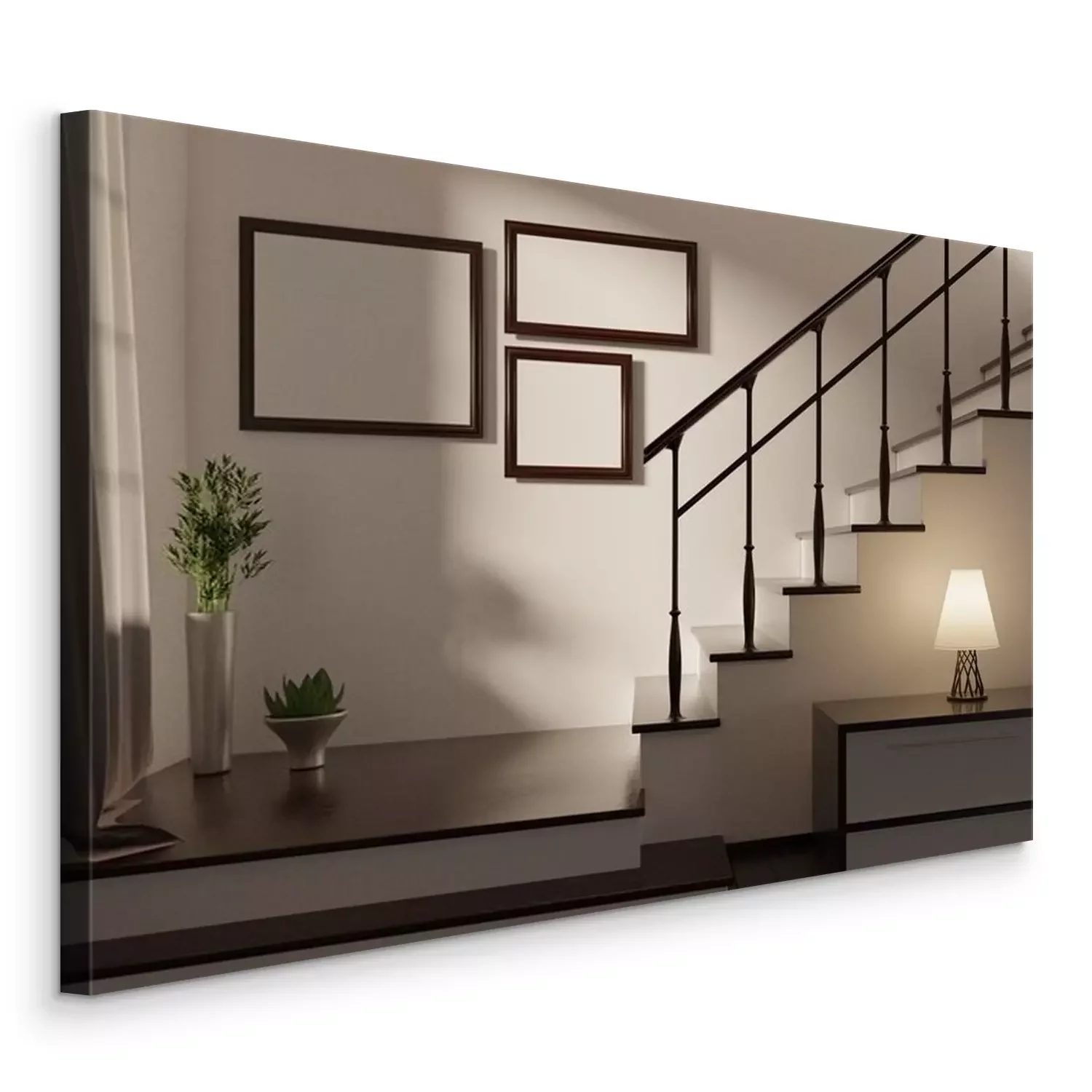 Tableau  Home interior in a Scandinavian style with empty frames on a wall. Stairs to a second floor. Lamp on a table and sun shadows. 3D rendering.