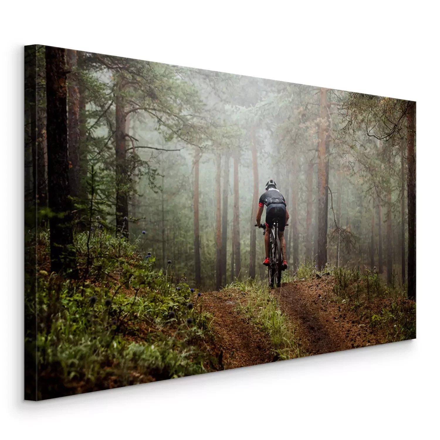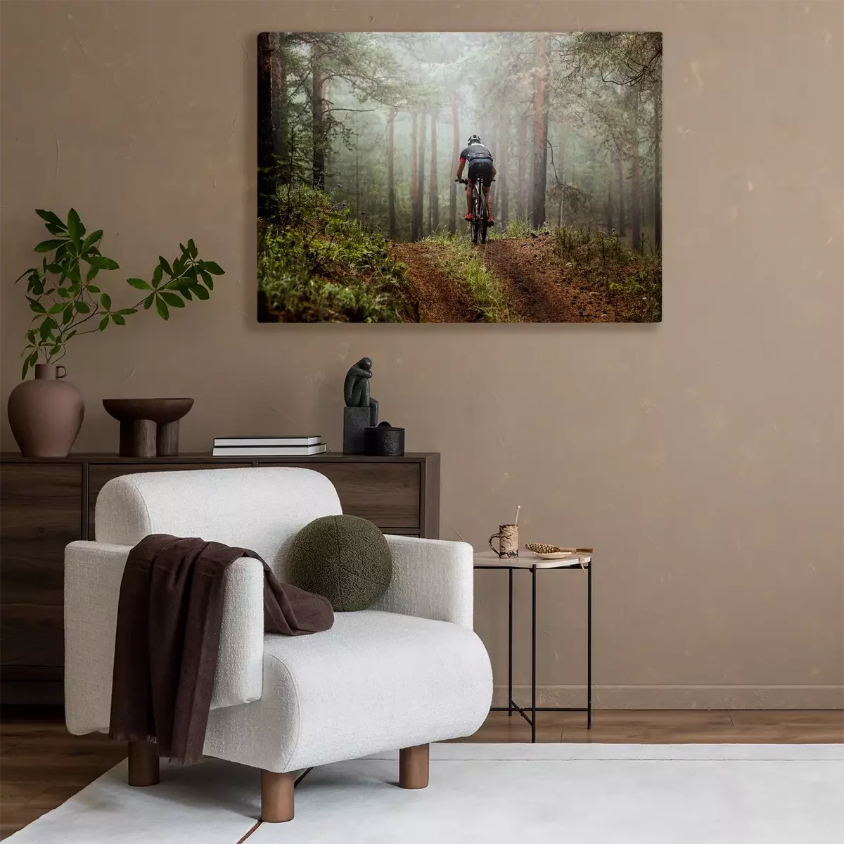 Tableau  Homme, athlète, mountainbiker, tours, bicyclette, long, forêt ... Dans la brume de la forêt, vue mystérieuse