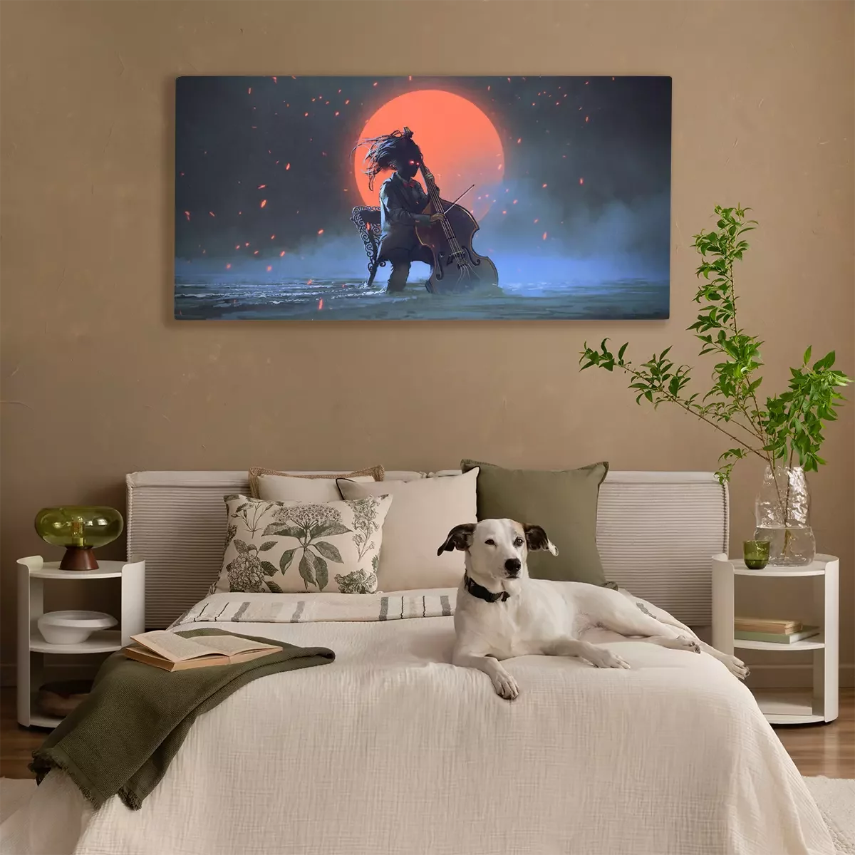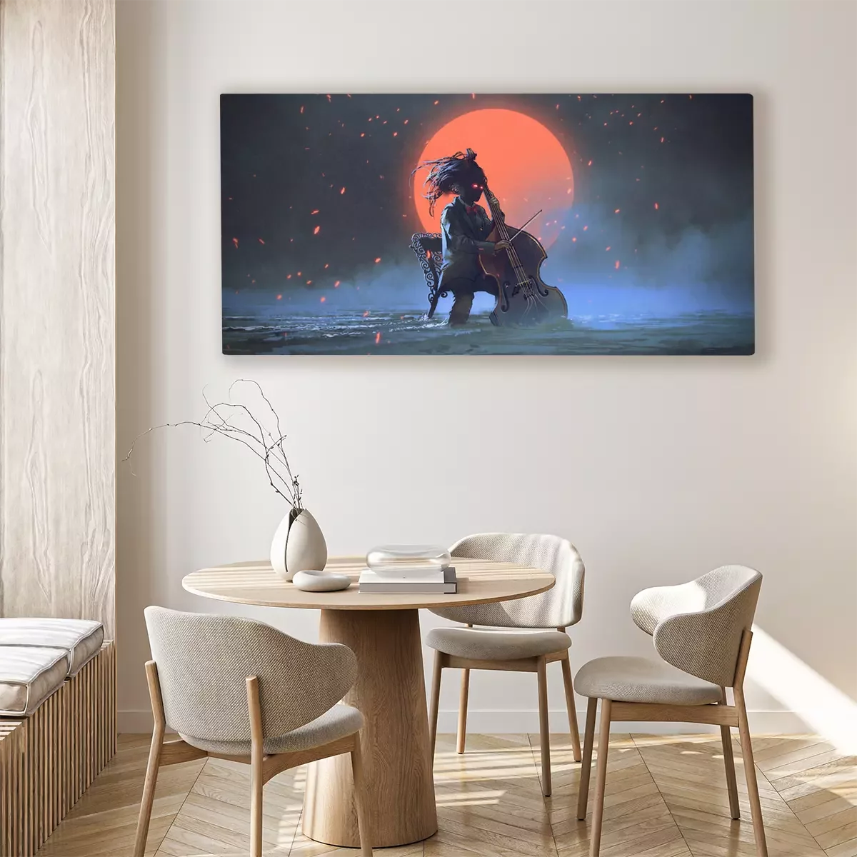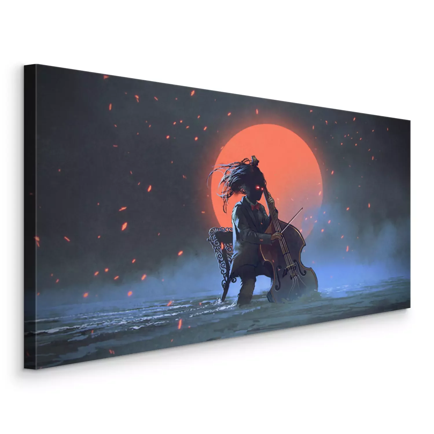 Tableau  homme mystérieux assis sur une chaise jouant du violoncelle dans la mer aginst le ciel nocturne avec la lune rouge, style art numérique, illustration peinture