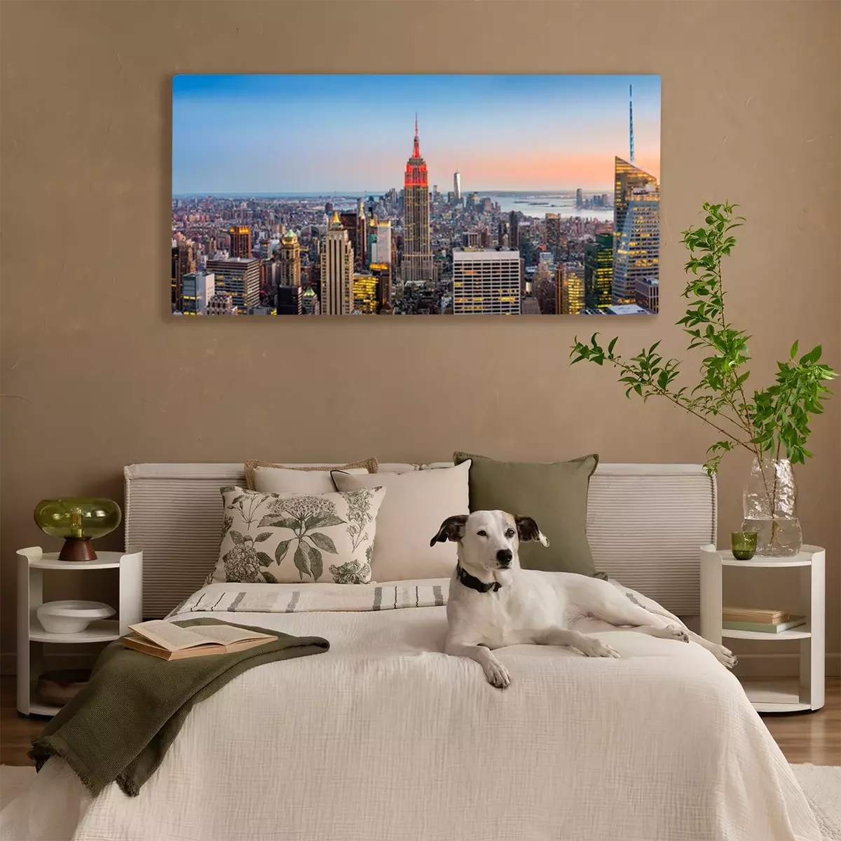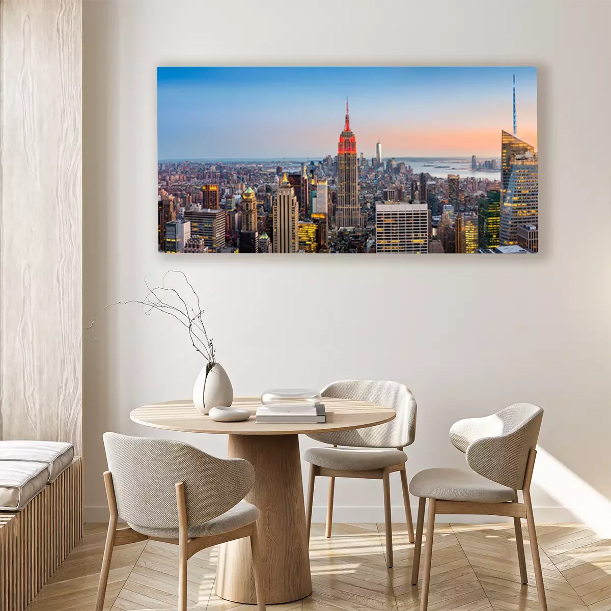 Aerial panorama of New York City skyscrapers at dusk as seen from above the 29th street, close to Hudson Yards and Chelsea neighborhood