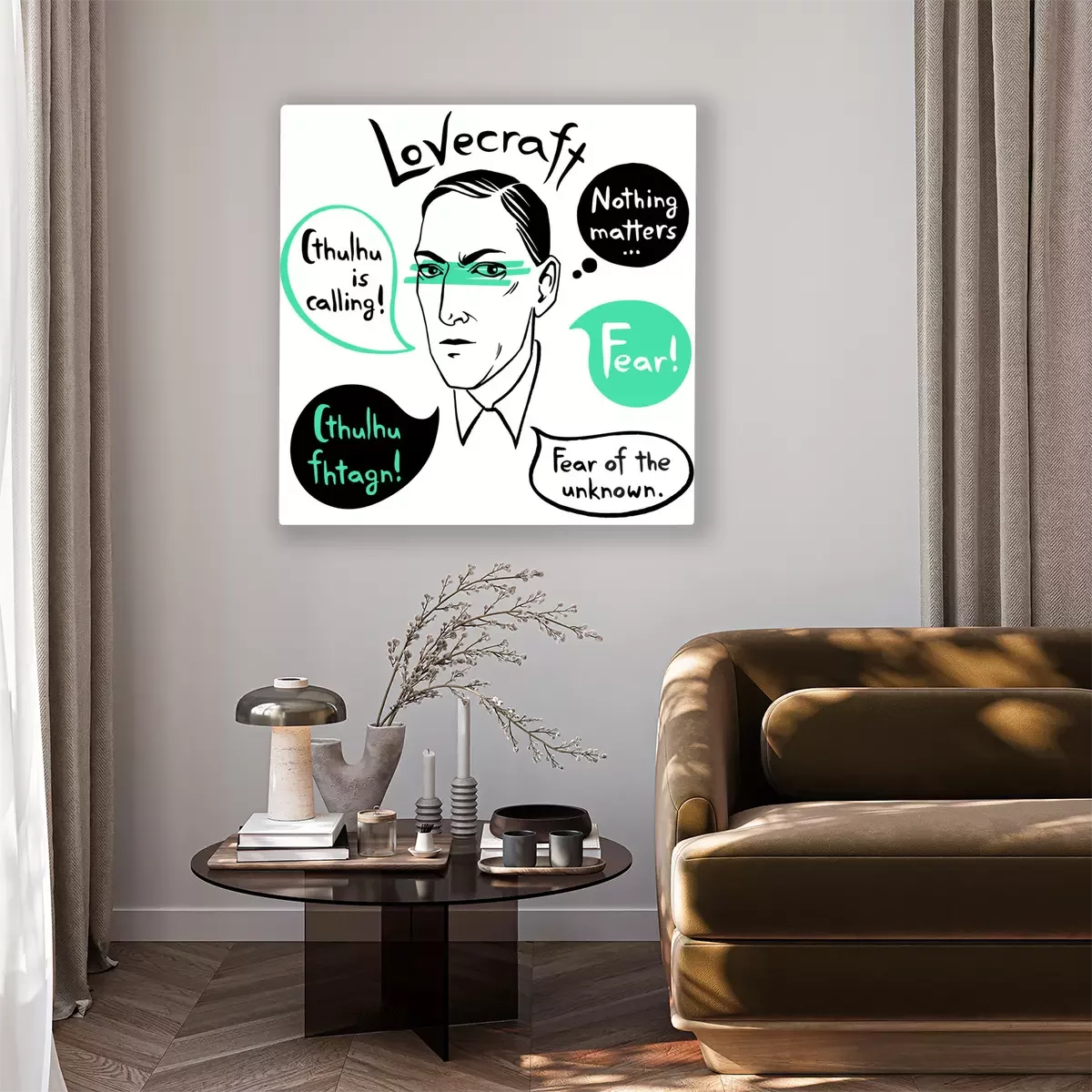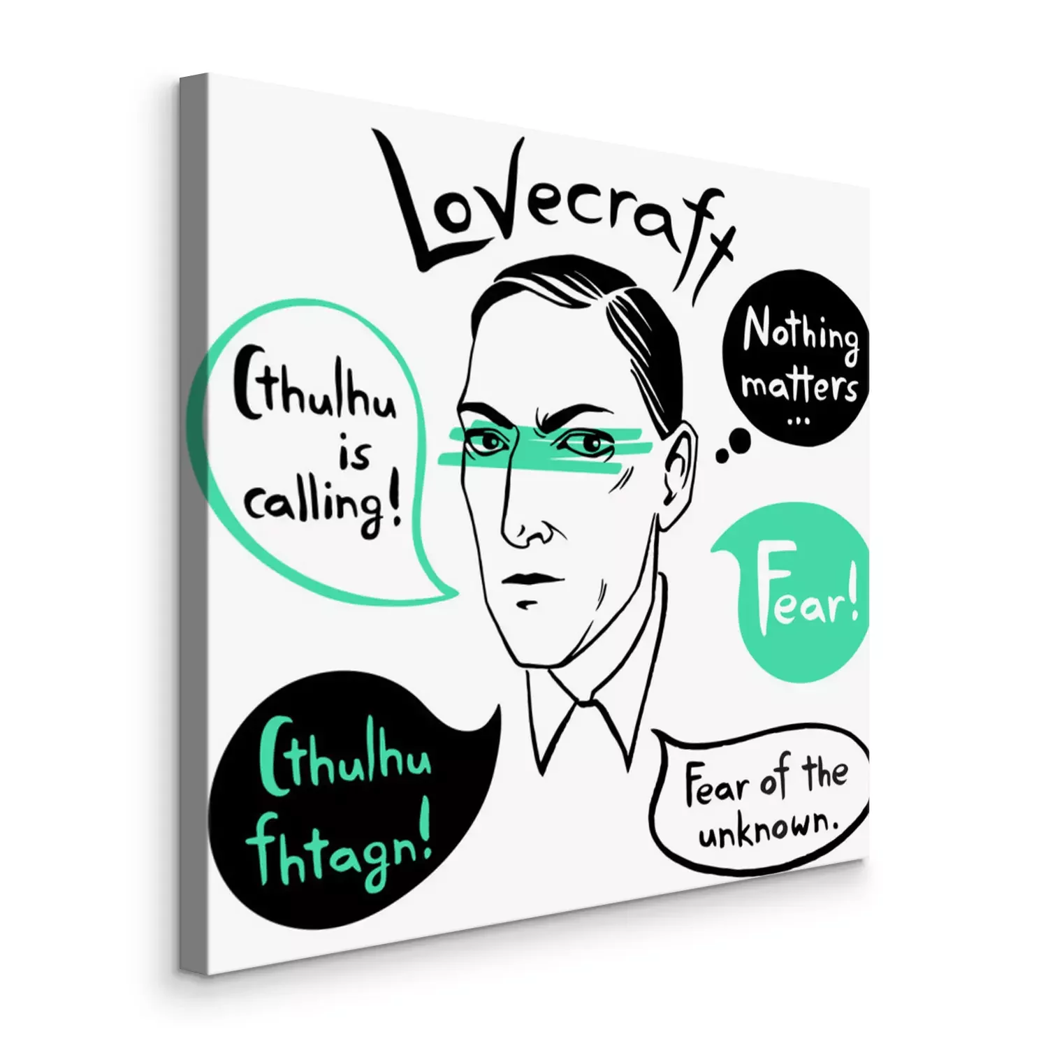 Tableau  Howard Phillips Lovecraft portrait avec des bulles et citations de célèbres écrivains, citations. Horreur fiction livre encre dessinée illustration vectorielle avec lettrage Fear! Cthulhu appelle.