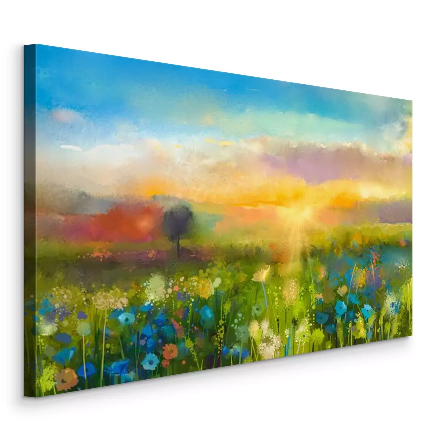 Tableau  Huile peindre des fleurs de pissenlit, de bleuet, marguerite dans les champs. Coucher de soleil prairie paysage avec fleurs sauvages, colline et ciel orange et bleu fond de couleur. Main Peinture été