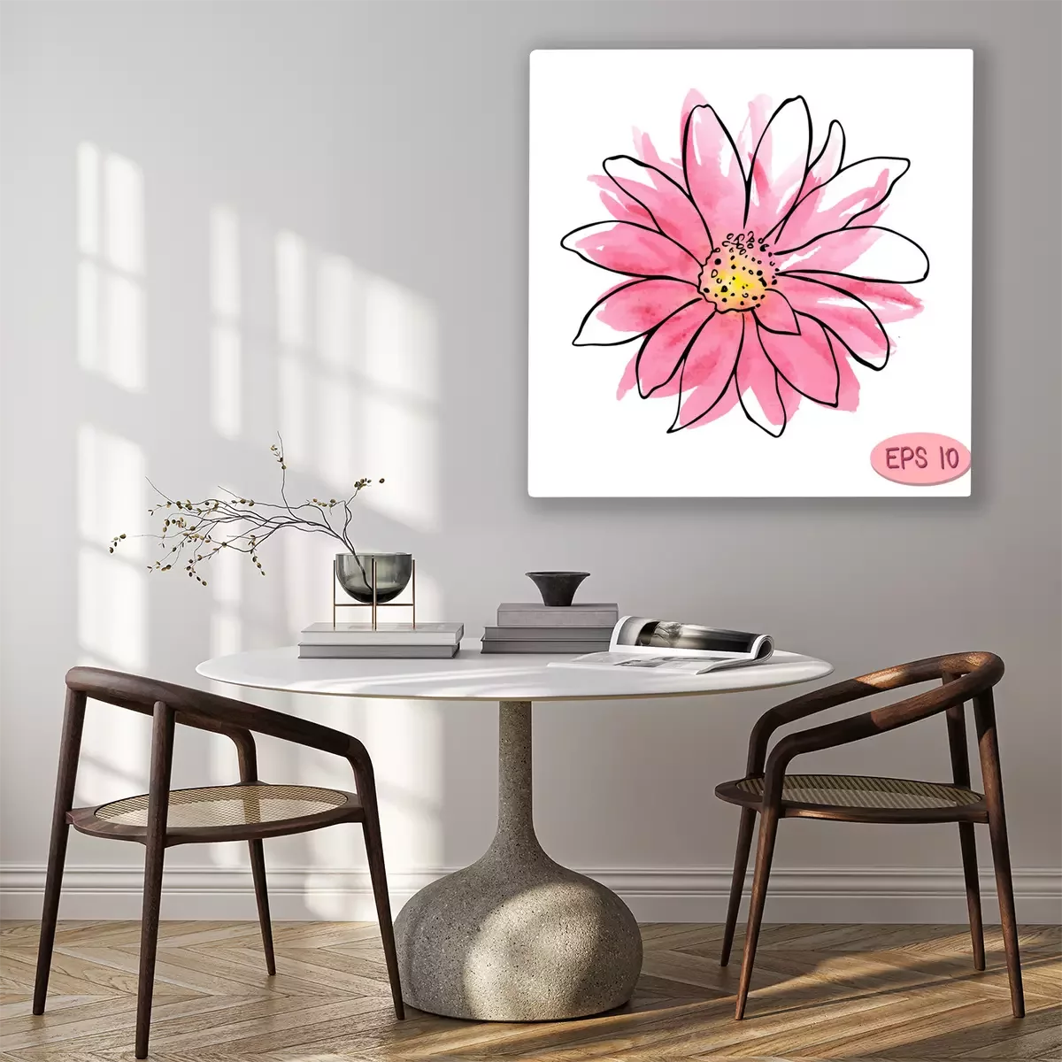 Tableau : illustration de vecteur aquarelle fleur, fleur rose comme marguerite ou chrysanthème avec contour de pli