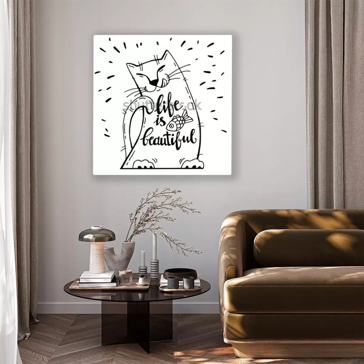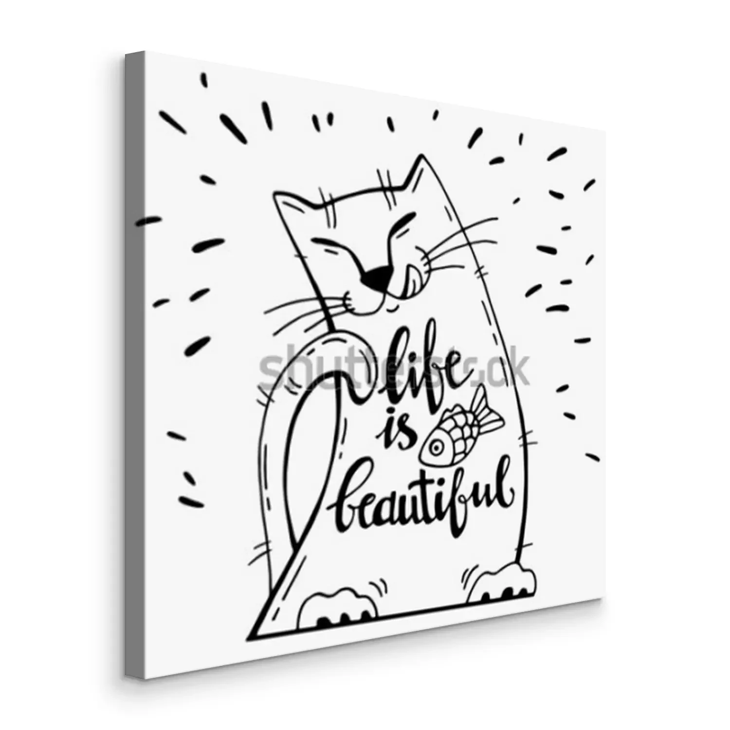 Tableau  Illustration vectorielle Carte positive avec chat de dessin animé avec du poisson. Mots de calligraphie La vie est belle. S'amuser. Peut être imprimé sur des t-shirts, des sacs, des affiches, des