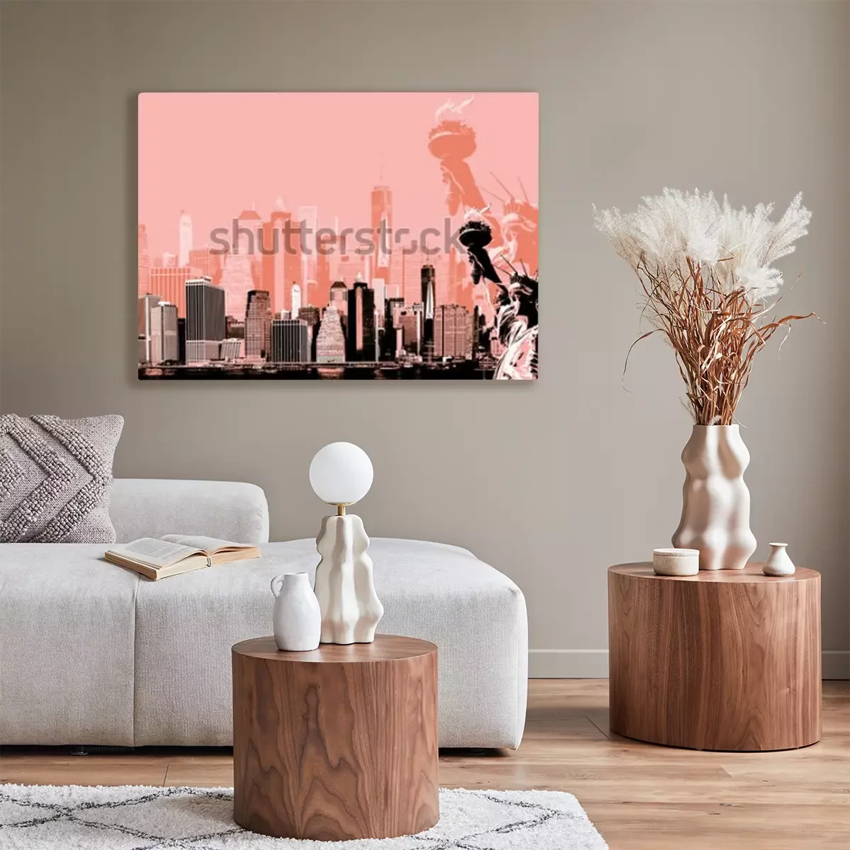 Tableau  Image abstraite de manhattan. Symboles de New York. Skyline de Manhattan et la Statue de la Liberté à New York. Art contemporain et style affiche en orange