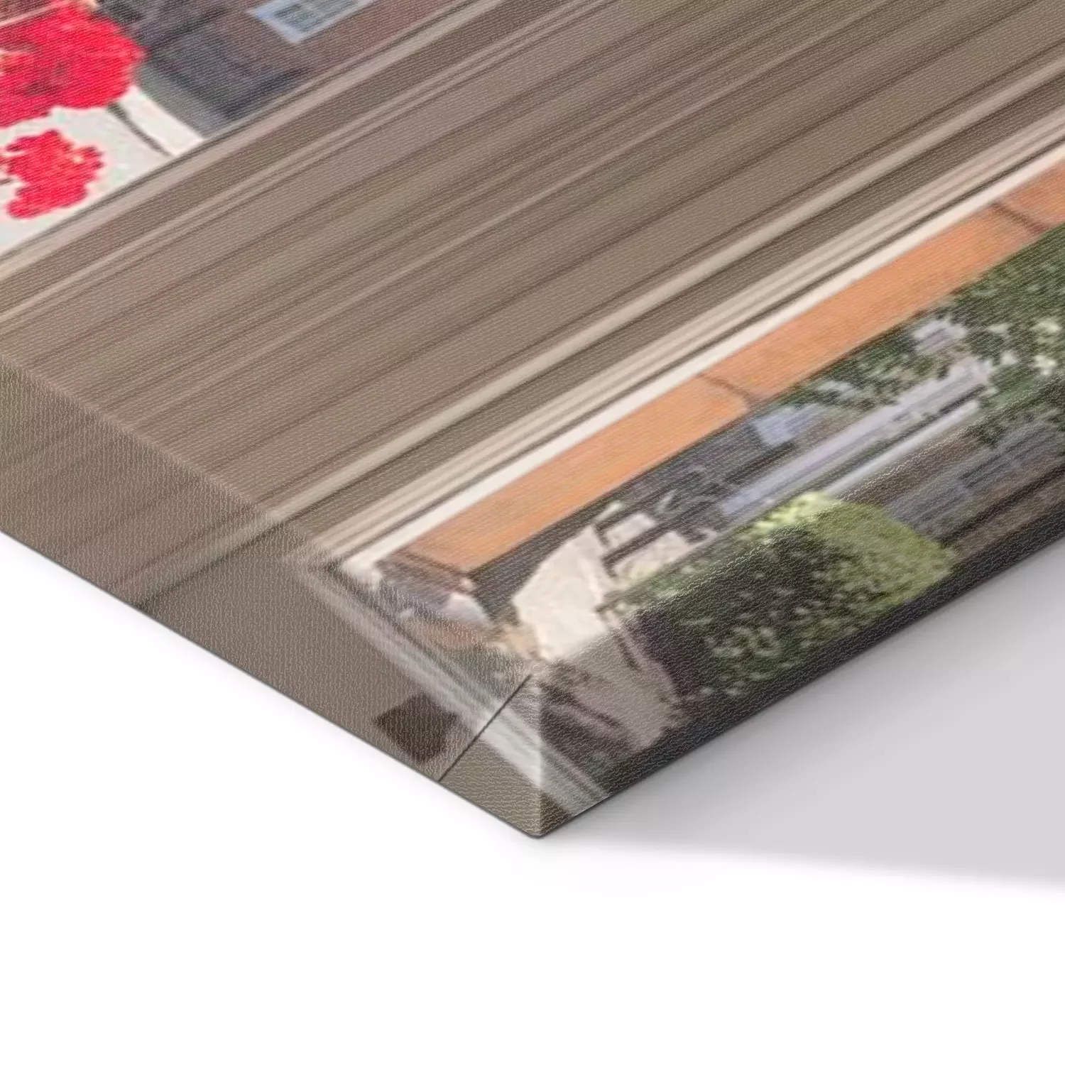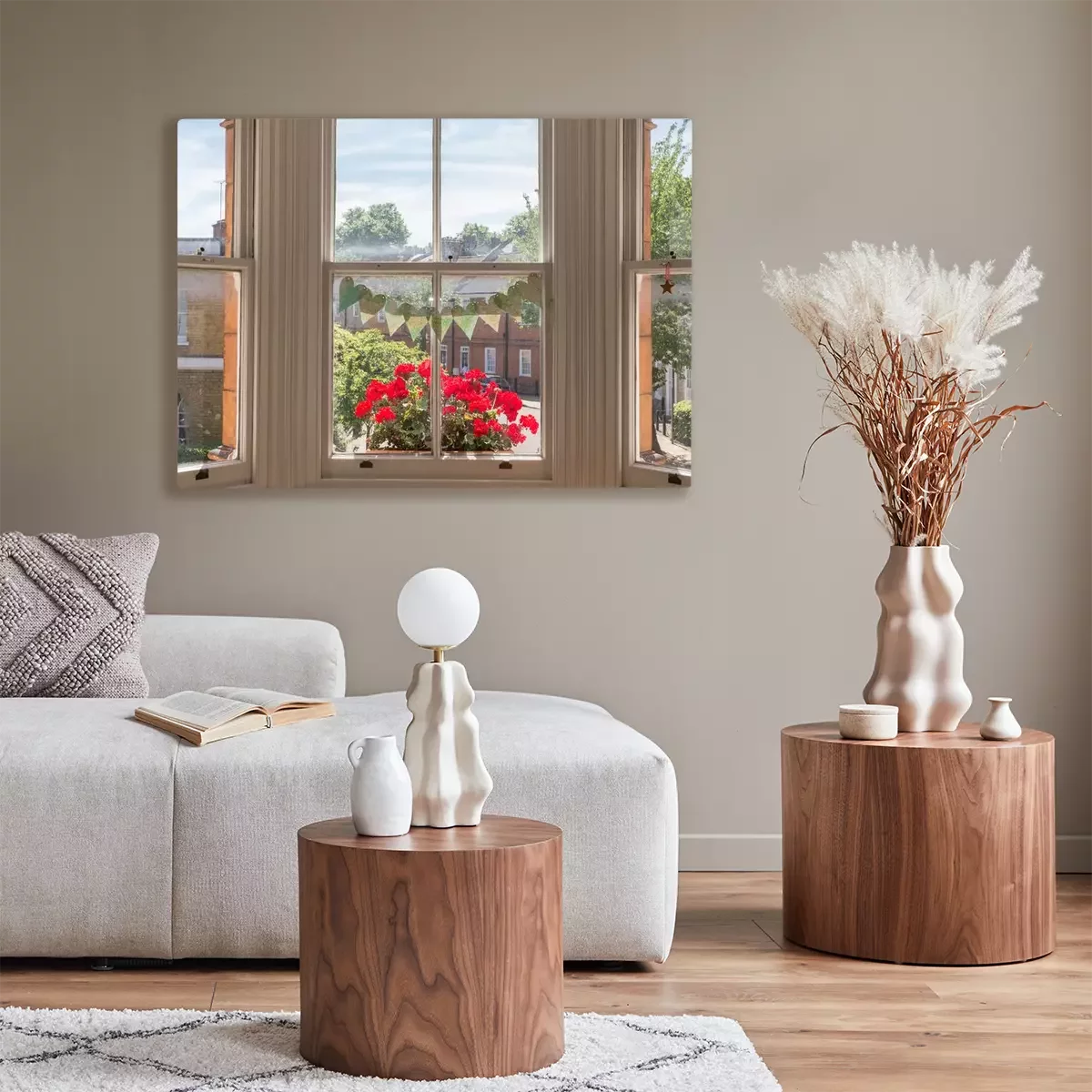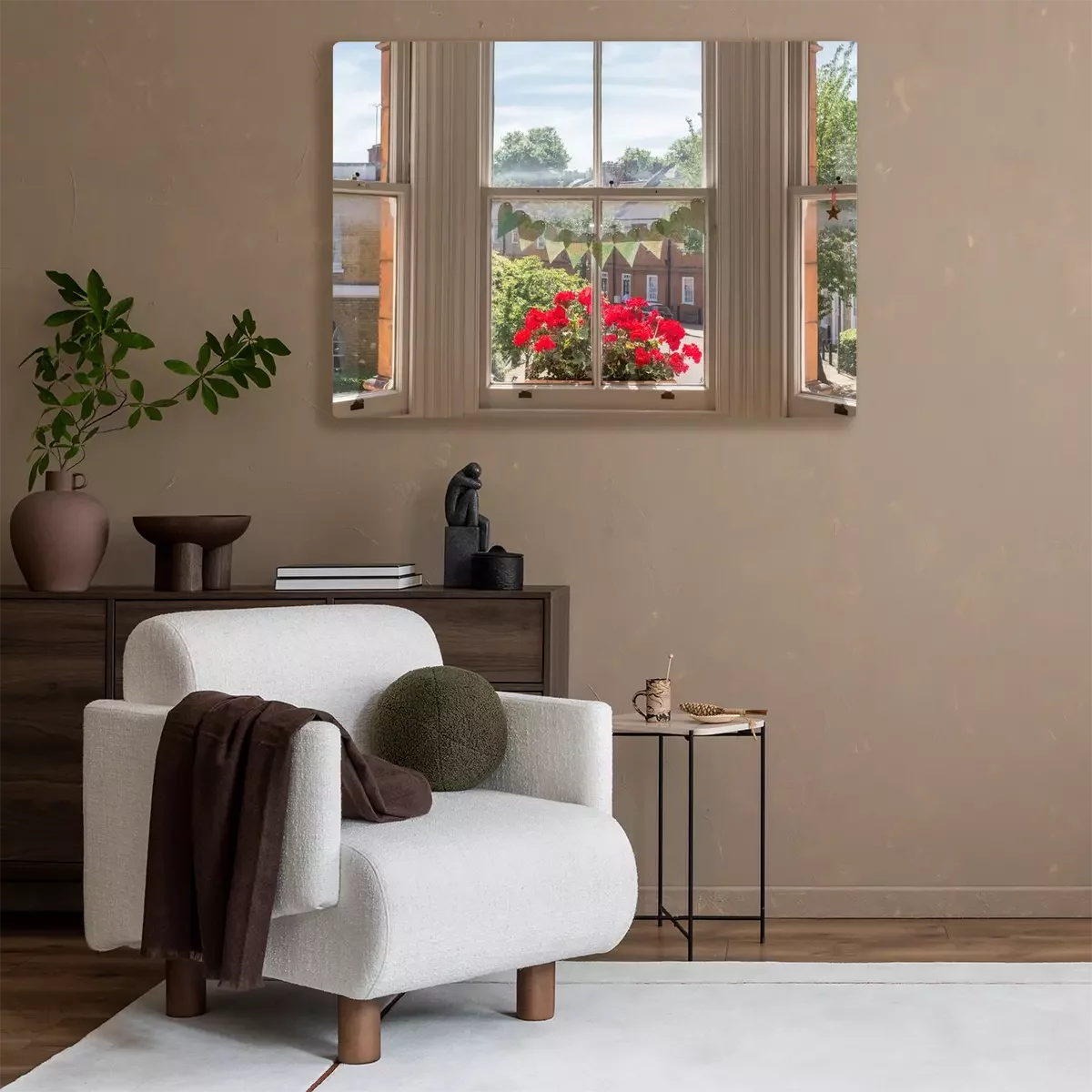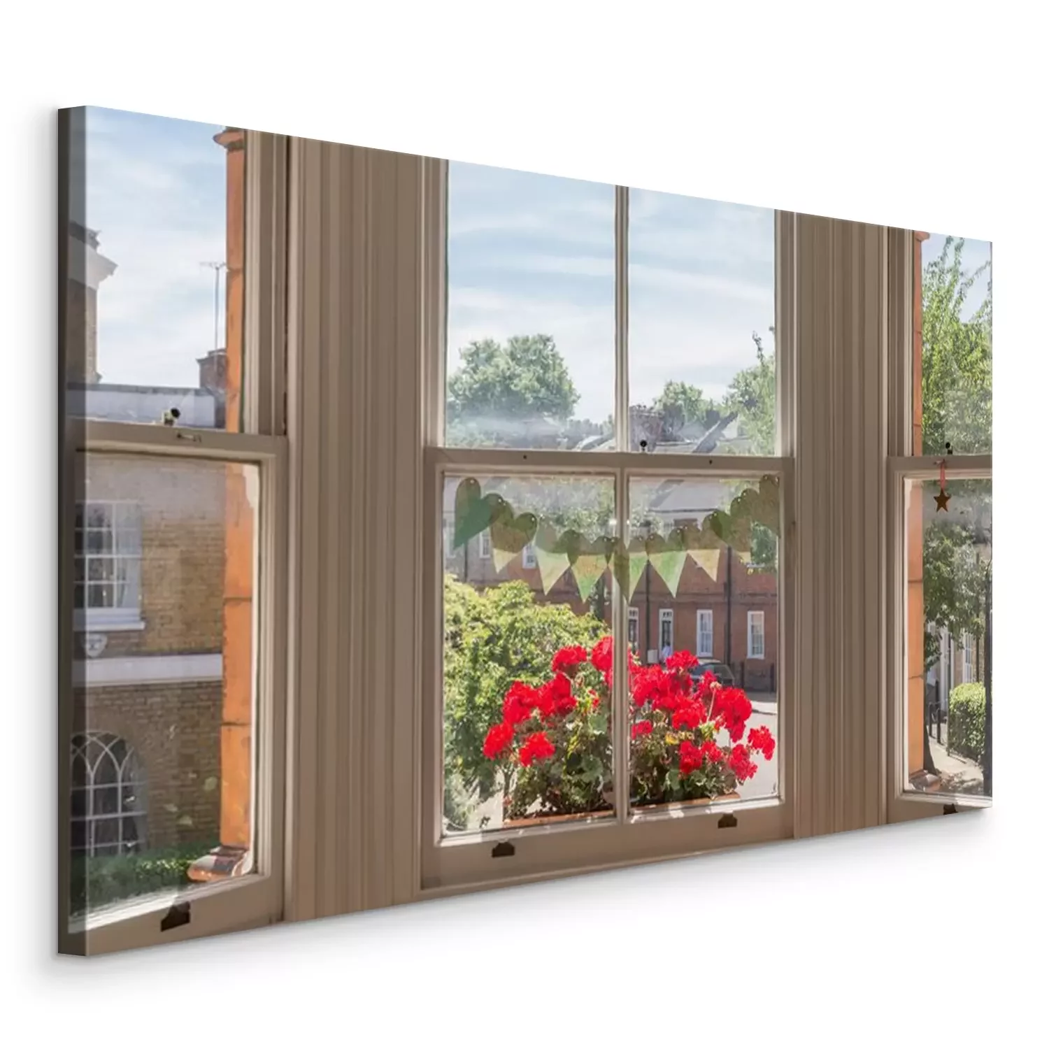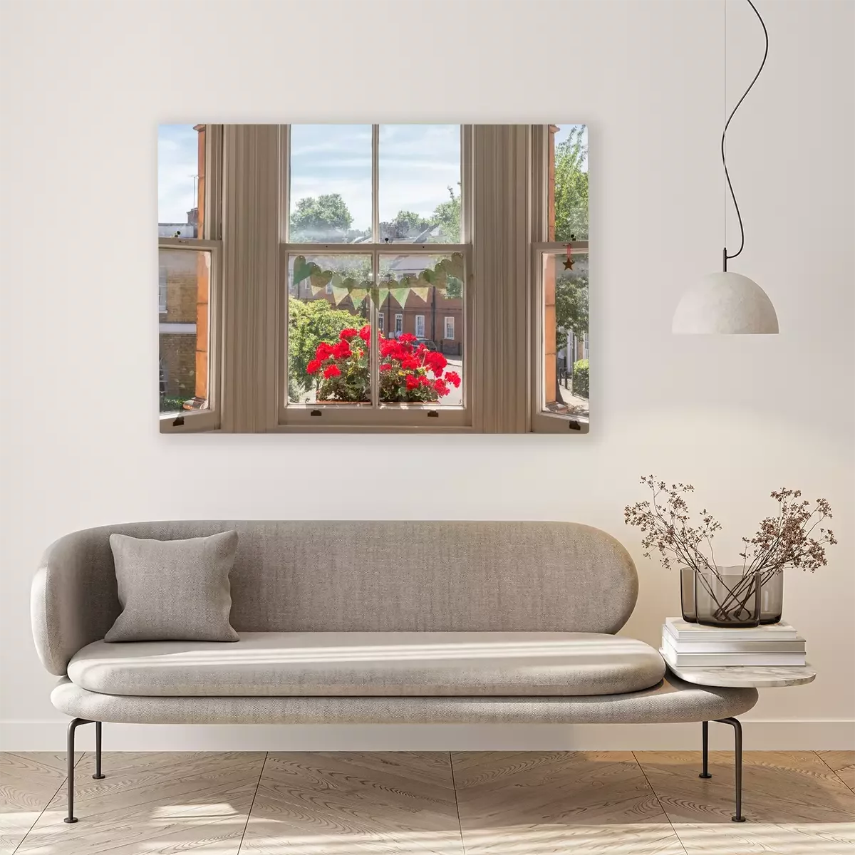 Tableau  Intérieur d'une maison britannique victorienne avec de vieilles fenêtres en bois blanc et des fleurs de géranium rouge sur le seuil de la fenêtre face à une rue traditionnelle anglaise