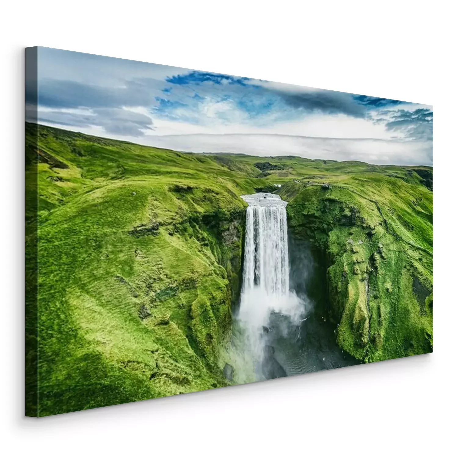 Tableau  Islande cascade Skogafoss dans le paysage nature islandais. Les attractions touristiques célèbres et les destinations de destinations dans le paysage nature islandais sur l'Islande du Sud. Vue aérienn