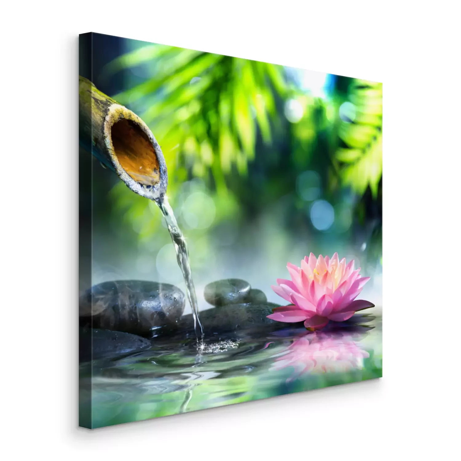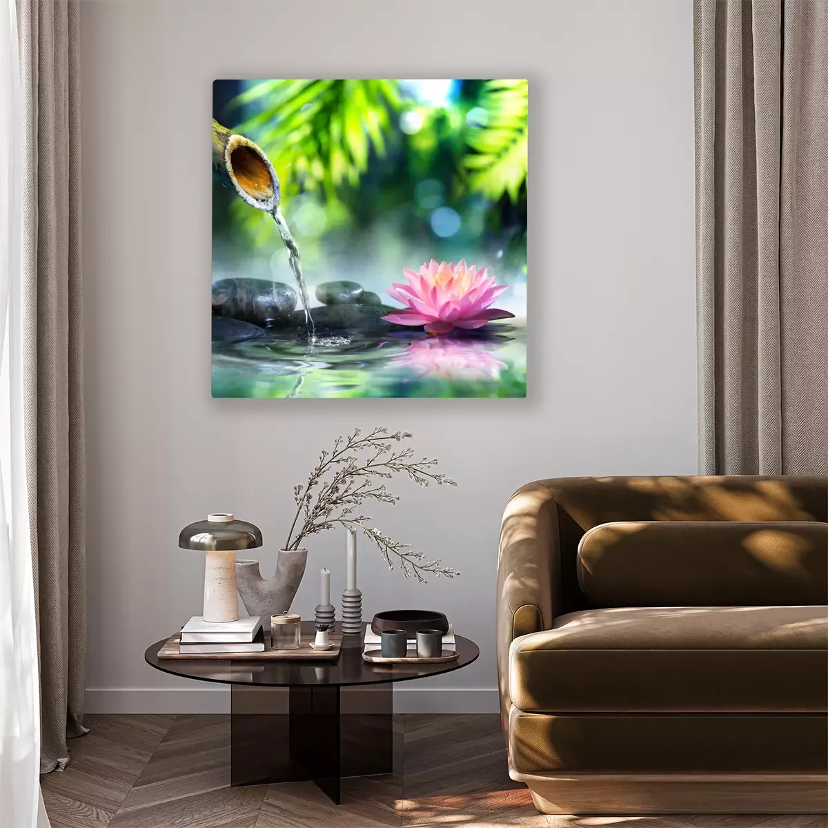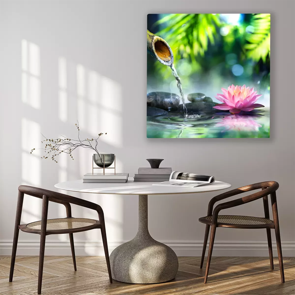 Tableau : jardin zen avec des pierres noires et nénuphar rose