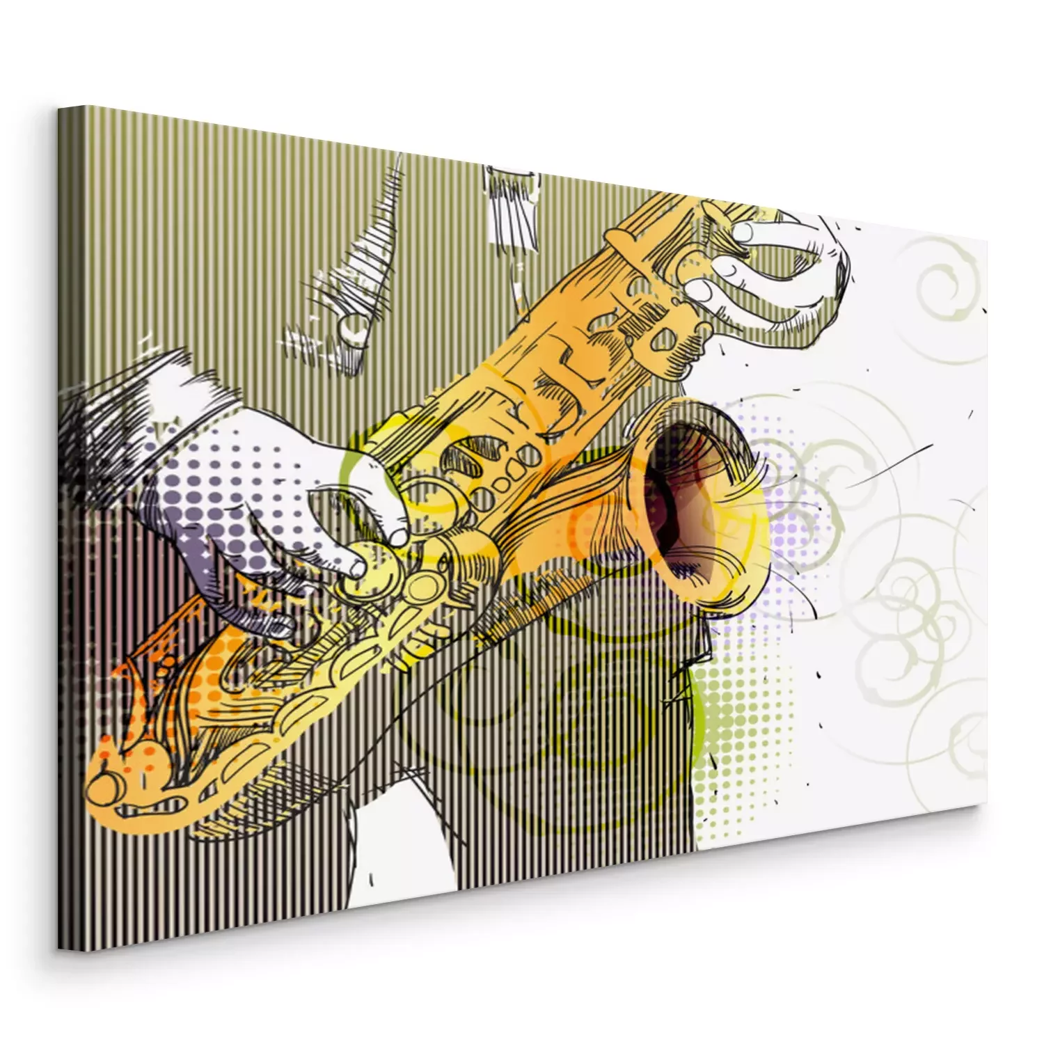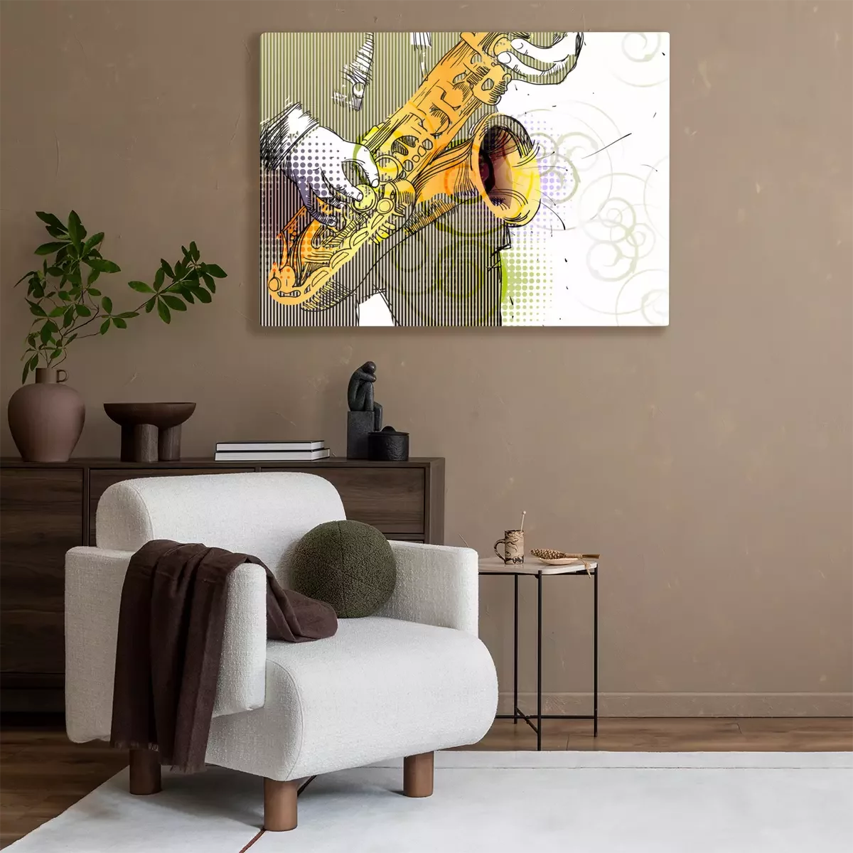Tableau : jazzman dans un costume rayé avec un saxophone d'or
