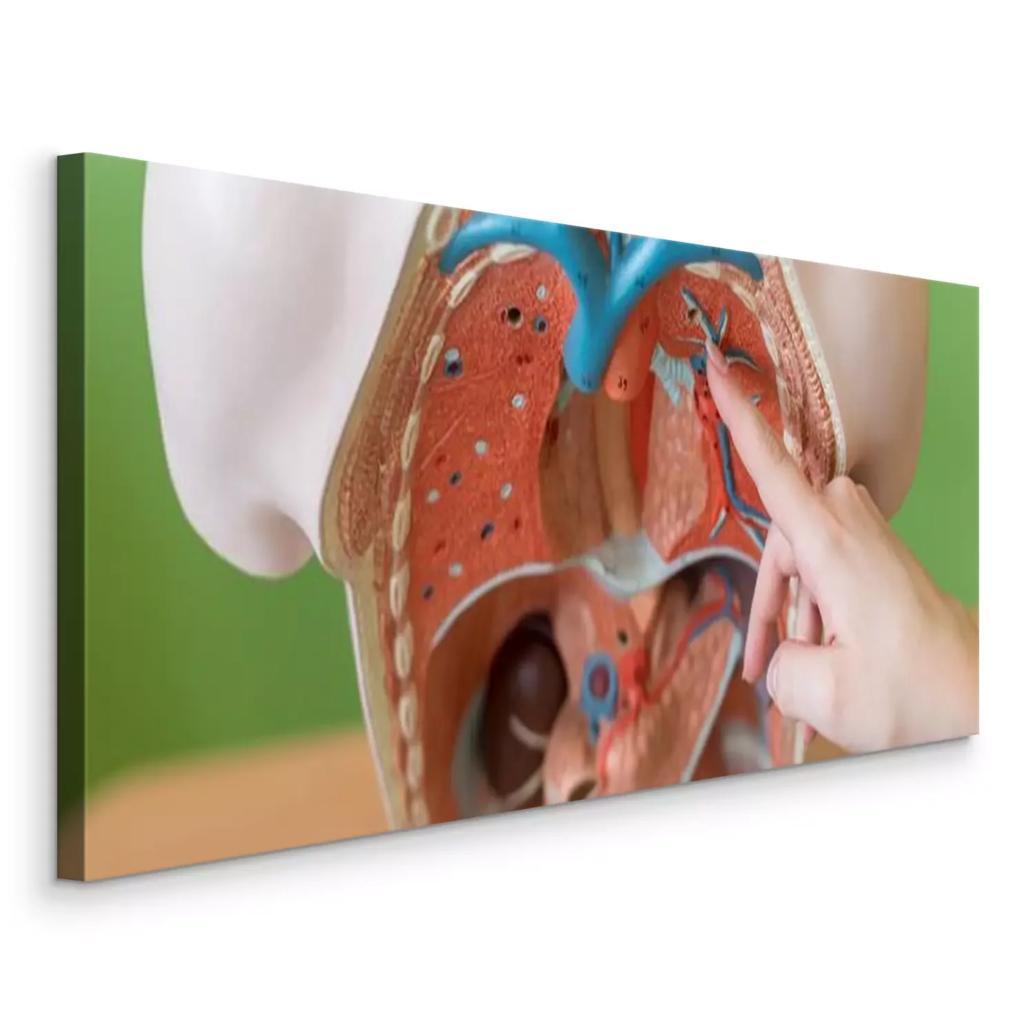 Tableau  Jeune enseignante en classe de biologie, enseignant l'anatomie du corps humain, utilisant un modèle corporel artificiel pour expliquer les organes internes. Doigt au système de vaisseaux sanguins. Ban