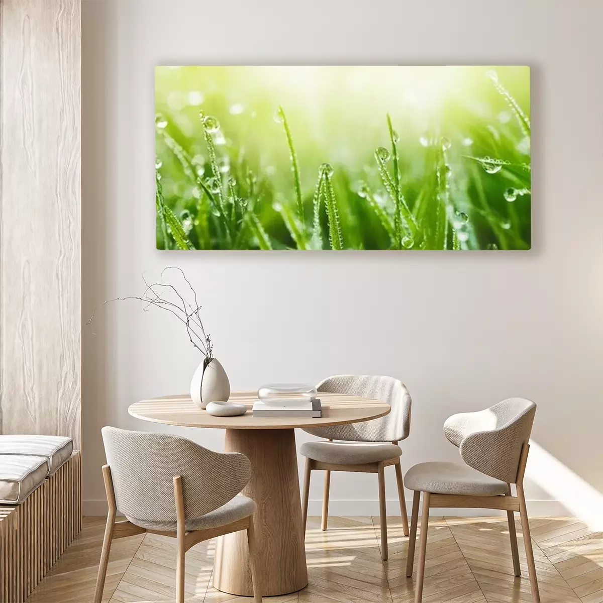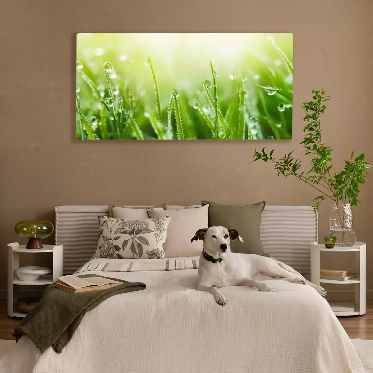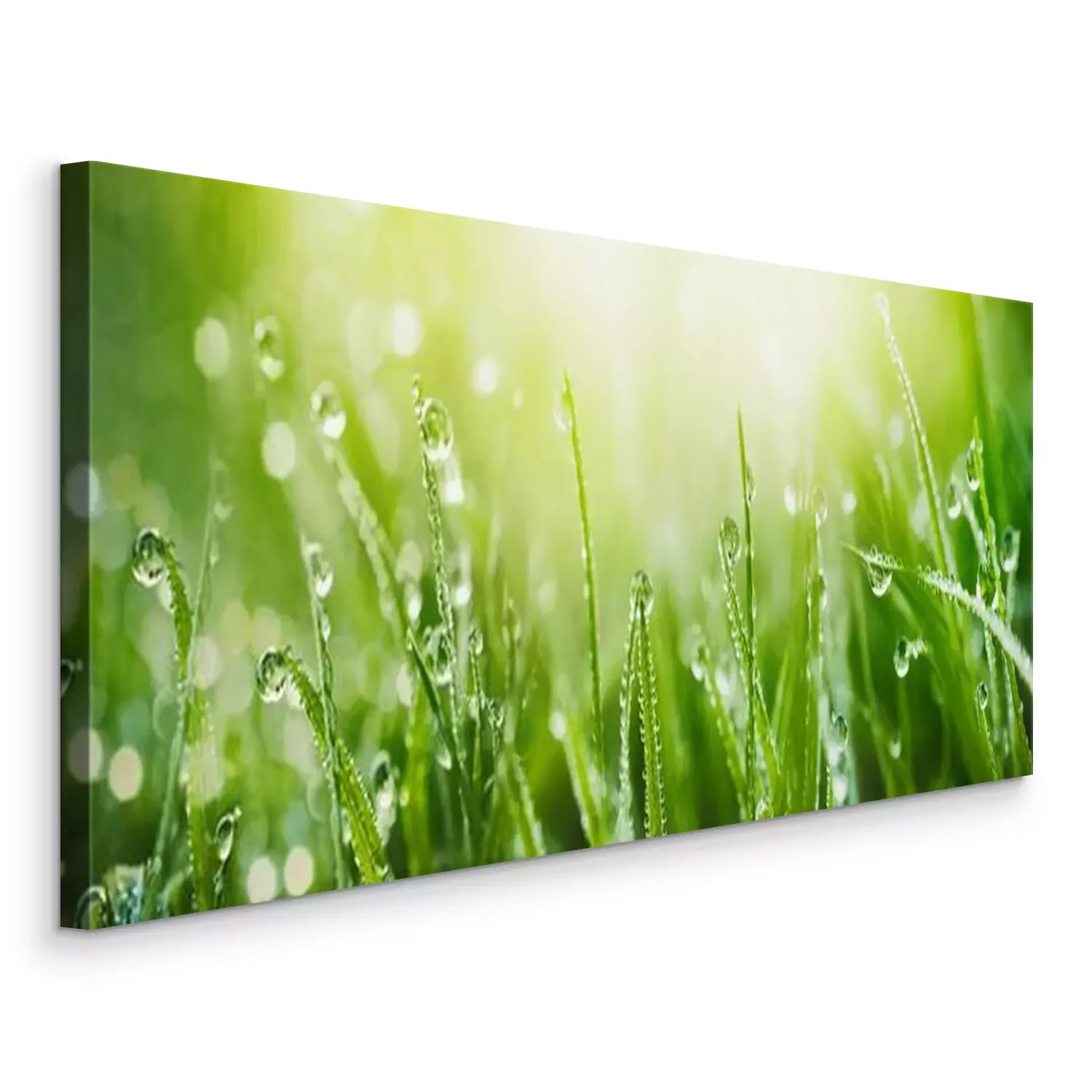 Tableau  Juicy lush green grass on meadow with drops of water dew in morning light in spring summer outdoors close-up macro, panorama. Beautiful artistic image of purity and freshness of nature, copy space.