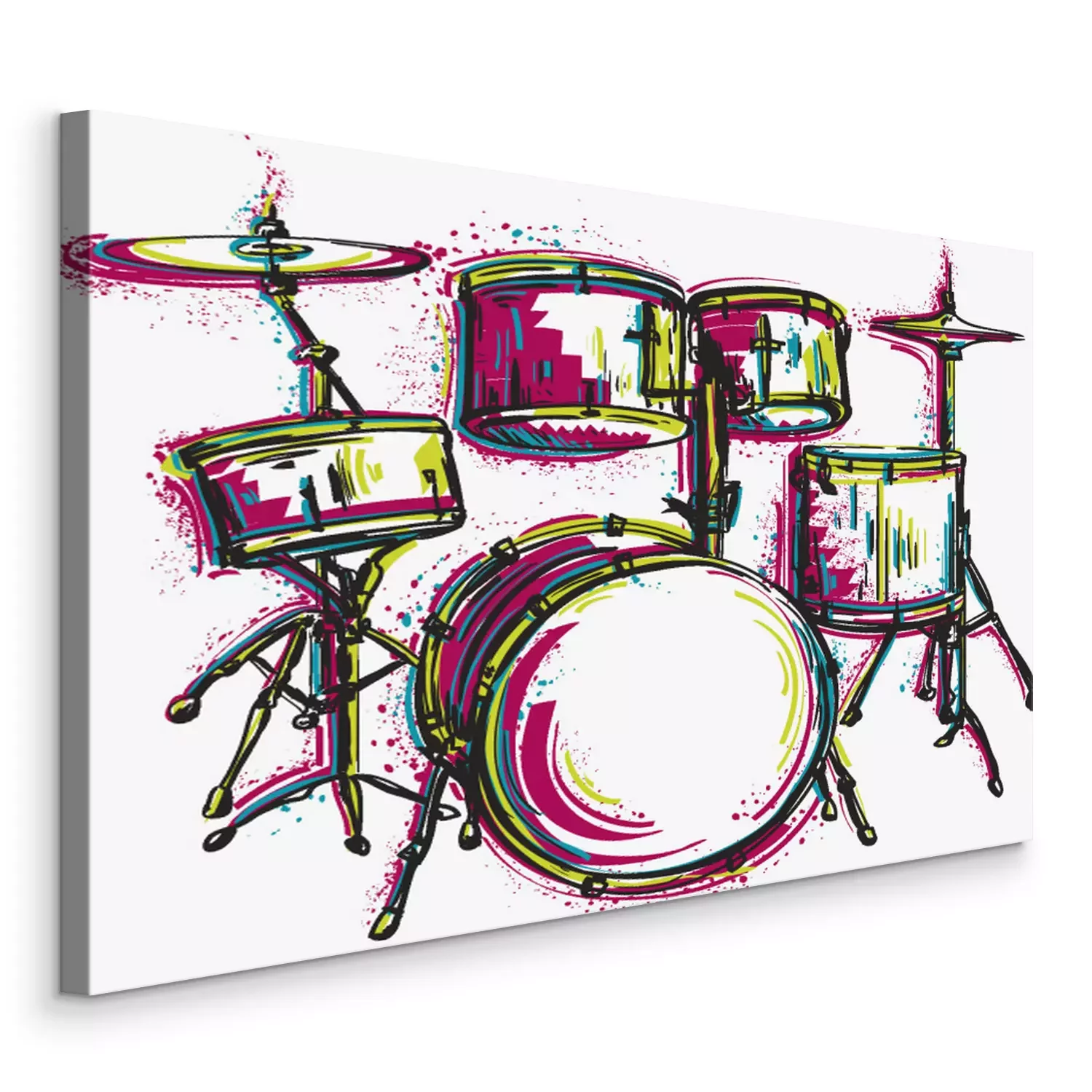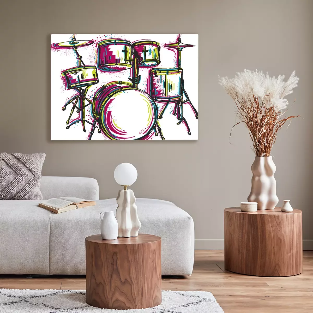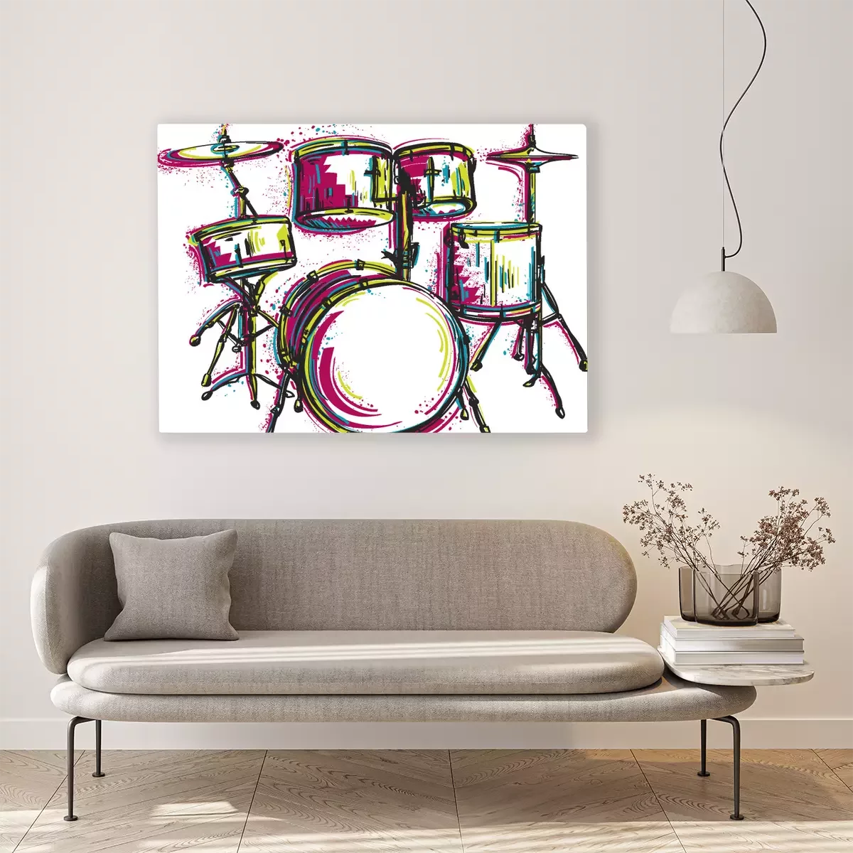Tableau  Kit de batterie avec des éclaboussures en style aquarelle. Illustration colorée dessinée à main
