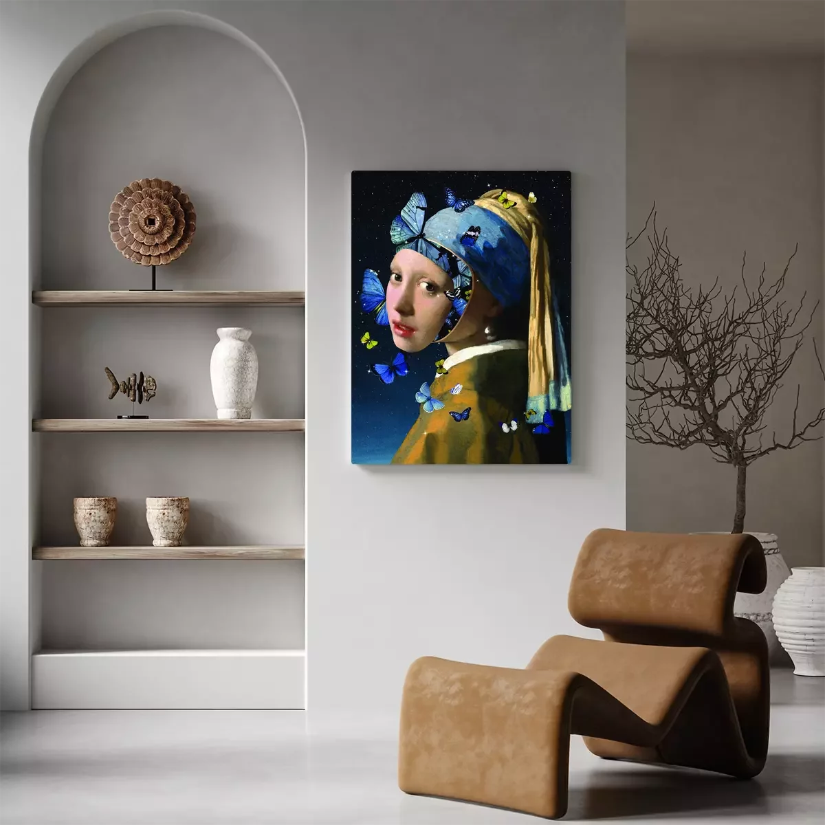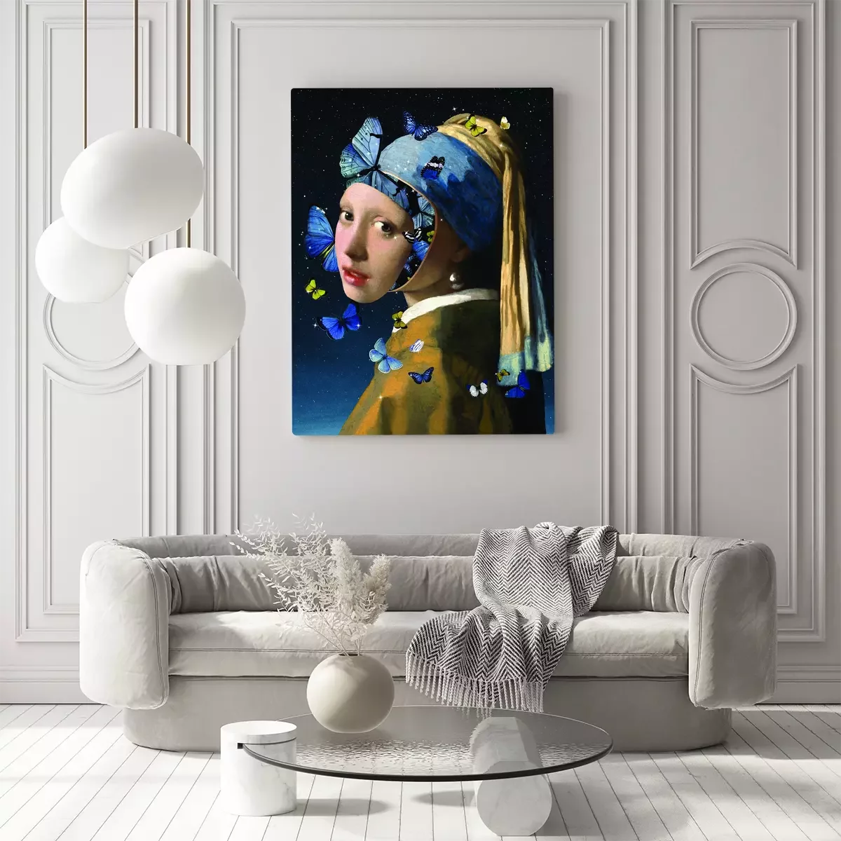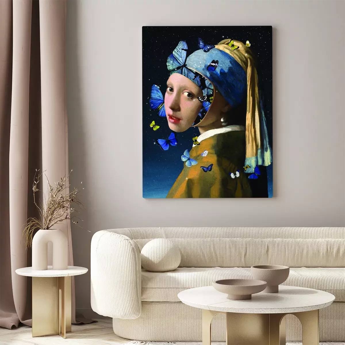 La jeune fille à la perle dans une composition surréaliste avec des papillons