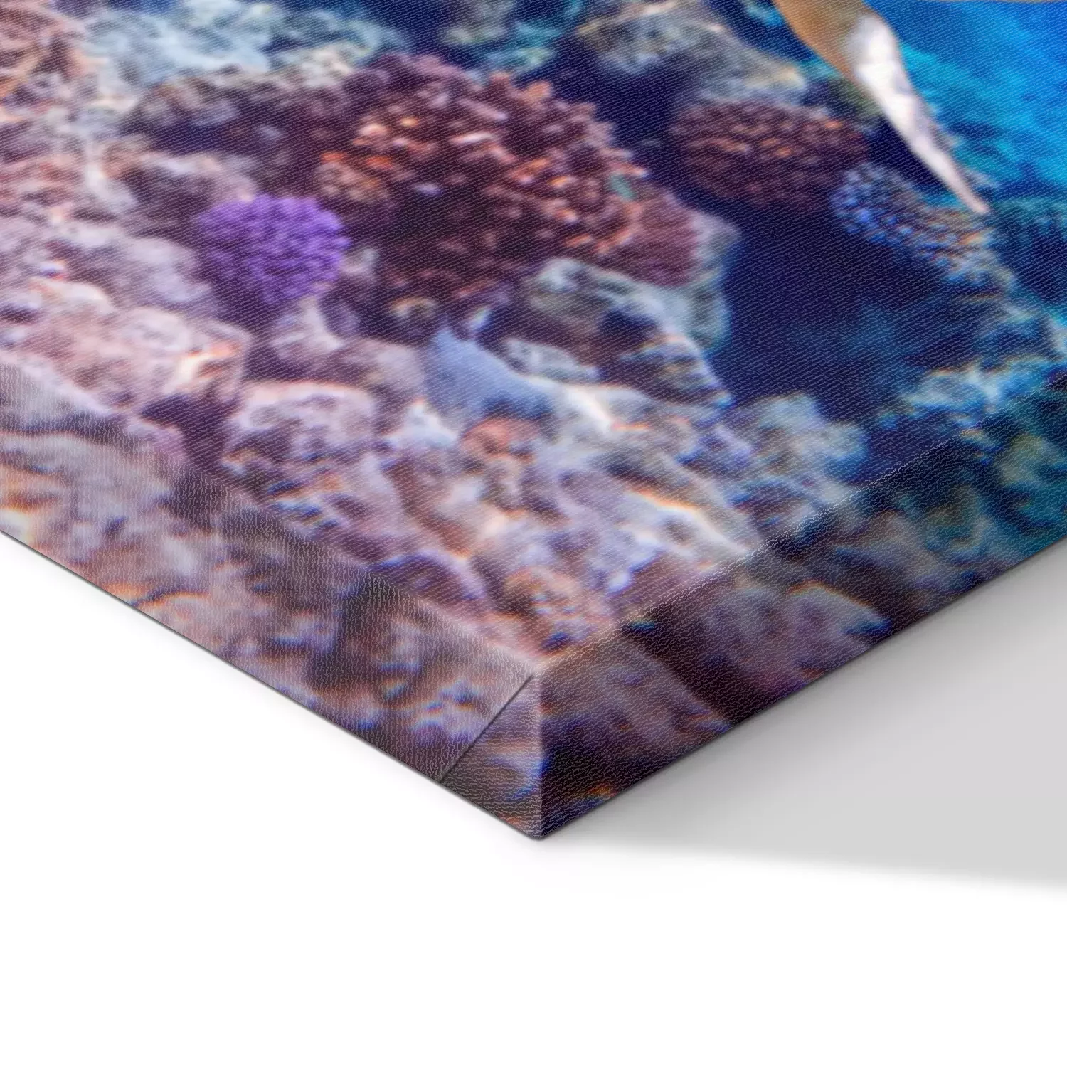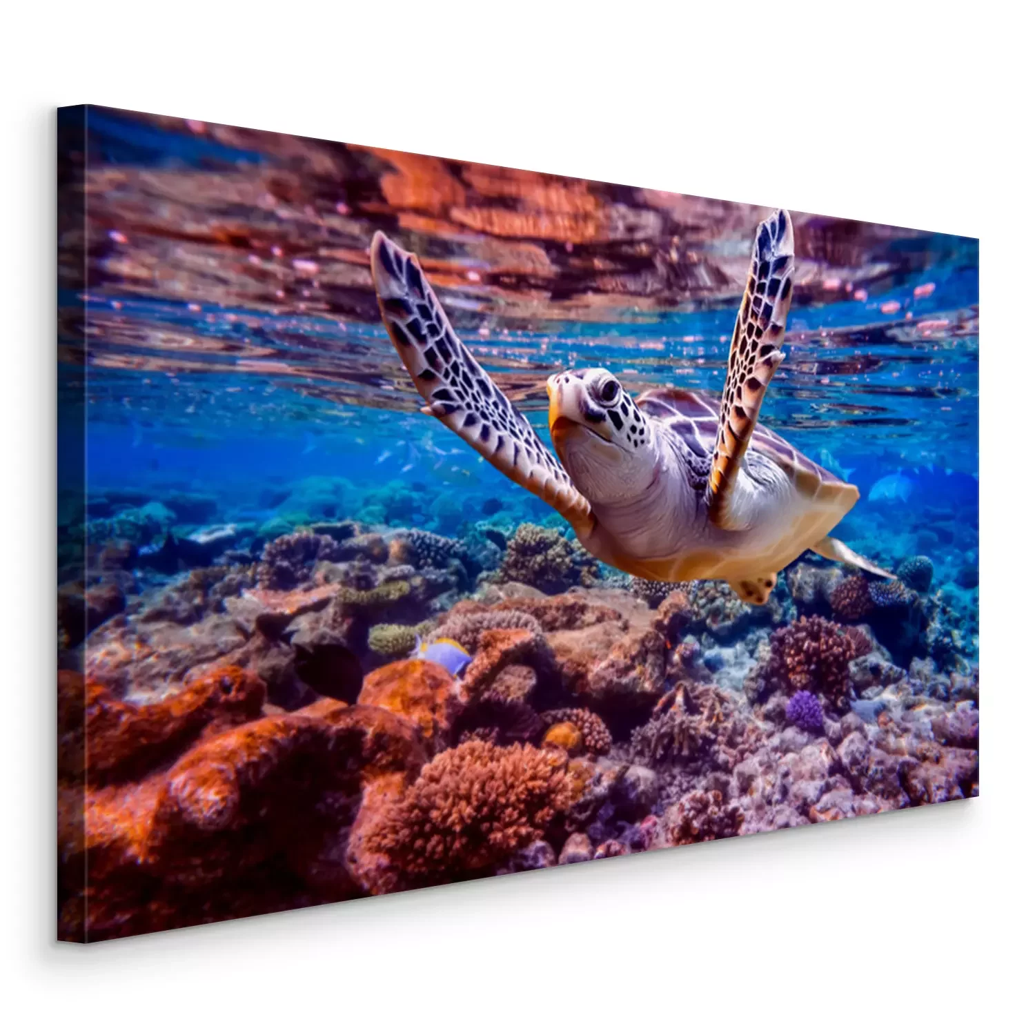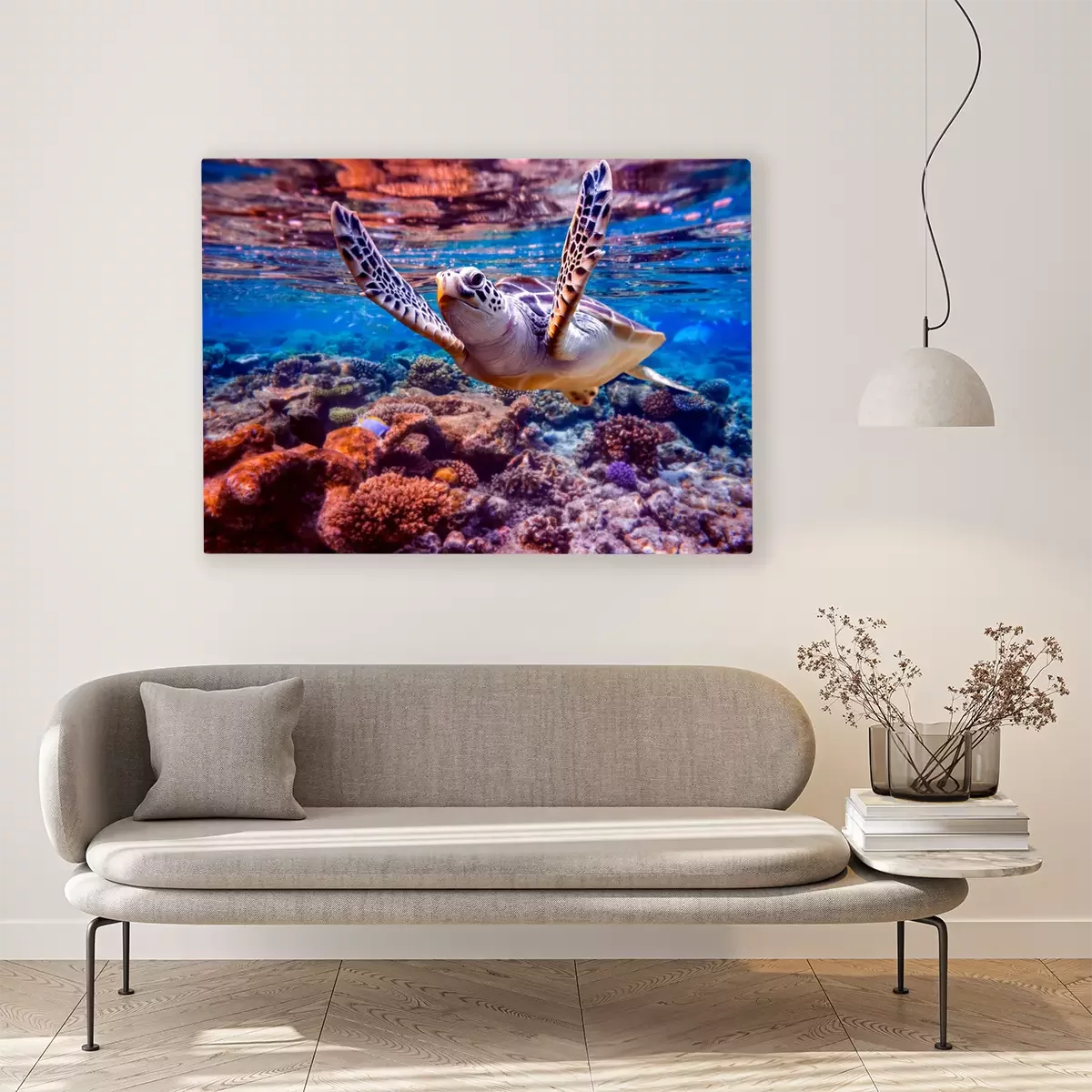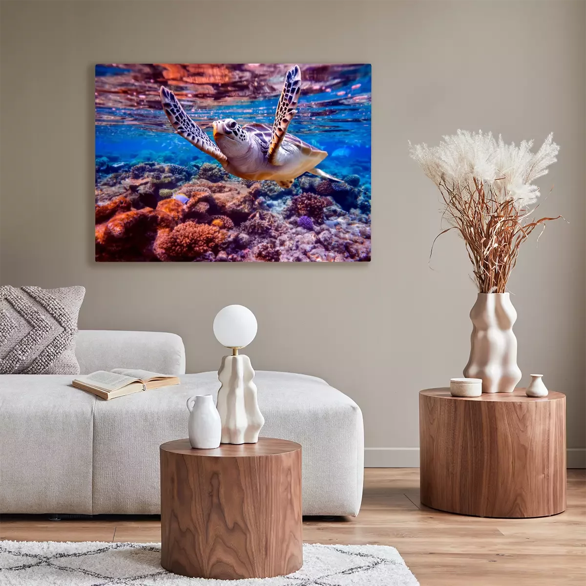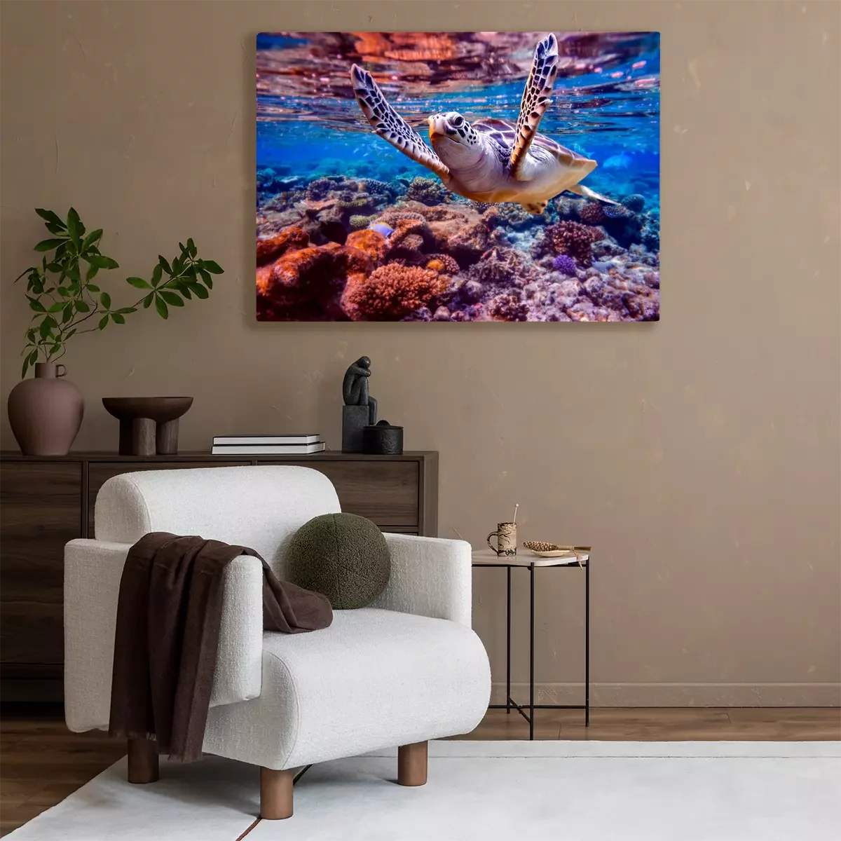 Tableau  La tortue de mer nage sous l'eau sur le fond des récifs coralliens