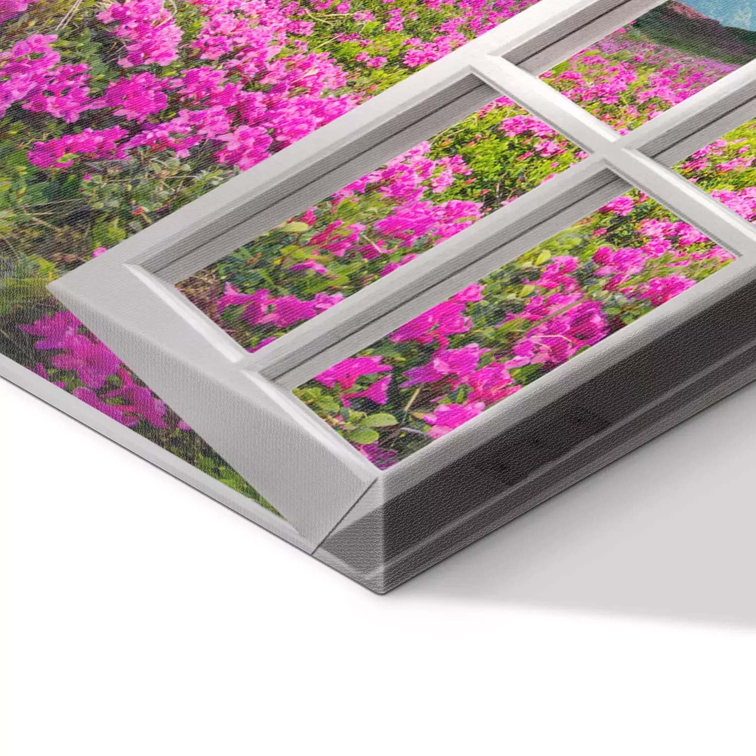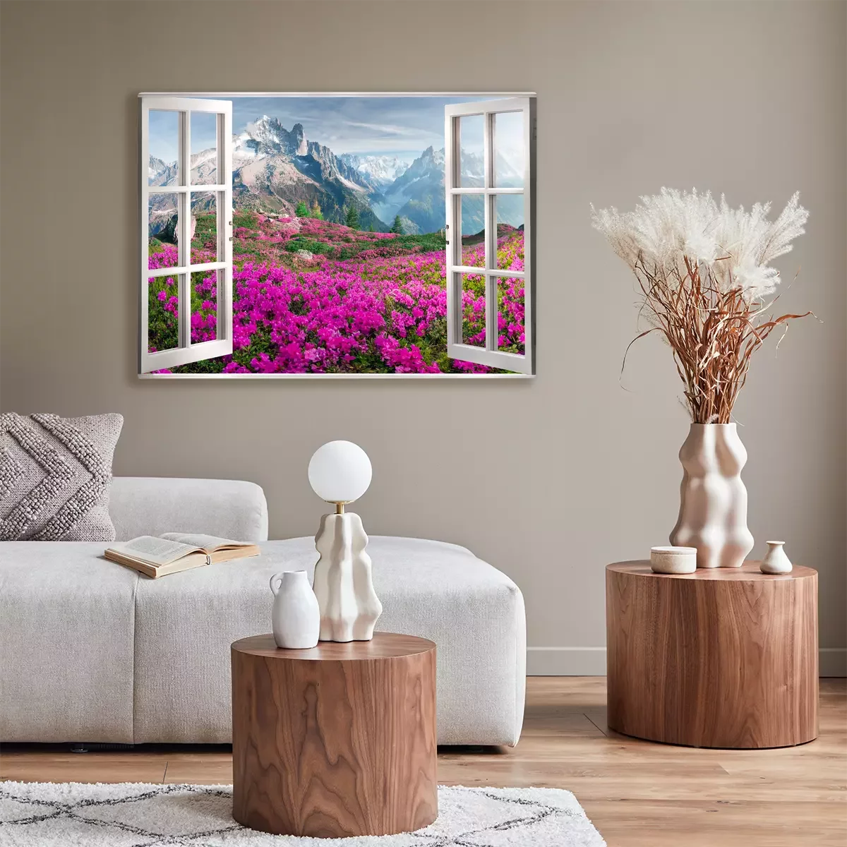 La vue depuis la fenêtre ouverte donne sur des azalées et des sommets montagneux.