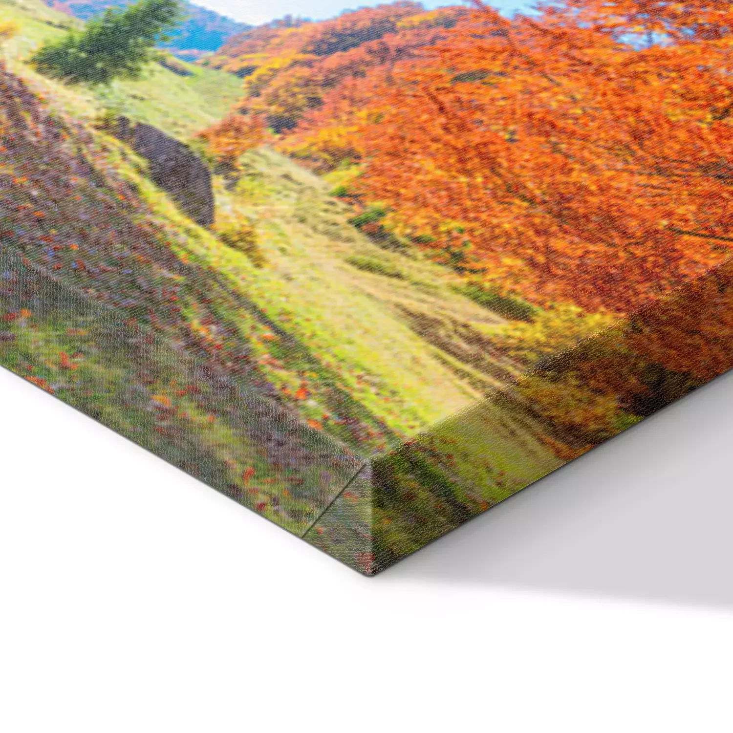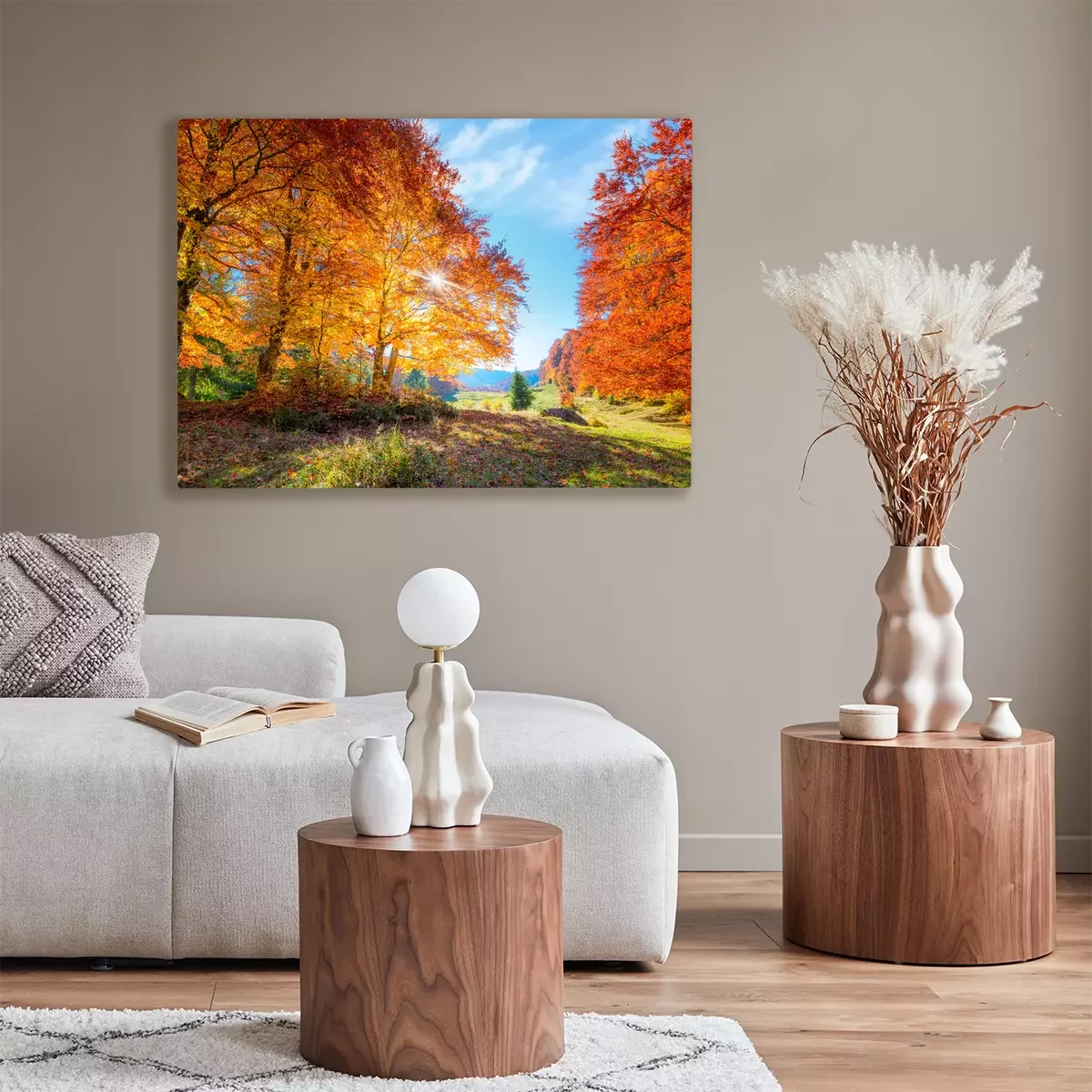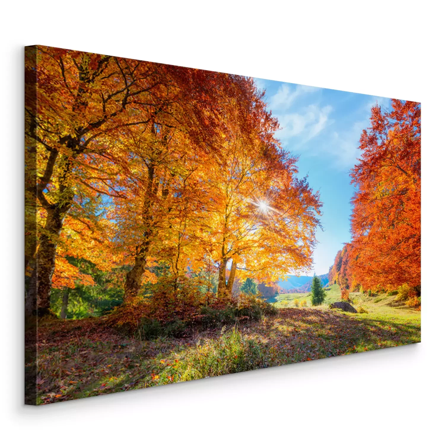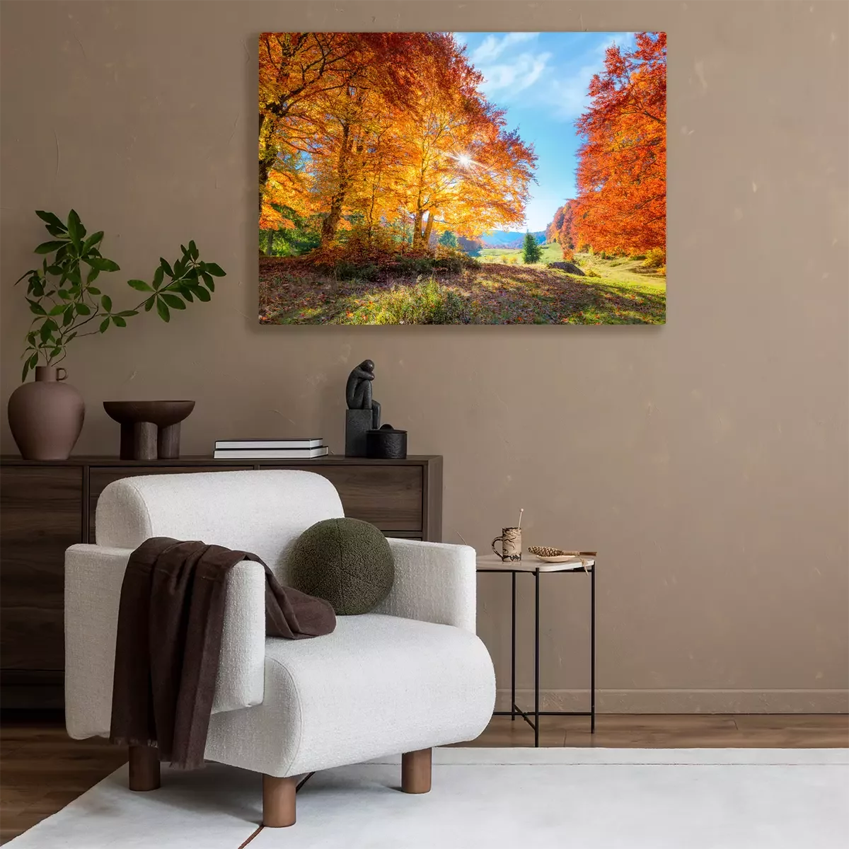Tableau  Landscape of Autumnal forest with real sun and orange trees on meadow