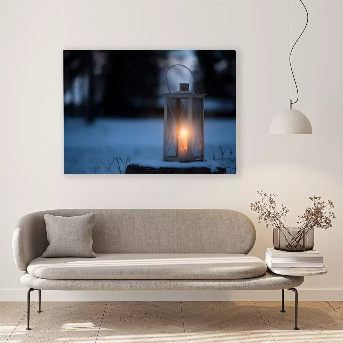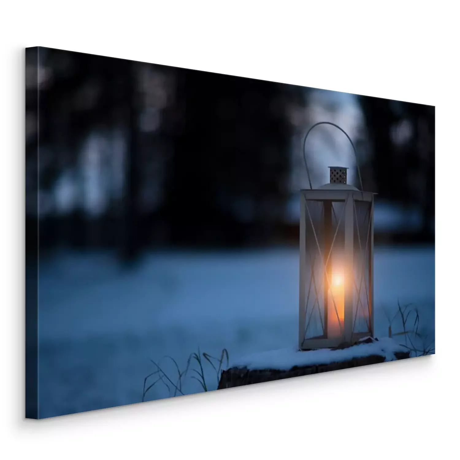 Tableau : Lanterne à bougie dans la neige sur fond de forêt défocalisé.