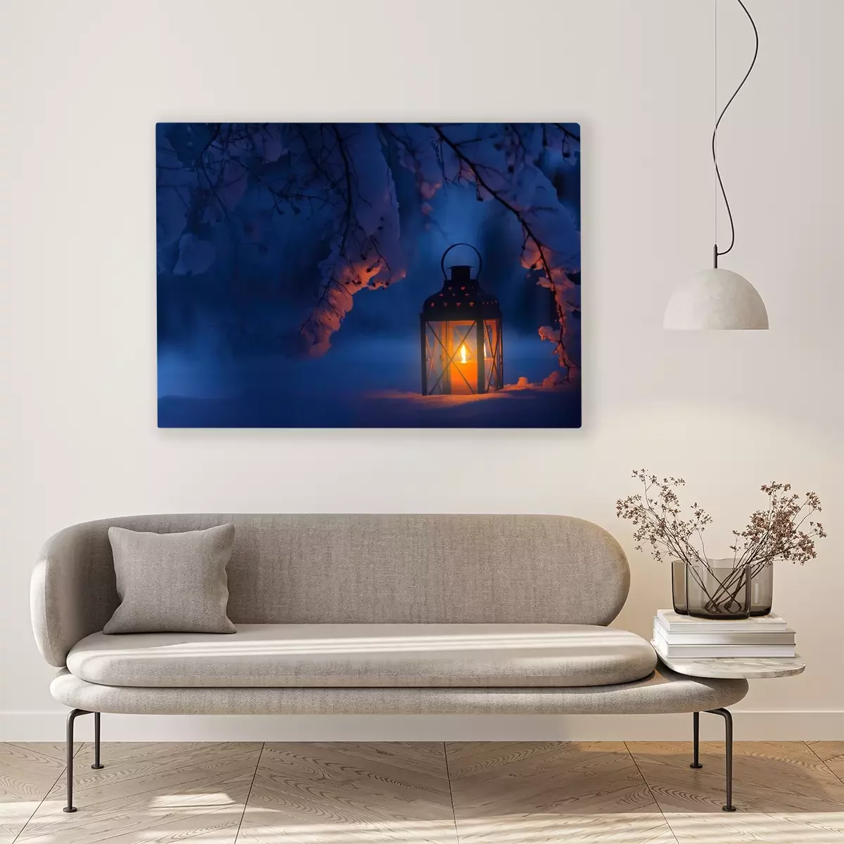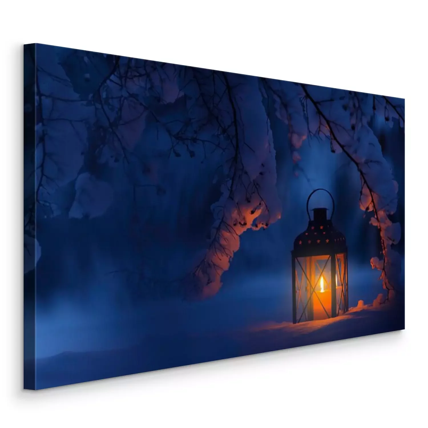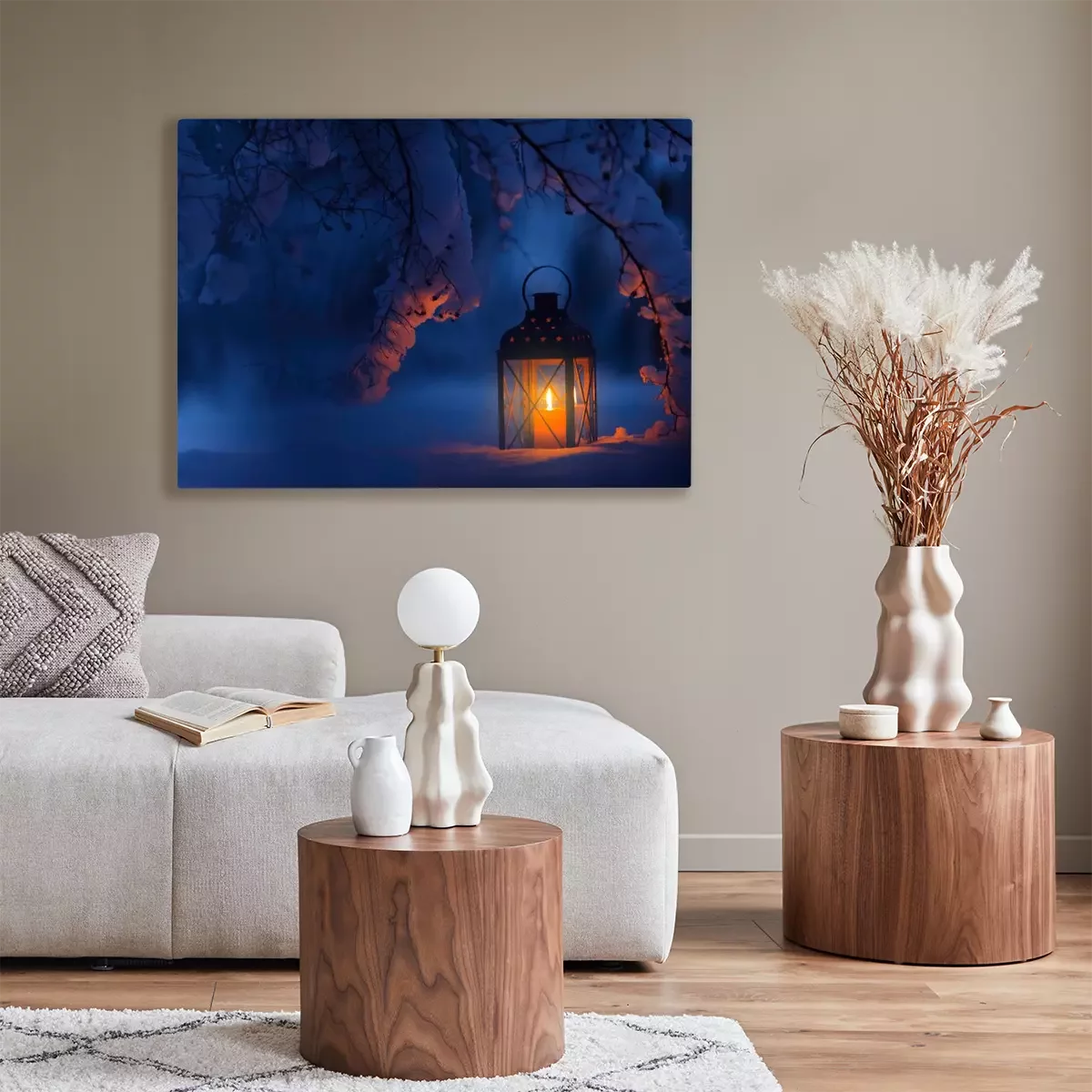 Tableau  Lanterne à bougie sous les branches enneigées au crépuscule. Noël dans un jardin hivernal.