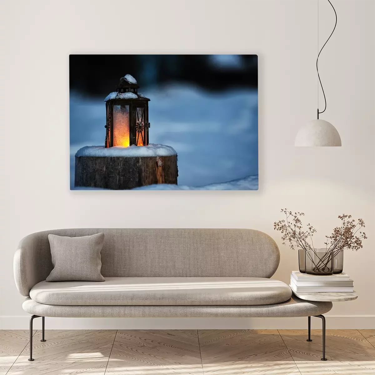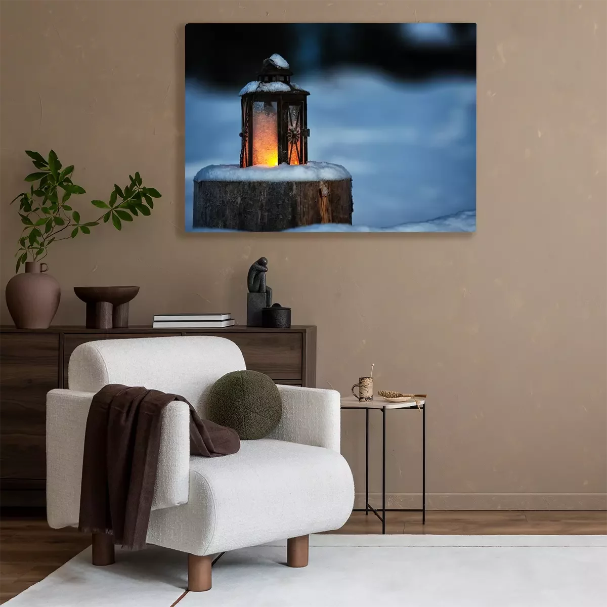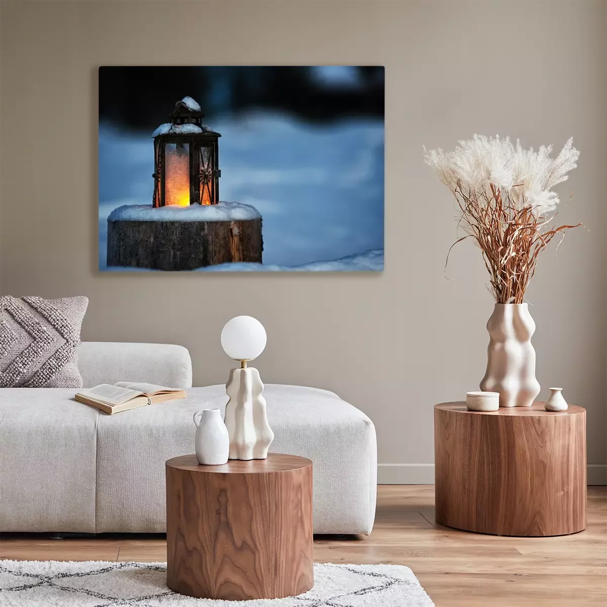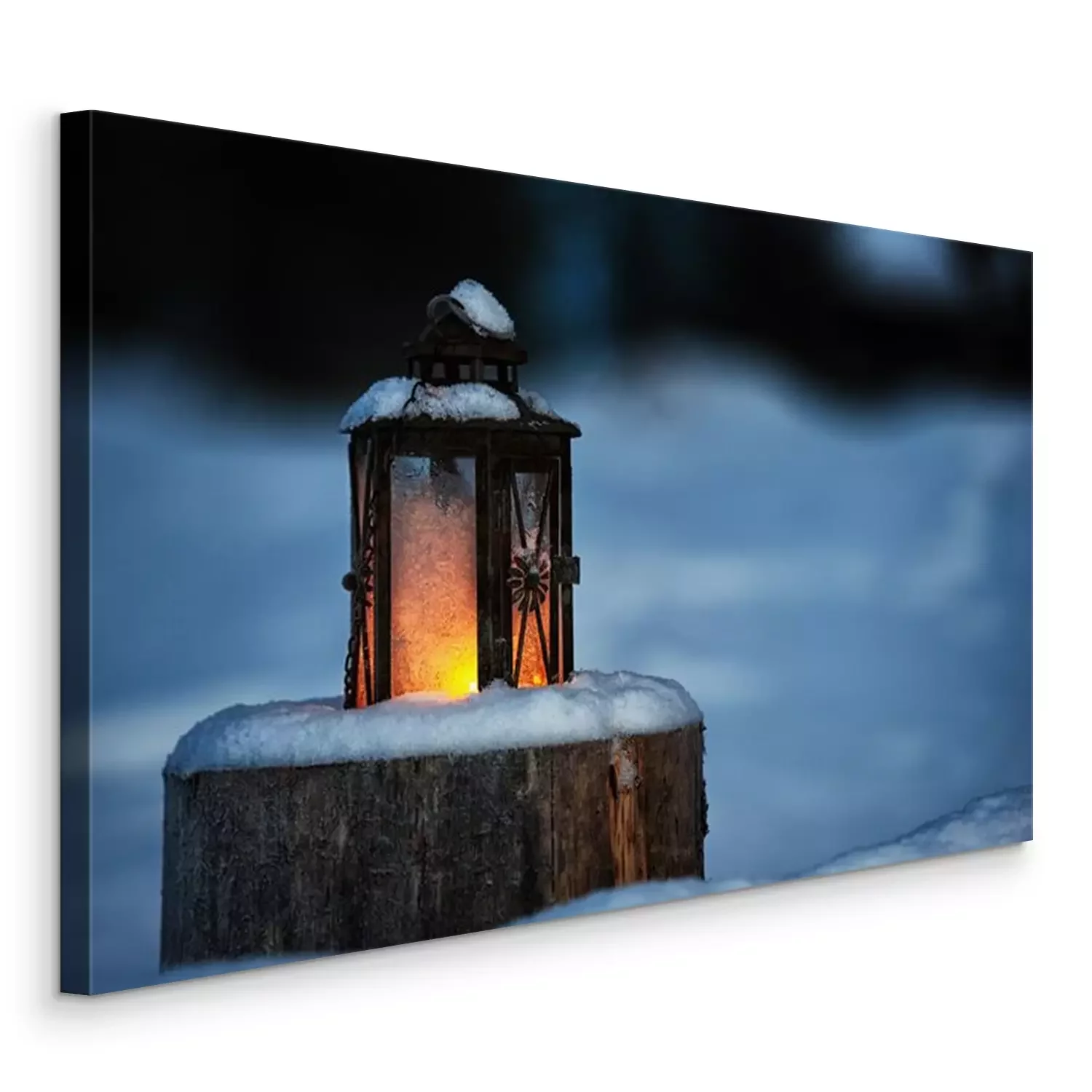 Lanterne à bougie dans la neige sur fond de forêt défocalisé.