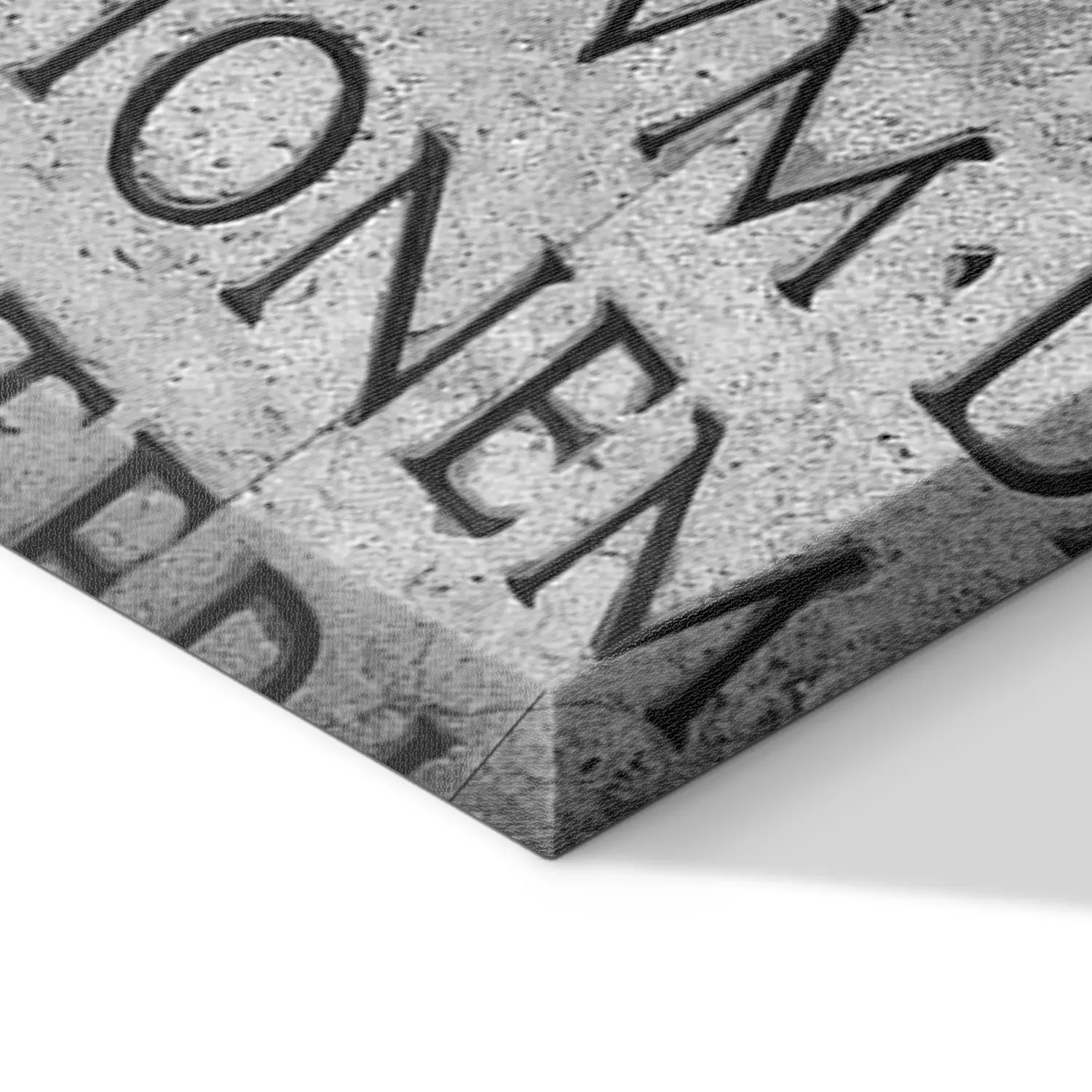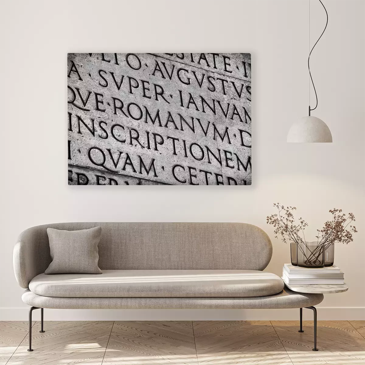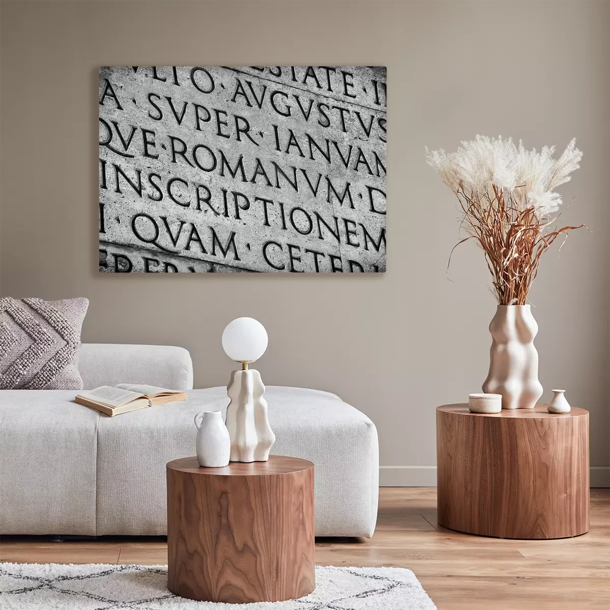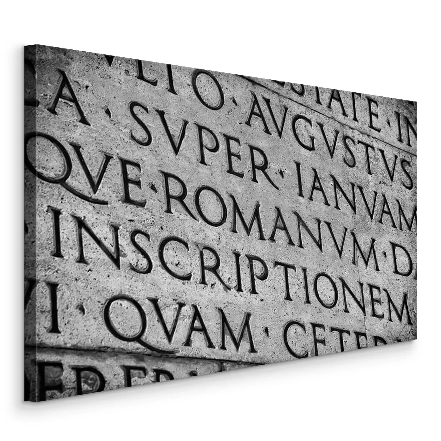 Tableau  Latin ancient language and classical education. Inscription from Emperor Augustus famous Res Gestae (1st century AD), with the word Romanum in the center (Black and White)