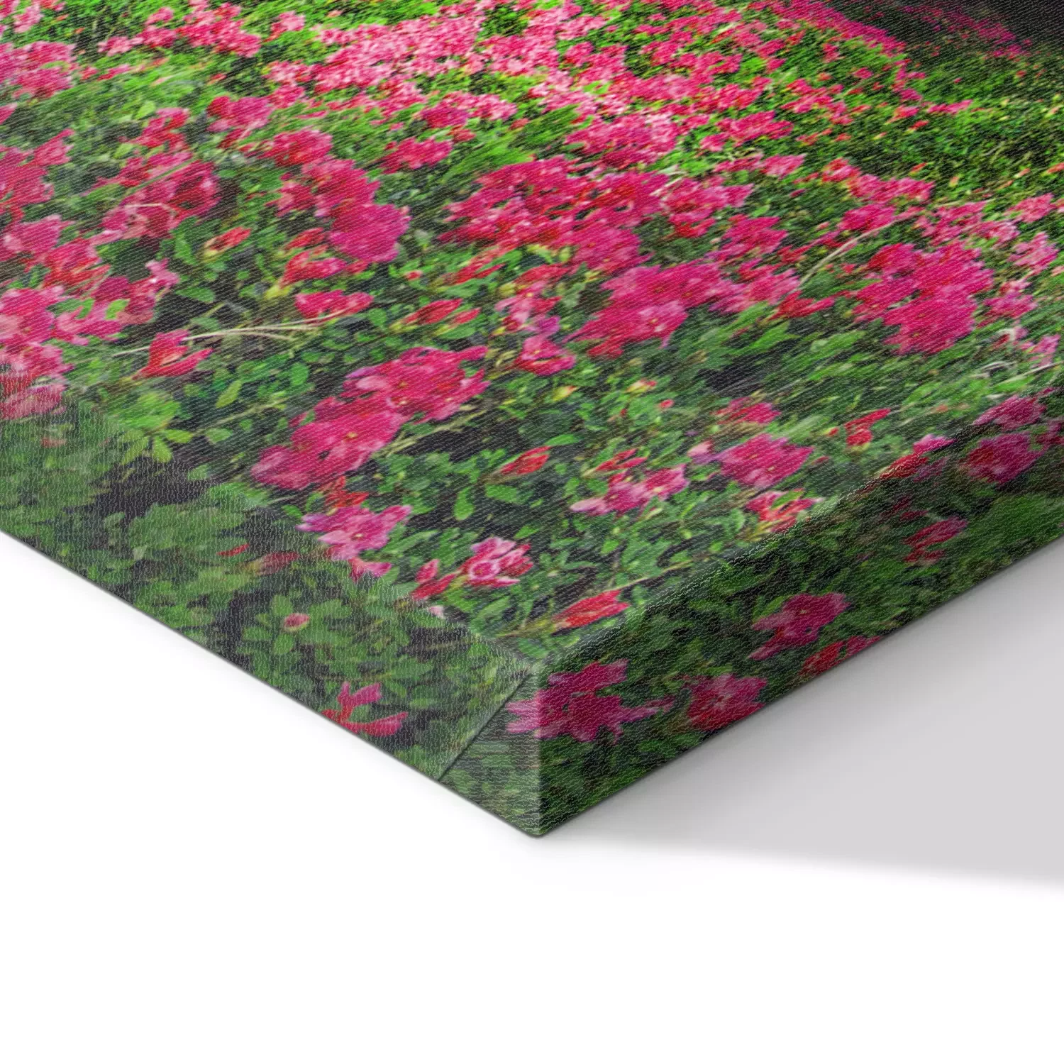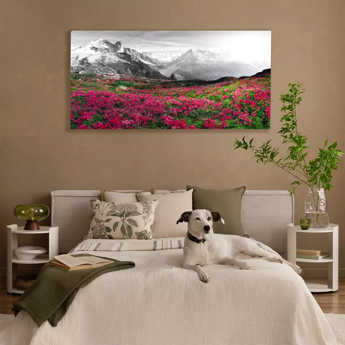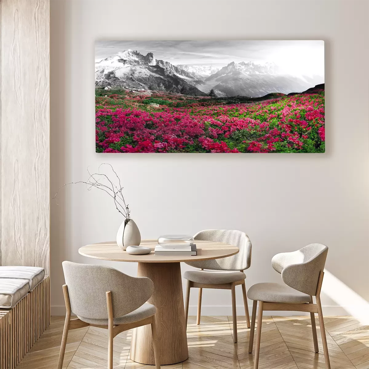 Le contraste entre les azalées roses et les montagnes noires et blanches