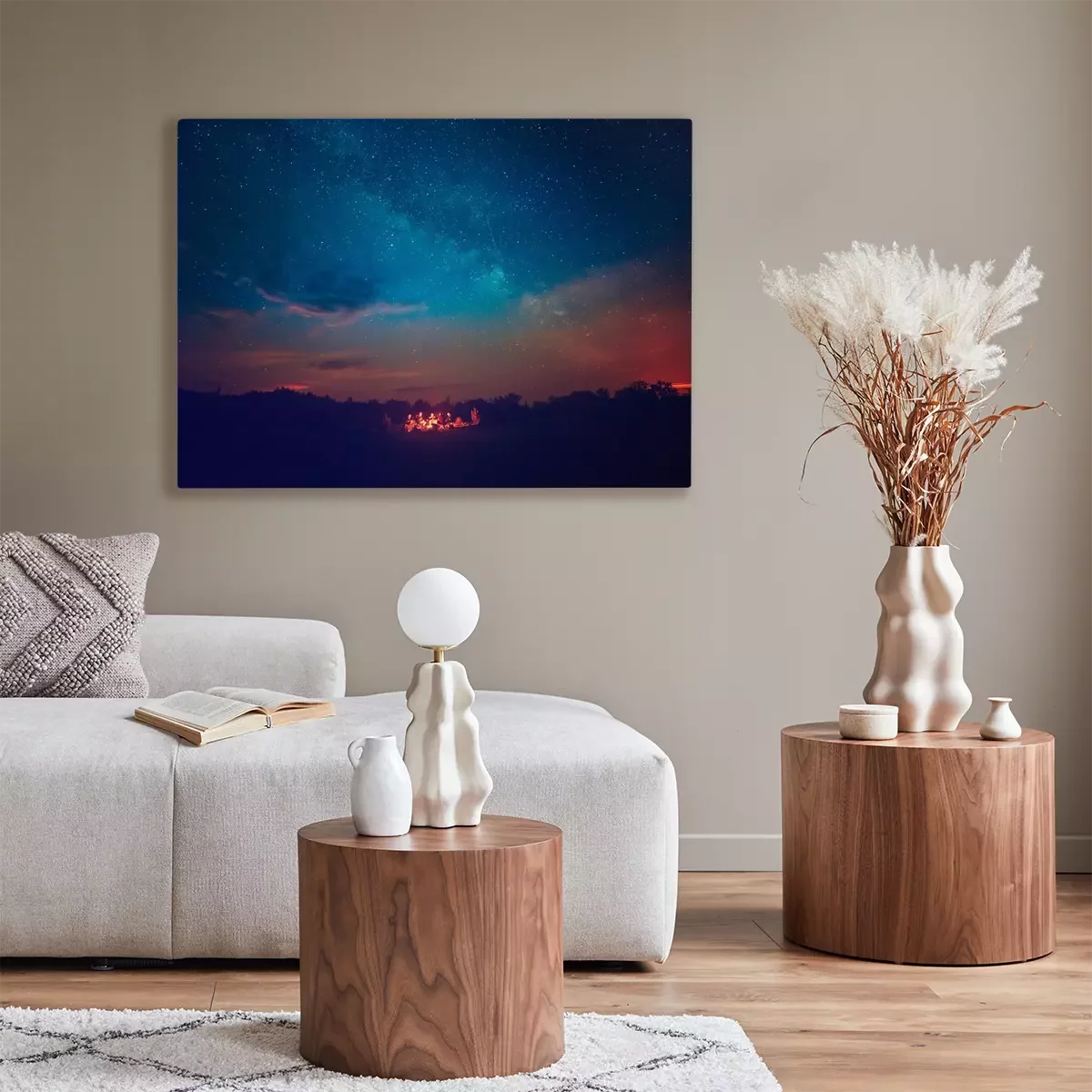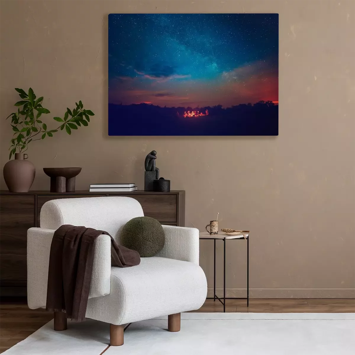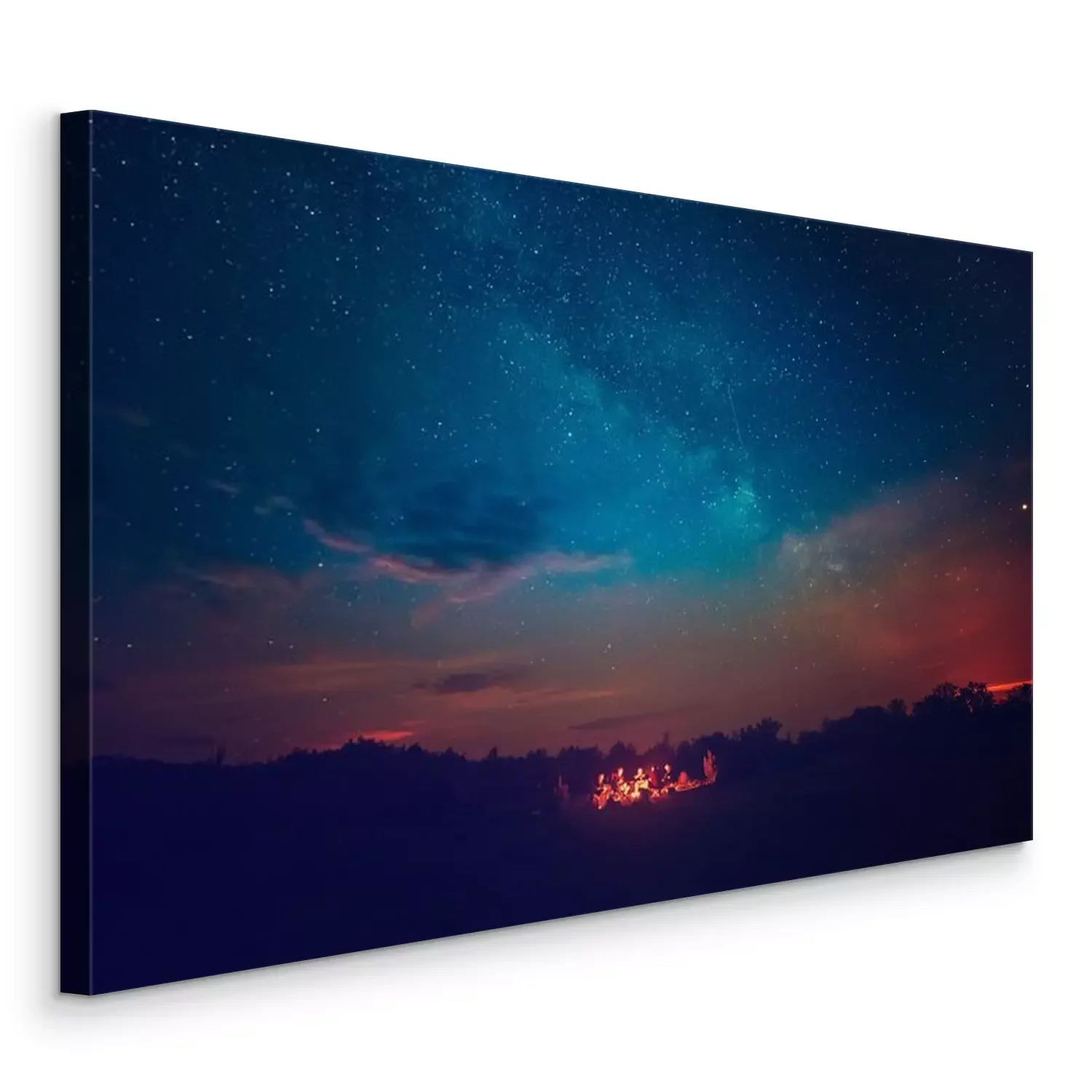 Tableau  Le feu de camping sous le ciel étoilé bleu étonnant avec beaucoup d'étoiles brillantes et de nuages. Voyage, récréatif, activité, concept.