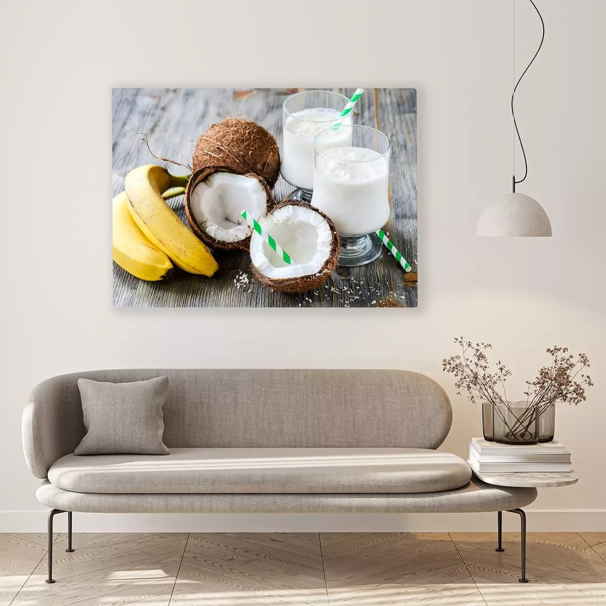 Tableau  Le lait de coco boisson smoothie avec des bananes sur fond de bois
