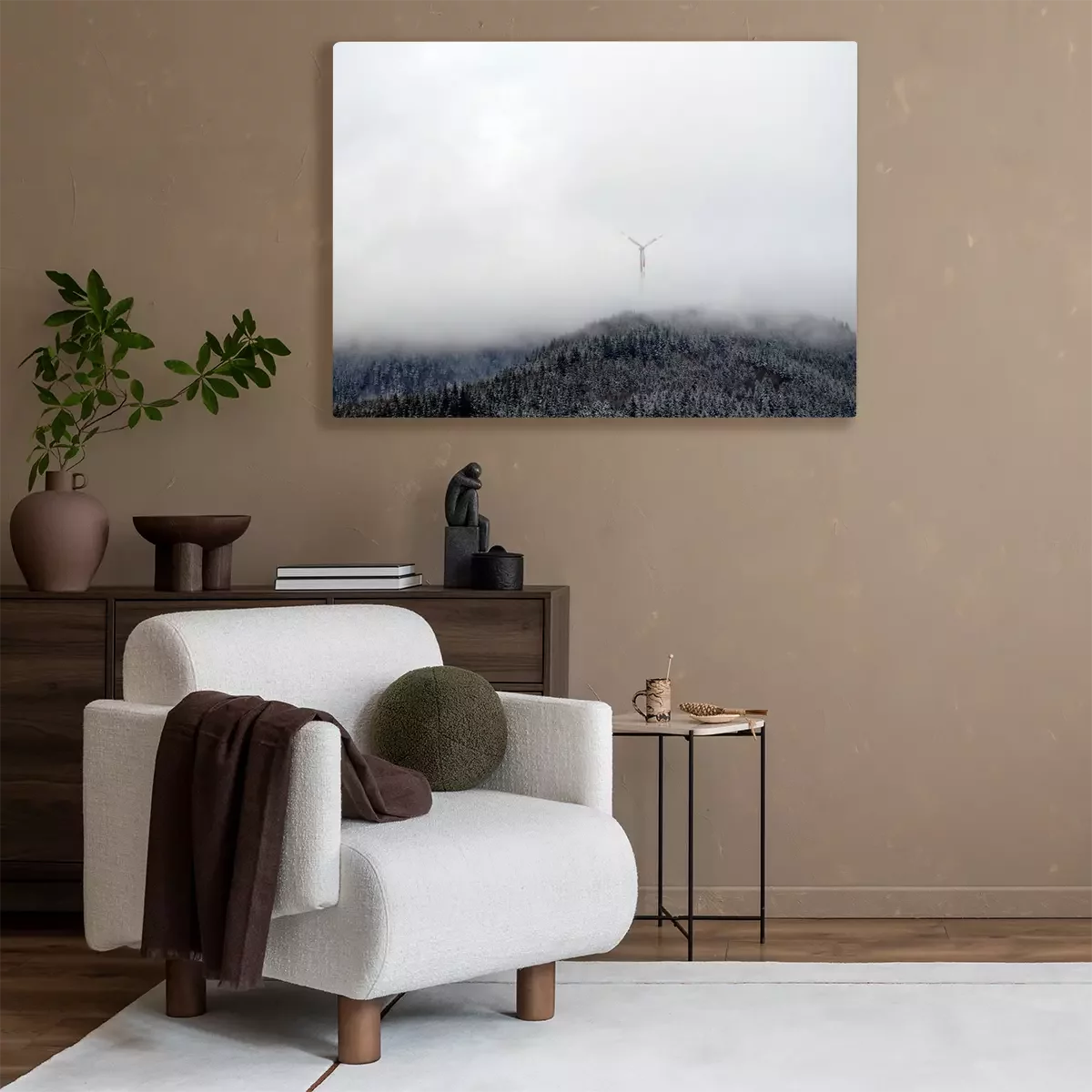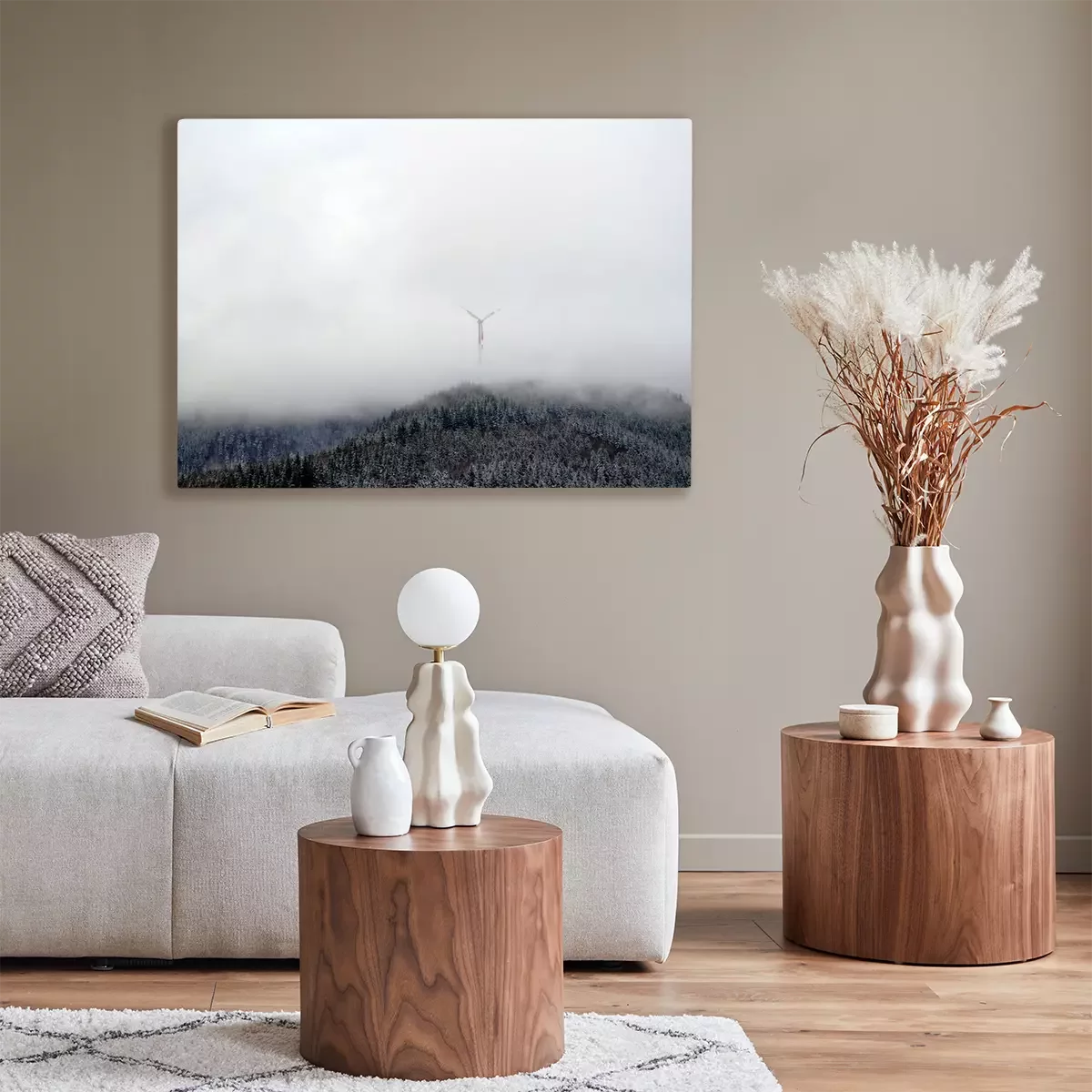 Tableau : Les éoliennes sur le tapis de raquette en bois dans le brouillard