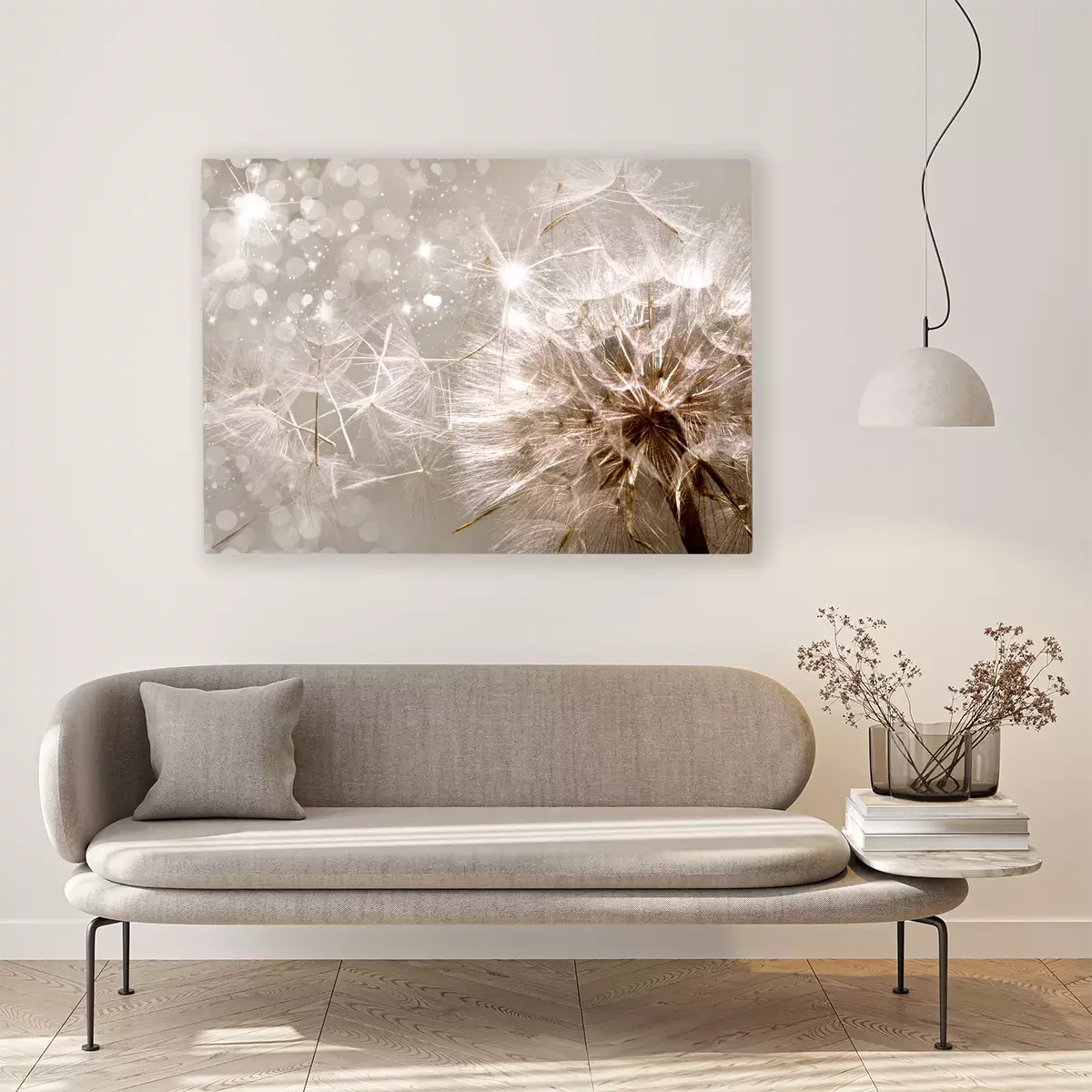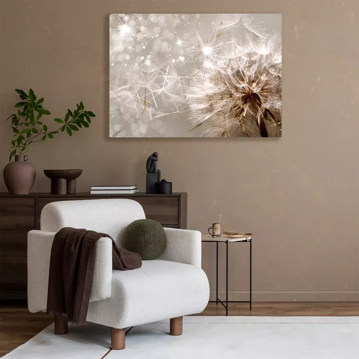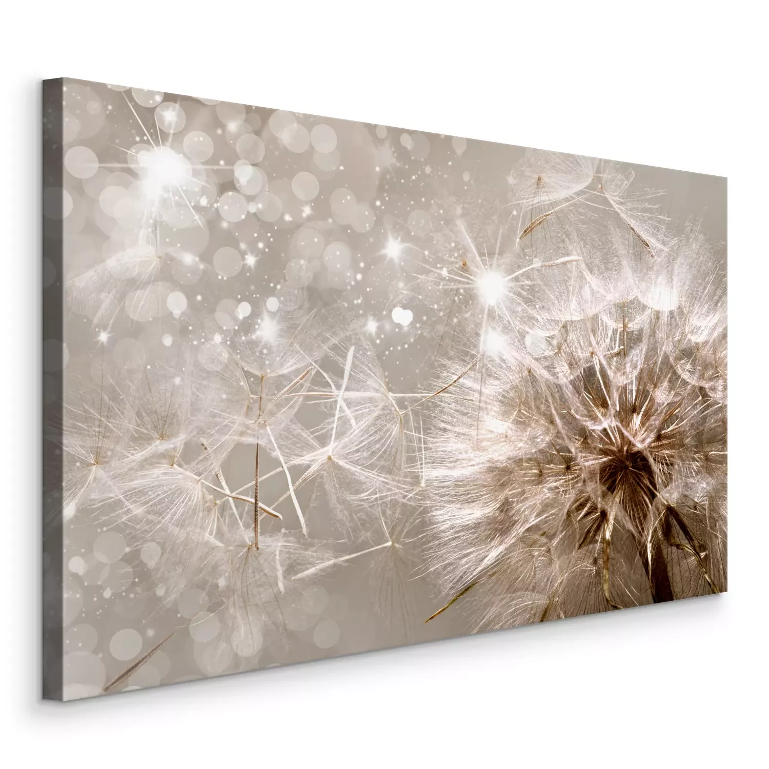 Les graines de pissenlit s'envolent dans la lueur et la lumière