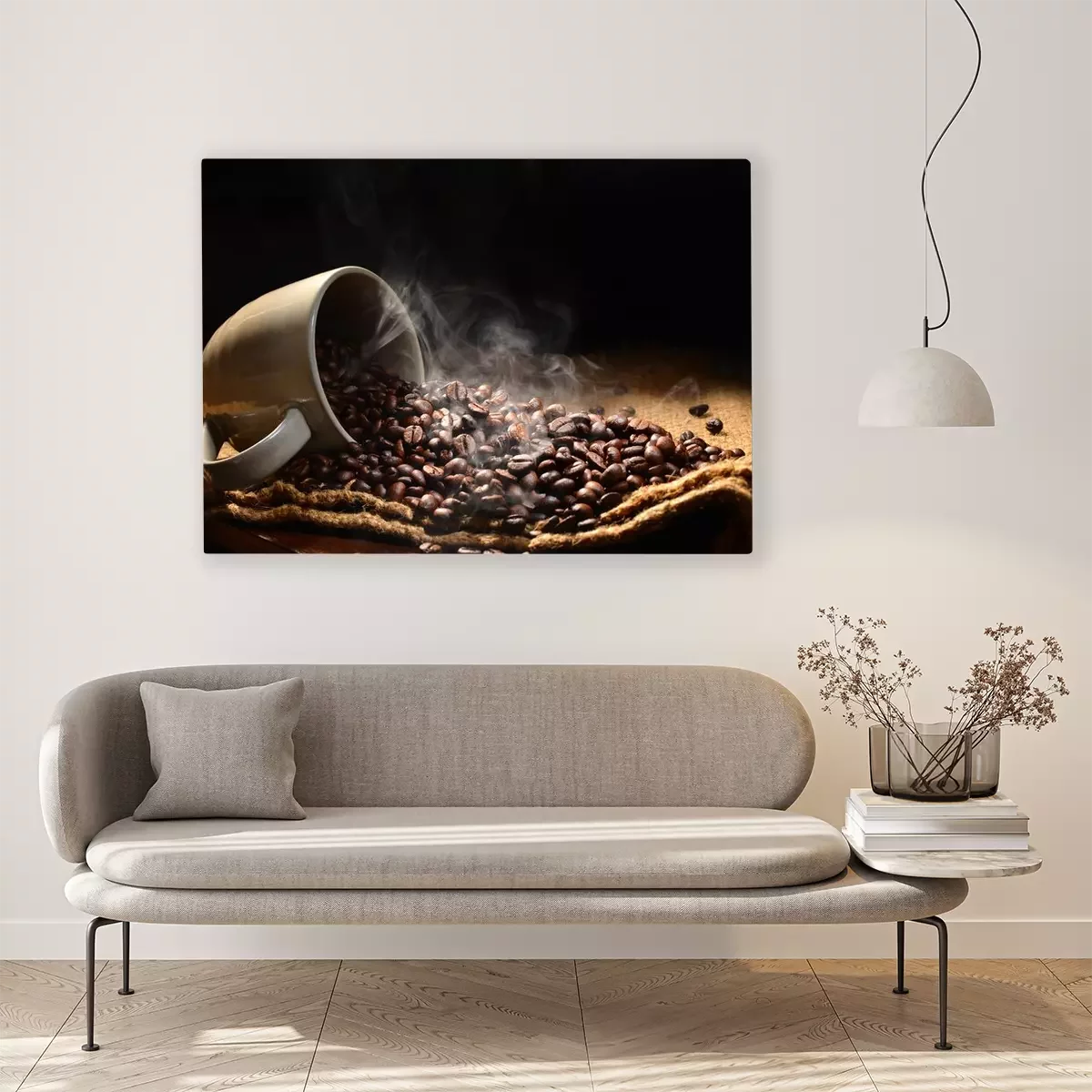 Tableau  Les grains de café avec de la fumée dans le café tasse
