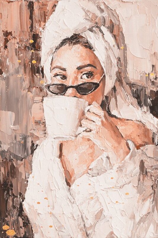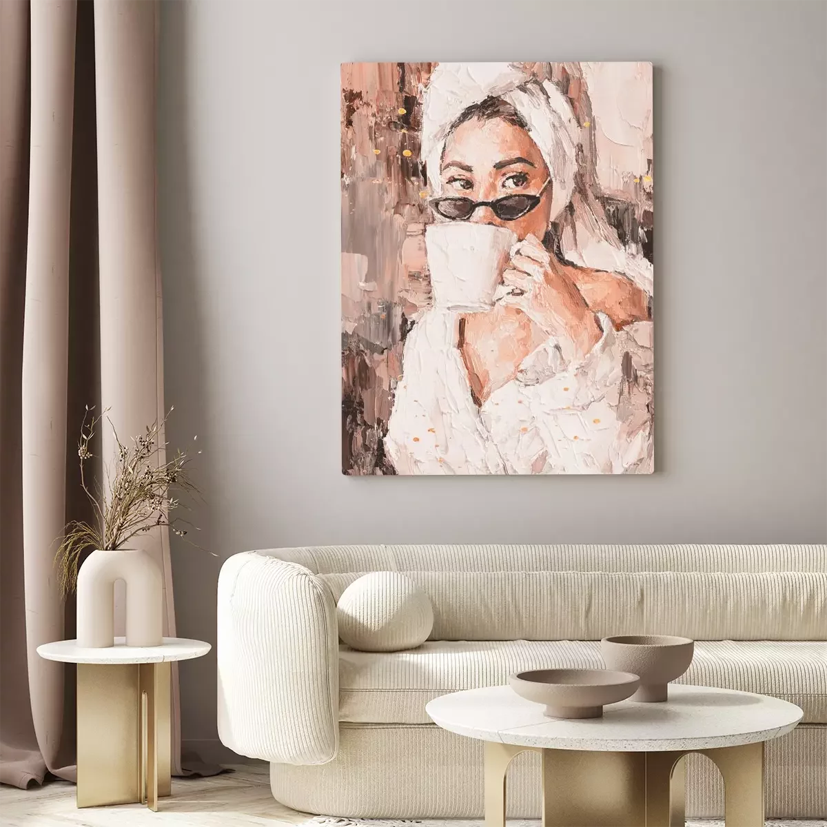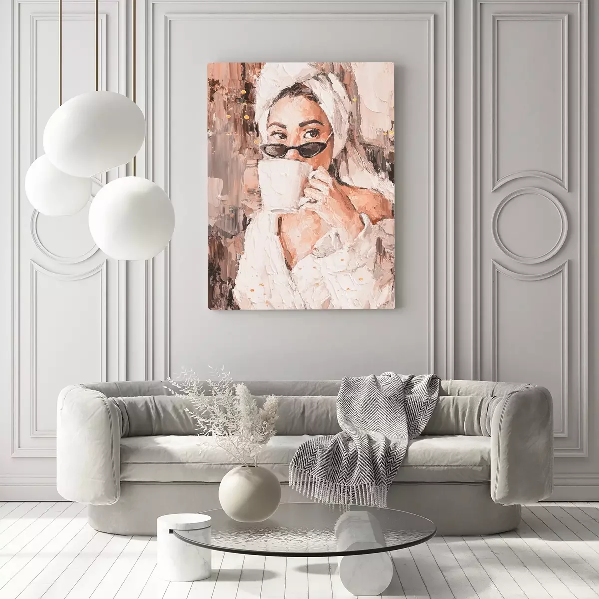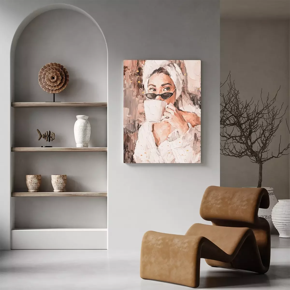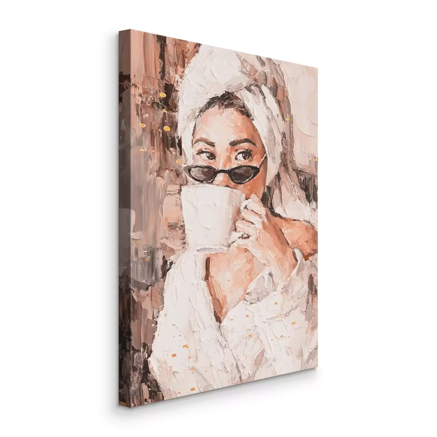 Tableau : Les instants matinaux d'une femme après un bain et un café