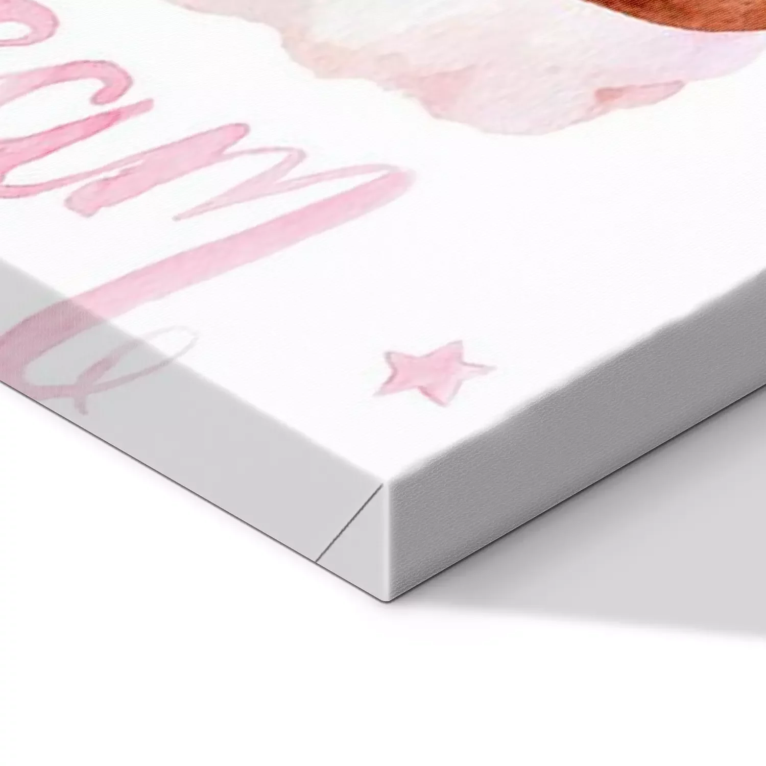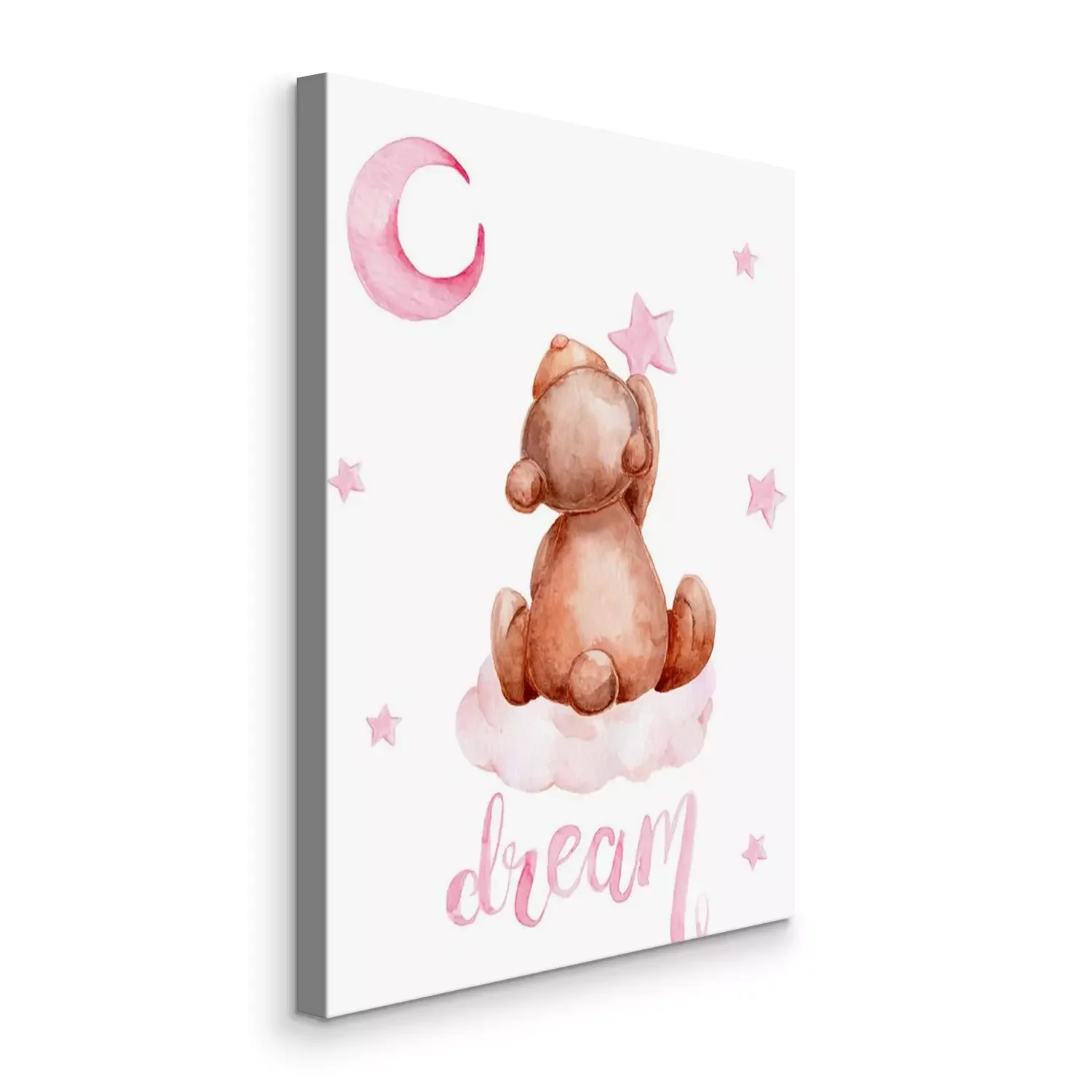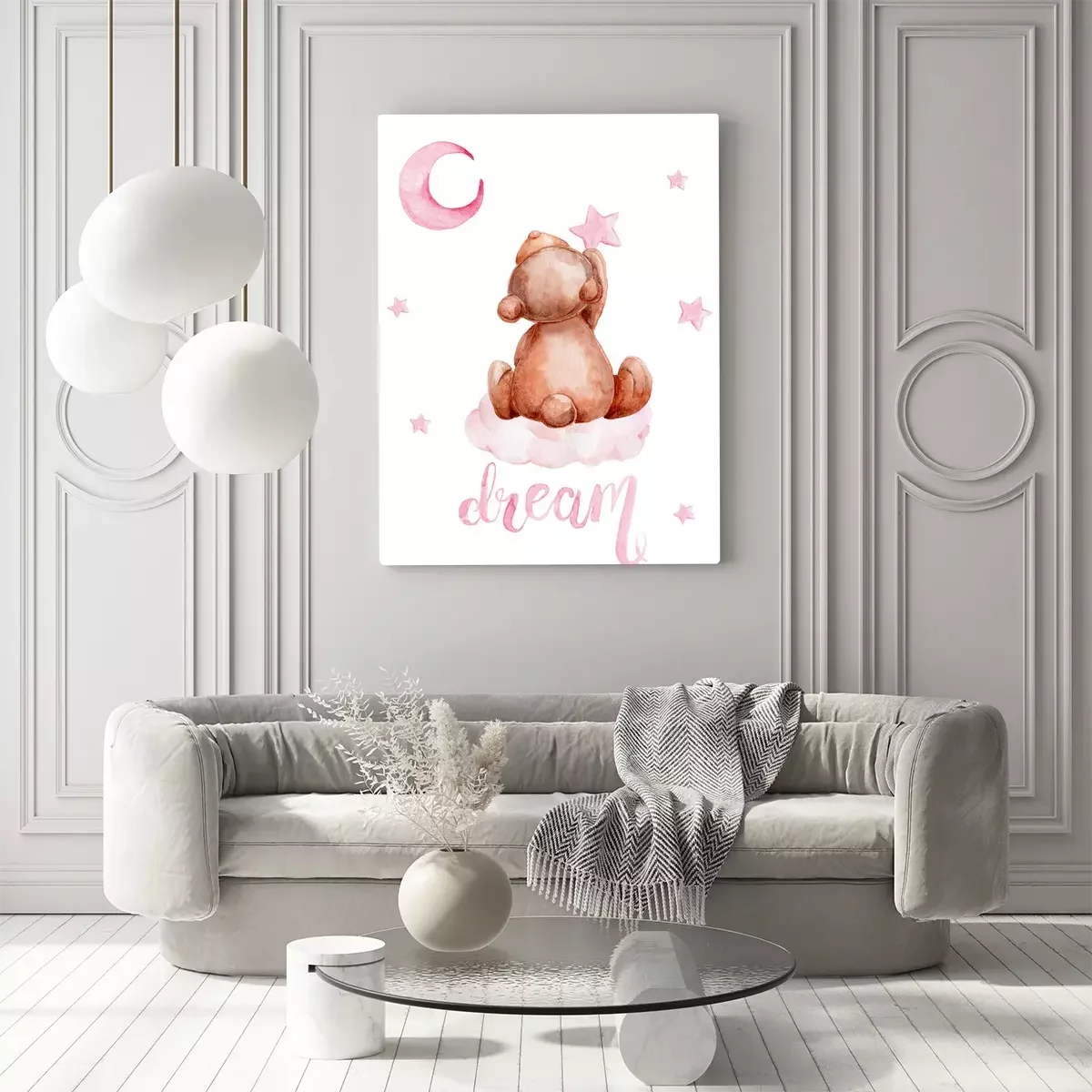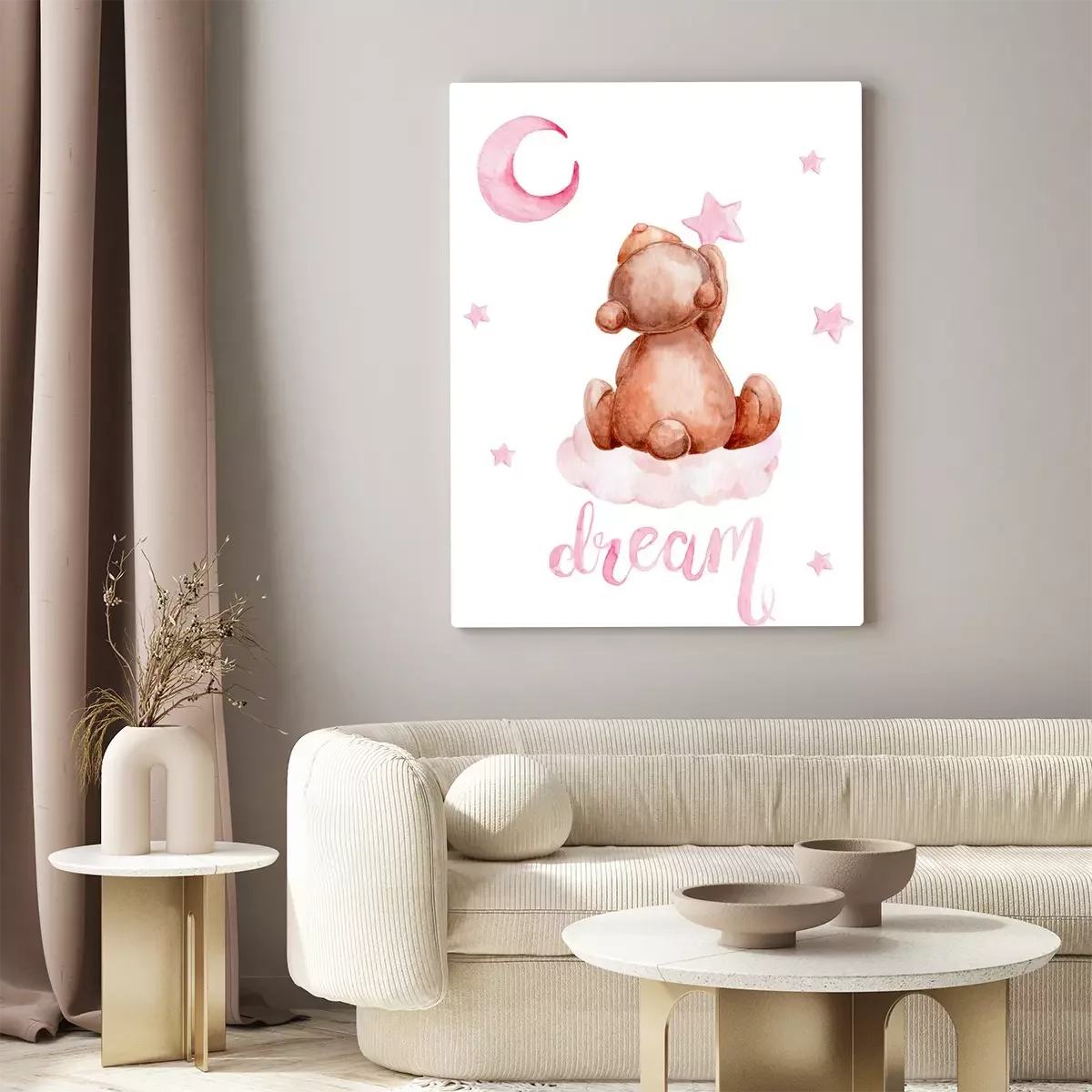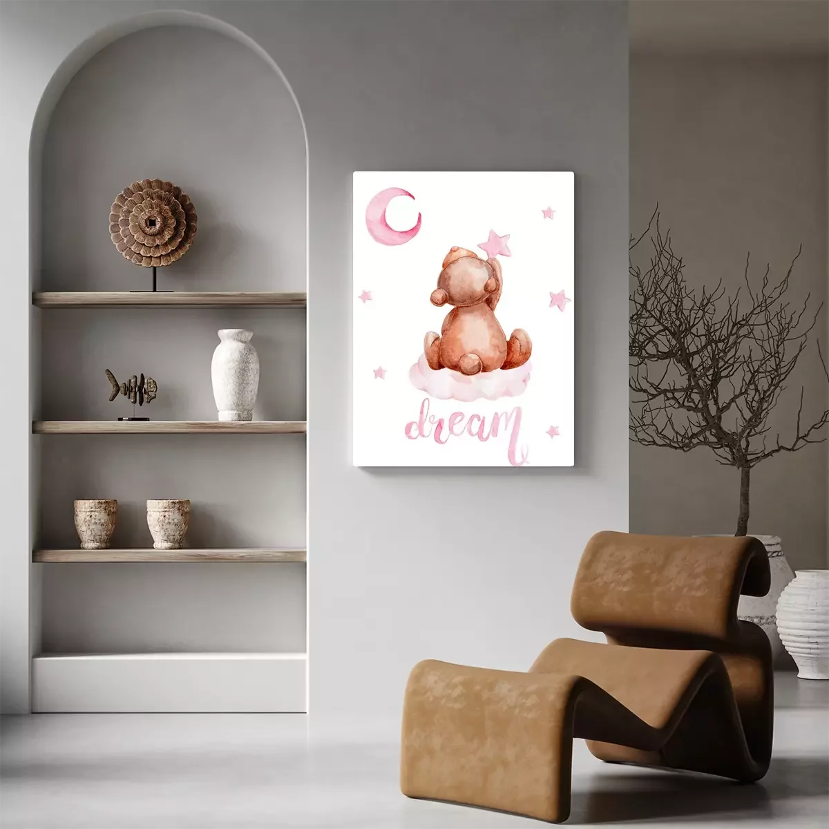 Tableau : Little brown teddy bear sitting on a cloud and moon and stars; watercolor hand draw illustration; with white isolated background