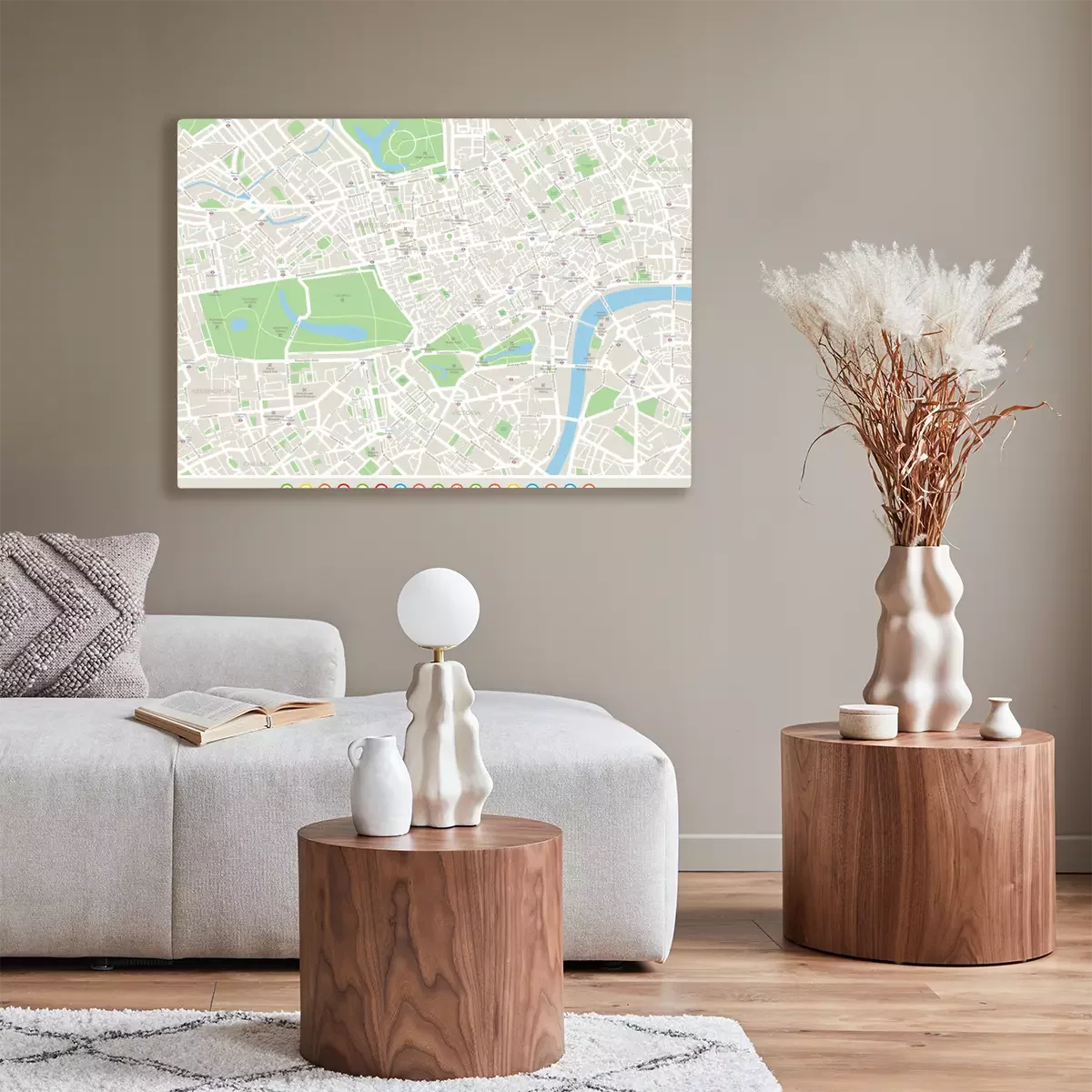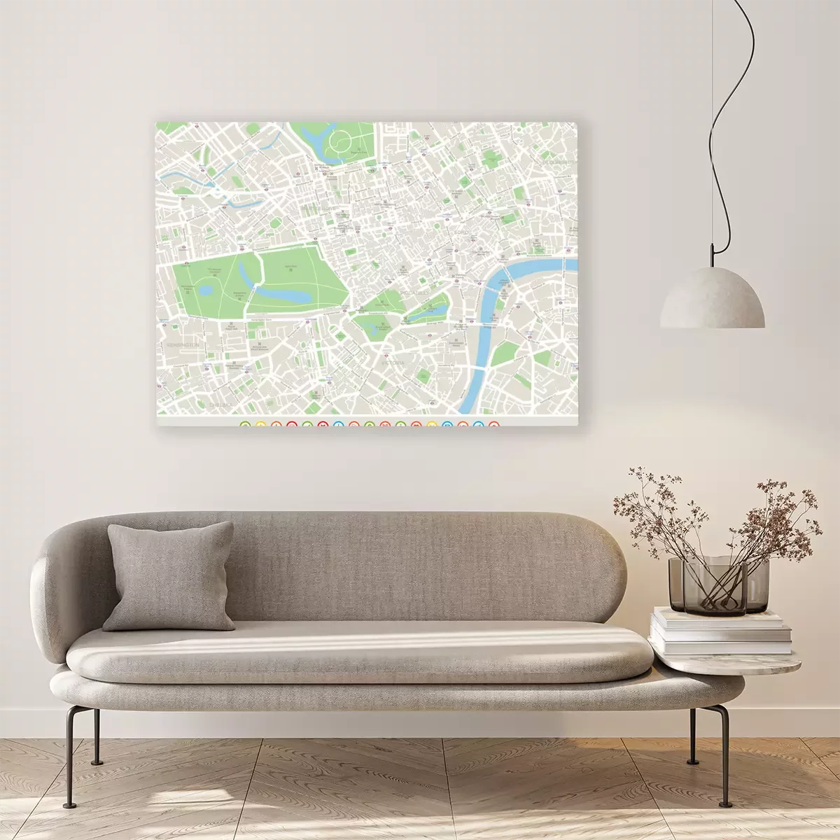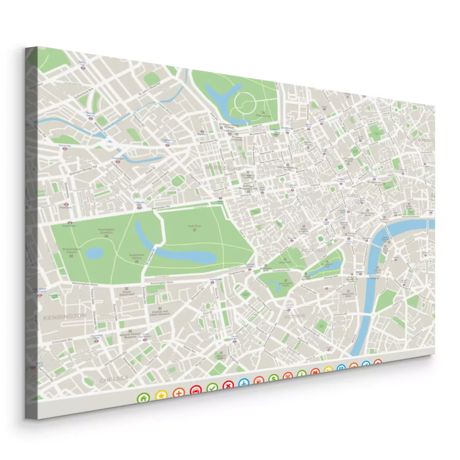 Tableau : Londres Carte et icônes de navigation. Plan comprend les rues, les parcs, les noms des sous-districts, points d'intérêt.