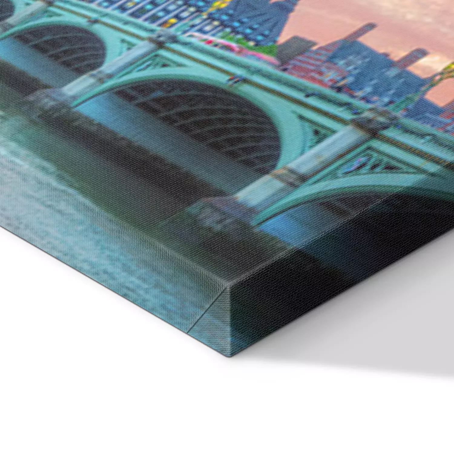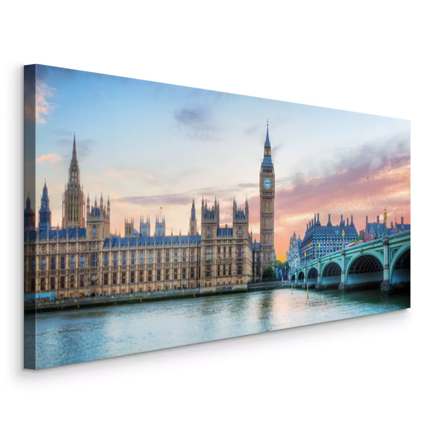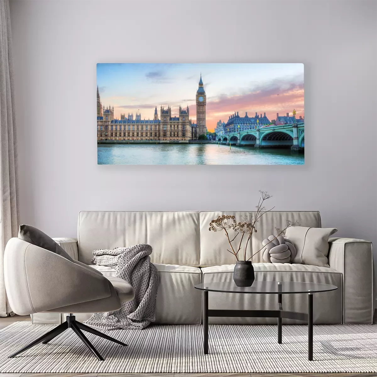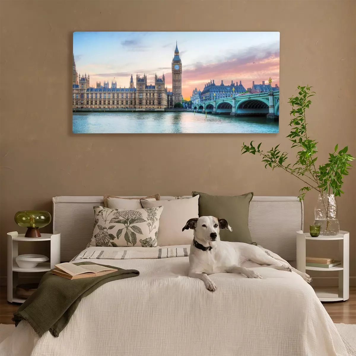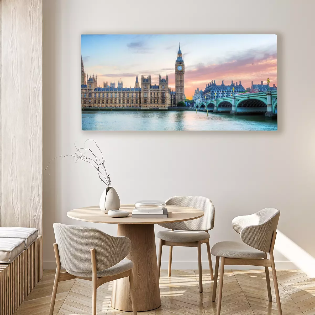 Tableau  Londres, Royaume-Uni panorama. Big Ben au Palais de Westminster sur la Tamise, au coucher du soleil