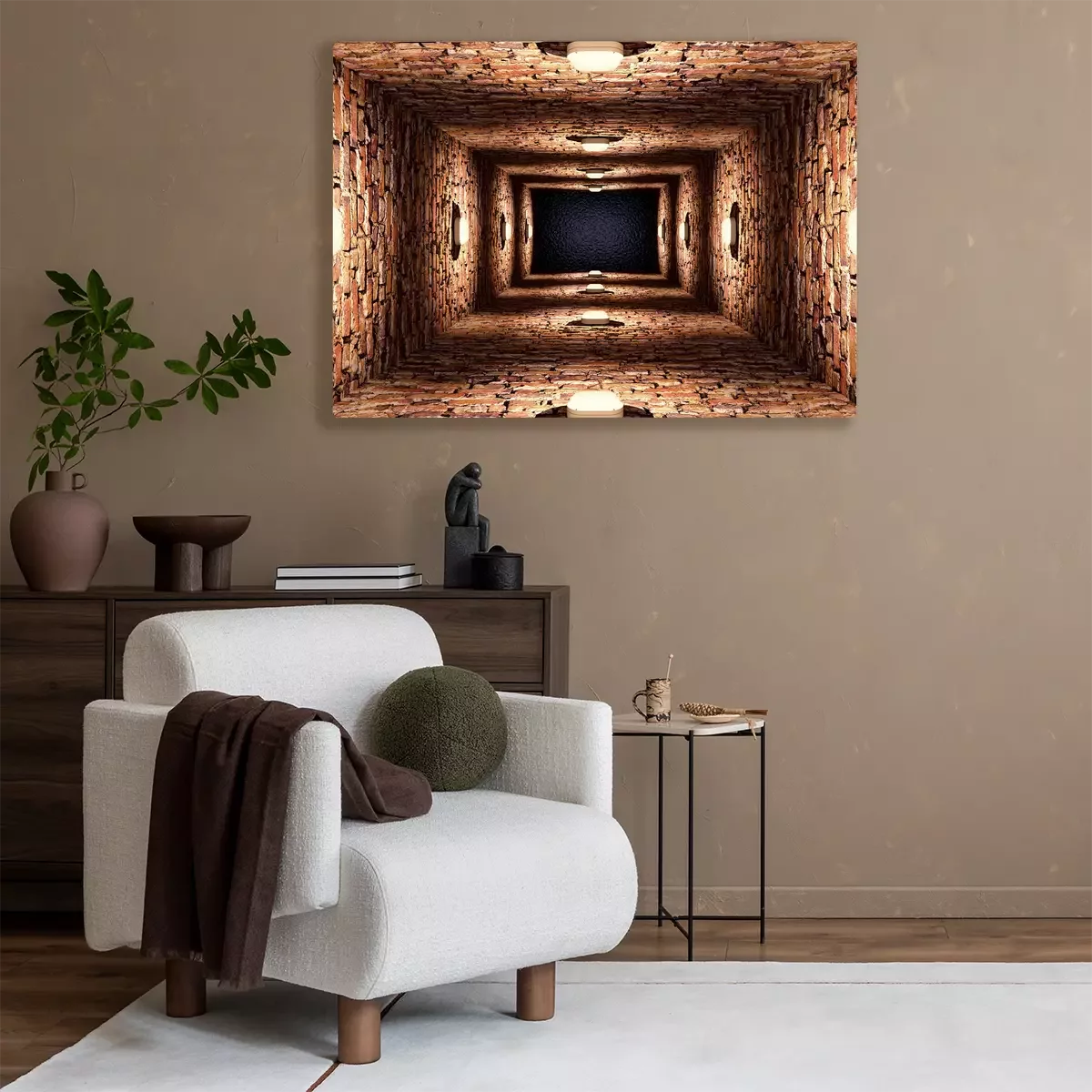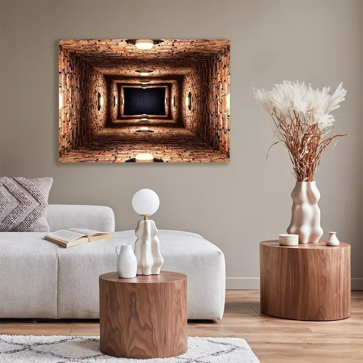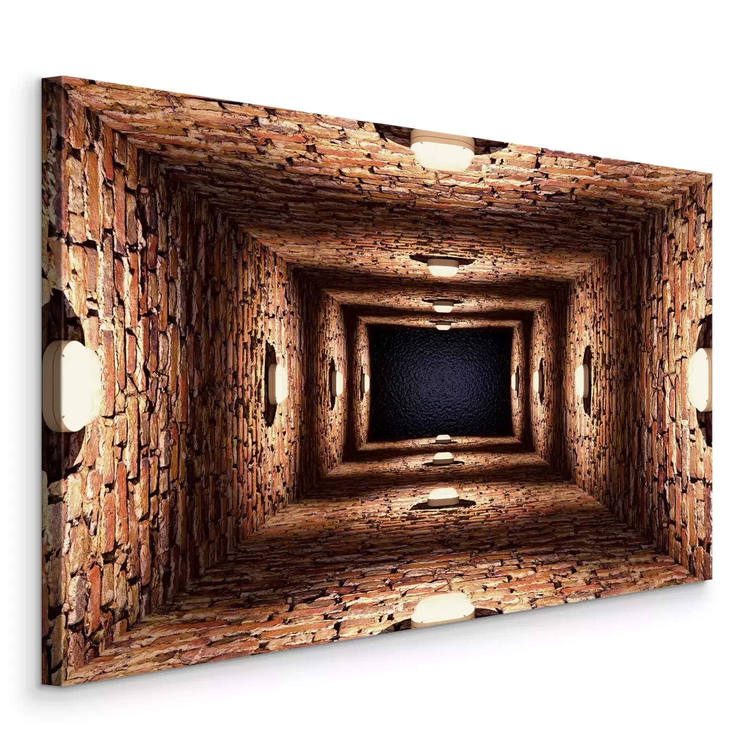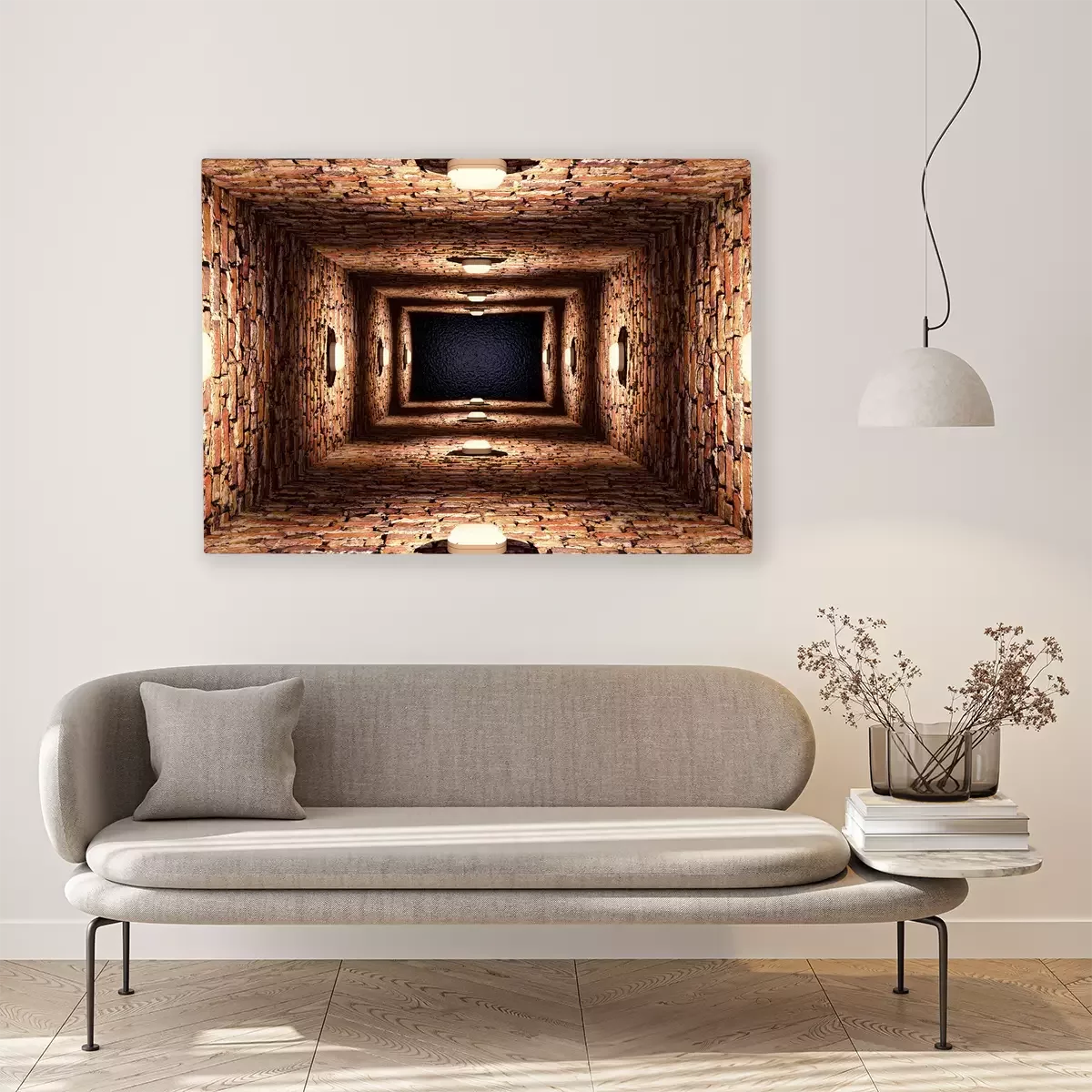 Long couloir en briques avec des lampes