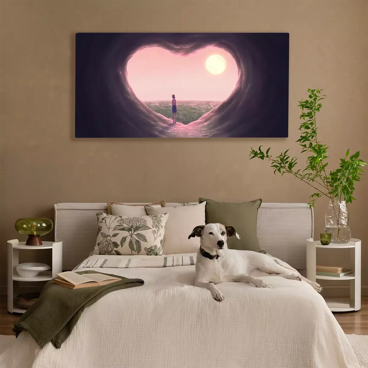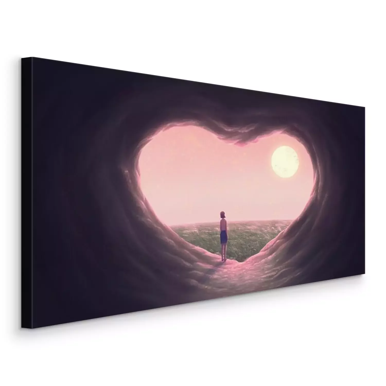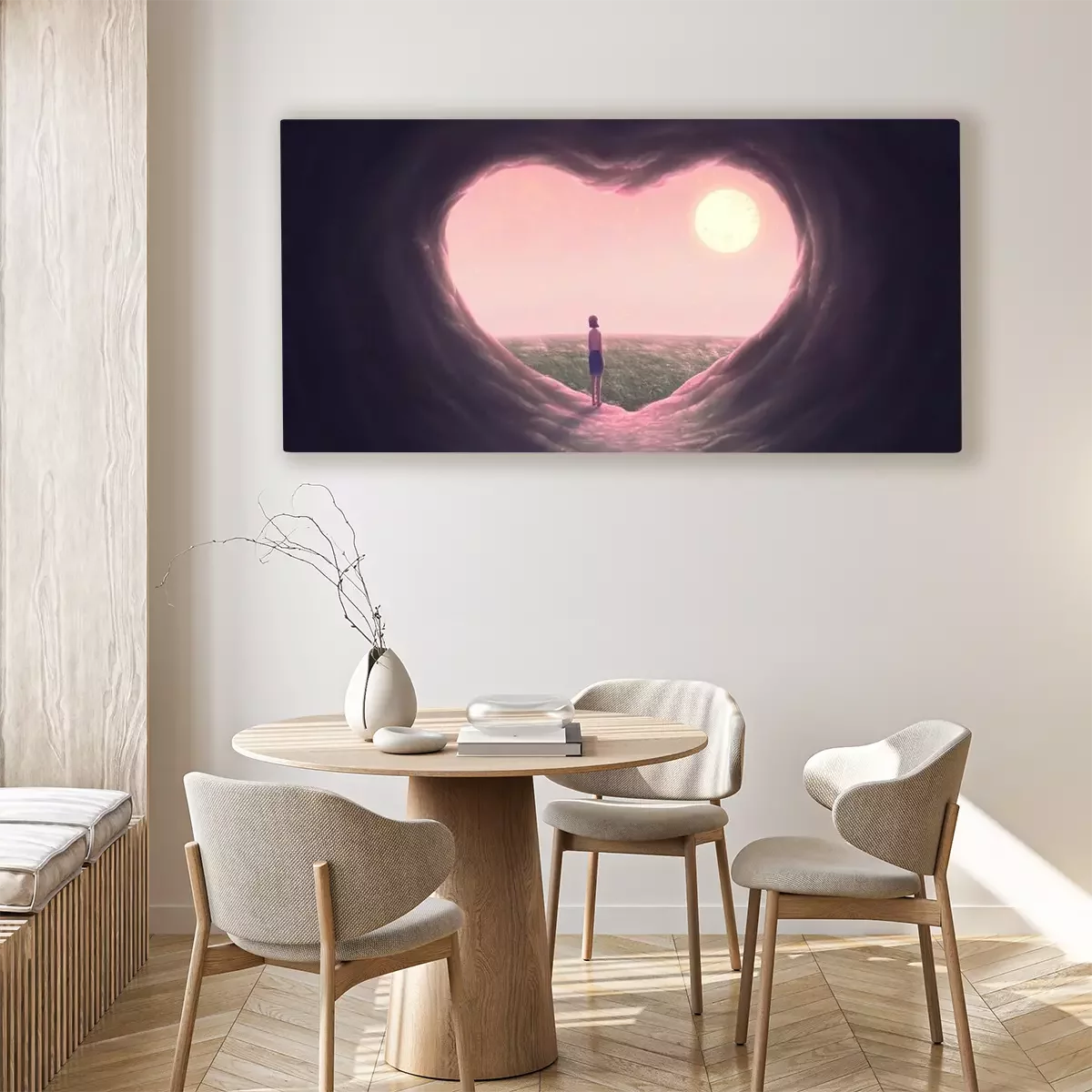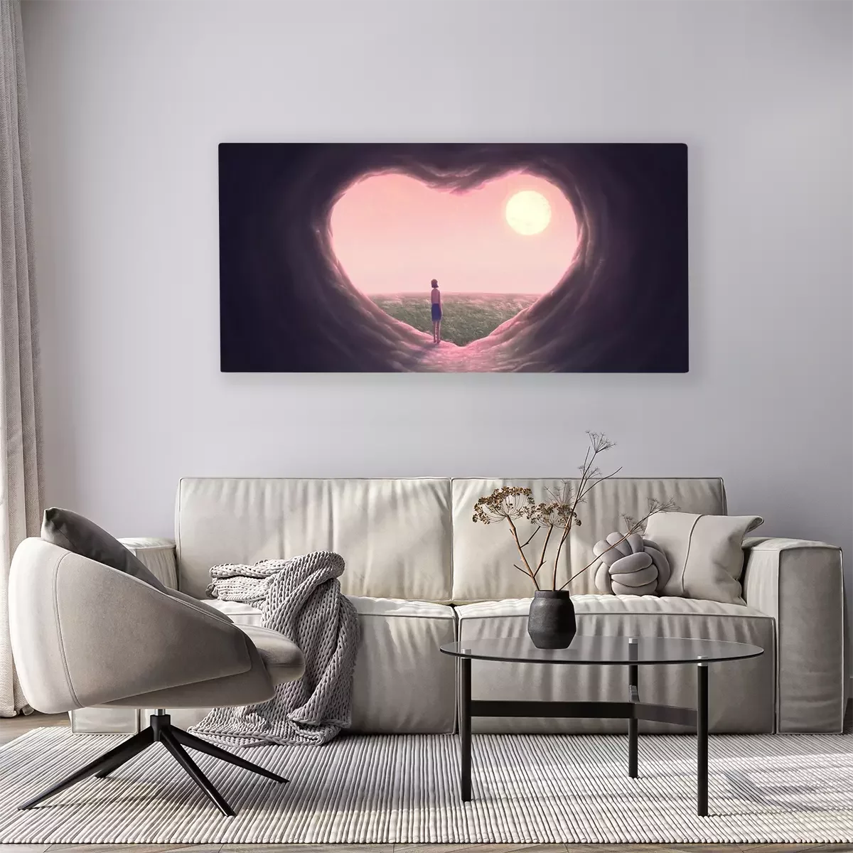 Tableau : Love concept art Floating woman with heart cave, imagination painting, 3d illustration, conceptual artwork, fantasy nature landscape