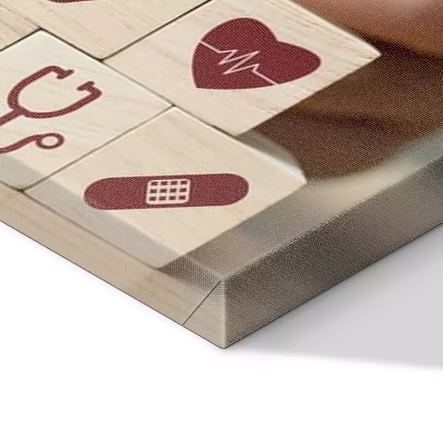 Tableau : Main organisant l'empilement de blocs de bois avec icône de soins de santé médical, assurance pour votre concept de santé